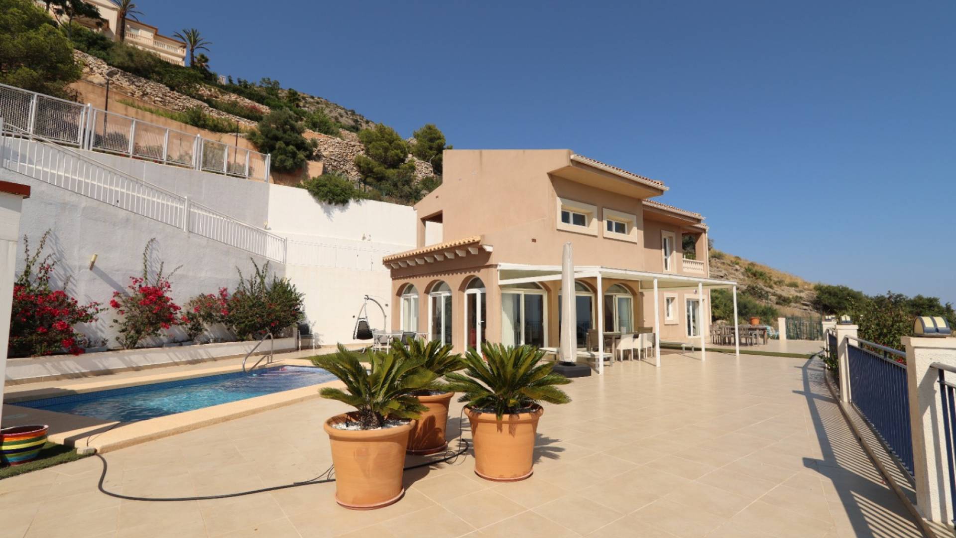 Dit charmante pand combineert de mediterrane stijl met een bevoorrechte omgeving.Op de begane grond vinden we een heldere keuken, een gezellige woonkamer-eetkamer, een gastentoilet, een slaapkamer met dressing en en-suite badkamer, en ook een berging.De bovenverdieping heeft twee slaapkamers die een complete badkamer delen, met een aparte toegang van buitenaf, wat flexibiliteit en comfort biedt.De villa beschikt over meerdere details:Panoramisch uitzicht op zeeGarage voor 2 auto'sZwembad, naya en barbecuegebiedDubbeld glas en rolluiken in de slaapkamersGebruik van gas voor verwarming en warm waterWordt volledig gemeubileerd verkochtGelegen op een groot perceel van 1.669 m², biedt de woning privacy, ruimte en de mogelijkheid tot uitbreiding om het bijvoorbeeld te transformeren in een Ibiza stijl villa van het dubbele van de huidige grootte. De huidige villa heeft al een oppervlakte van 255 m² en naast het huis met zijn enorme terras is er een natuurgebied dat kan worden gebruikt om verder te bouwen.Een unieke eigendom, met karakter en een enorm potentieel in een van de meest exclusieve gebieden van de Costa Blanca.