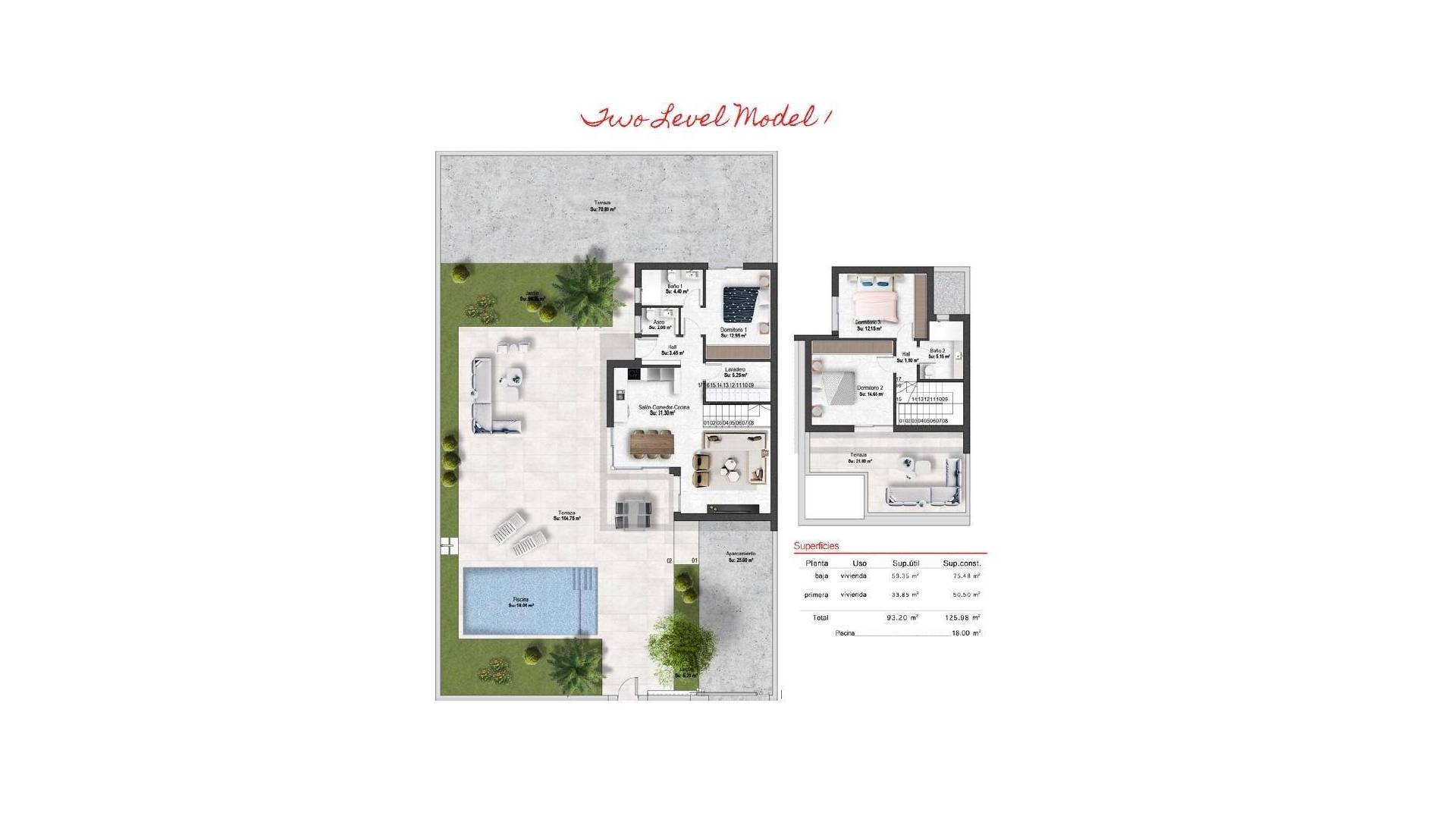 Nieuwbouwwilla’s in Altaona Golf Resort Murcia met privézwembad en uitzicht op de bergen Moderne villa’s in Altaona Golf Resort Murcia Ontdek een exclusief nieuwbouwproject met moderne villa’s in Altaona Golf Resort, een van de meest aantrekkelijke woonwijken in Murcia. Dit beveiligde golfresort, omgeven door natuurschoon en bergen, biedt een rustige omgeving en ligt toch op slechts een klein eindje rijden van de stad Murcia en de Middellandse Zeekust. Deze nieuwbouwwilla's zijn ontworpen om comfort, privacy en een ontspannen mediterrane levensstijl te bieden. Het project biedt een selectie van gelijkvloerse villa's met een optioneel solarium of villa's met twee verdiepingen, allemaal voorzien van drie slaapkamers en twee badkamers, inclusief een hoofdslaapkamer met en-suite badkamer. Ruim ontwerp met privétuinen en zwembad Elke villa is gebouwd op een privéterrein vanaf 300 m², met voldoende buitenruimte om het hele jaar door van de zon te genieten. De woningen beschikken over een privézwembad, aangelegde tuinen en parkeergelegenheid op het terrein. De indeling is ontworpen om het natuurlijke licht te maximaliseren en een naadloze verbinding te creëren tussen binnen- en buitenleven. De open woon- en eetruimtes sluiten direct aan op het terras en het zwembad, waardoor de perfecte omgeving ontstaat om te ontspannen of familie en vrienden te ontvangen. Hoogwaardige afwerking en moderne voorzieningen Deze villa's zijn gebouwd met hoogwaardige materialen en moderne bouwtechnieken om comfort en energie-efficiëntie te garanderen. Tot de voorzieningen behoren een versterkte veiligheidsdeur, een volledig ingerichte keuken met apparatuur, vloerverwarming in de badkamers en een LED-verlichtingspakket voor het interieur. Bijkomende specificaties zijn onder meer de voorbereiding voor airconditioning via luchtkanalen en warmwatervoorziening via een energiezuinig aerothermisch systeem, wat zowel duurzaamheid als kostenbesparingen oplevert. Toplocatie dicht bij golf, stad en kust Altaona Golf Resort staat bekend om zijn 18-holes golfbaan, rustige omgeving en uitstekende beveiliging, waardoor het ideaal is voor zowel permanente bewoning als vakantiehuizen. Het resort biedt een unieke combinatie van natuur, sport en de nabijheid van belangrijke bestemmingen. Het centrum van Murcia ligt op slechts 15 km afstand en biedt een breed scala aan winkels, restaurants, culturele bezienswaardigheden en voorzieningen. De stranden van de Mar Menor en de Middellandse Zeekust liggen op ongeveer 20 km afstand, perfect om te genieten van zonnige dagen aan zee. Andere belangrijke afstanden zijn onder meer de luchthaven Murcia-Corvera op 15 km, de stad Cartagena op 35 km en verschillende golfbanen op korte rijafstand, waardoor dit een ideale locatie is voor golfliefhebbers en internationale kopers. Ideale investering en kans op een mediterrane levensstijl Deze nieuwbouwwilla's in Altaona Golf Resort bieden een uitstekende kans om te genieten van een hoogwaardige levensstijl in een natuurlijke en veilige omgeving, met gemakkelijke toegang tot zowel de stad als de kust. Neem vandaag nog contact met ons op voor meer informatie of om een bezichtiging te regelen en ontdek uw nieuwe thuis in Murcia.
