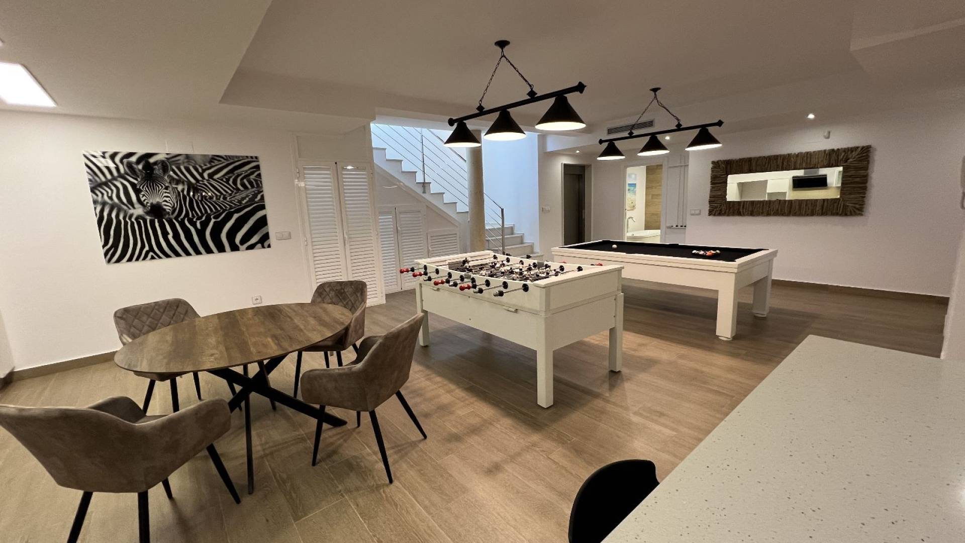 Deze luxe moderne villa beslaat drie verdiepingen en beschikt over 5 slaapkamers en 4 badkamers, met een prachtige glazen trap met ingebouwde led-accentverlichting en een handige commerciële lift die alle verdiepingen naadloos met elkaar verbindt. Het pand ligt in de wijk Las Comunicaciones, op een heuvel en biedt een prachtig open uitzicht op het zoutmeer en de kustlijn daarachter. Het is slechts 2-3 minuten rijden naar het stadscentrum van San Miguel de Salinas, terwijl Villamartin / Orihuela Costa slechts 7 minuten verderop liggen, waardoor alle voorzieningen en attracties van de Costa Blanca Zuid-kustlijn gemakkelijk bereikbaar zijn. De villa beschikt over 5 slaapkamers en 4 badkamers, verdeeld over twee verdiepingen en een XL-kelder. De villa wordt gemeubileerd verkocht. De begane grond verwelkomt u met een open conceptontwerp met een eersteklas keuken met centraal kookeiland, een ruime eethoek, een grote woonkamer met uitzicht op het zwembad en een aparte wasruimte naast de keuken met opbergruimte. Ook op dit niveau vindt u de hoofdslaapkamer met uitzicht op het zwembad, deze ruimte straalt stijl en comfort uit en omvat een grote en-suite badkamer en inloopkast/kleedkamer. De kelder is ontworpen voor entertainment, met een tweede volledige keuken met ontbijtbar, grote woon-/thuisbioscoopkamer, 2 slaapkamers, 1 badkamer met bad en grote berging/wijnkelder. Boven vindt u nog eens 2 en-suite slaapkamers, beide met toegang tot het terras en toegang tot het solarium. Alle niveaus met fantastisch open uitzicht. De tuin beschikt over een BBQ/buitenkeuken, privézwembad met waterval. Genoeg parkeergelegenheid buiten de straat op dit afgesloten beveiligde privéperceel. Neem vandaag nog contact met ons op voor meer informatie en om een ​​bezichtiging te boeken voor deze zeer speciale luxe familievilla!