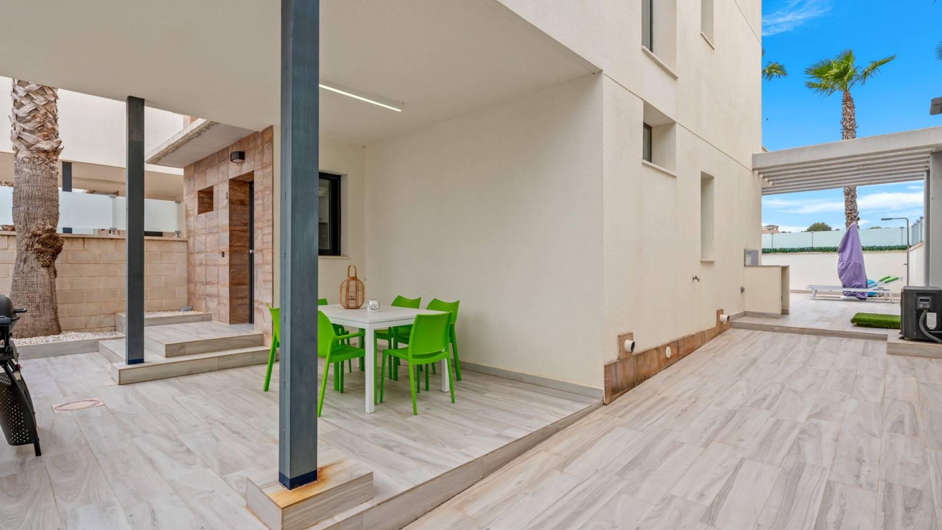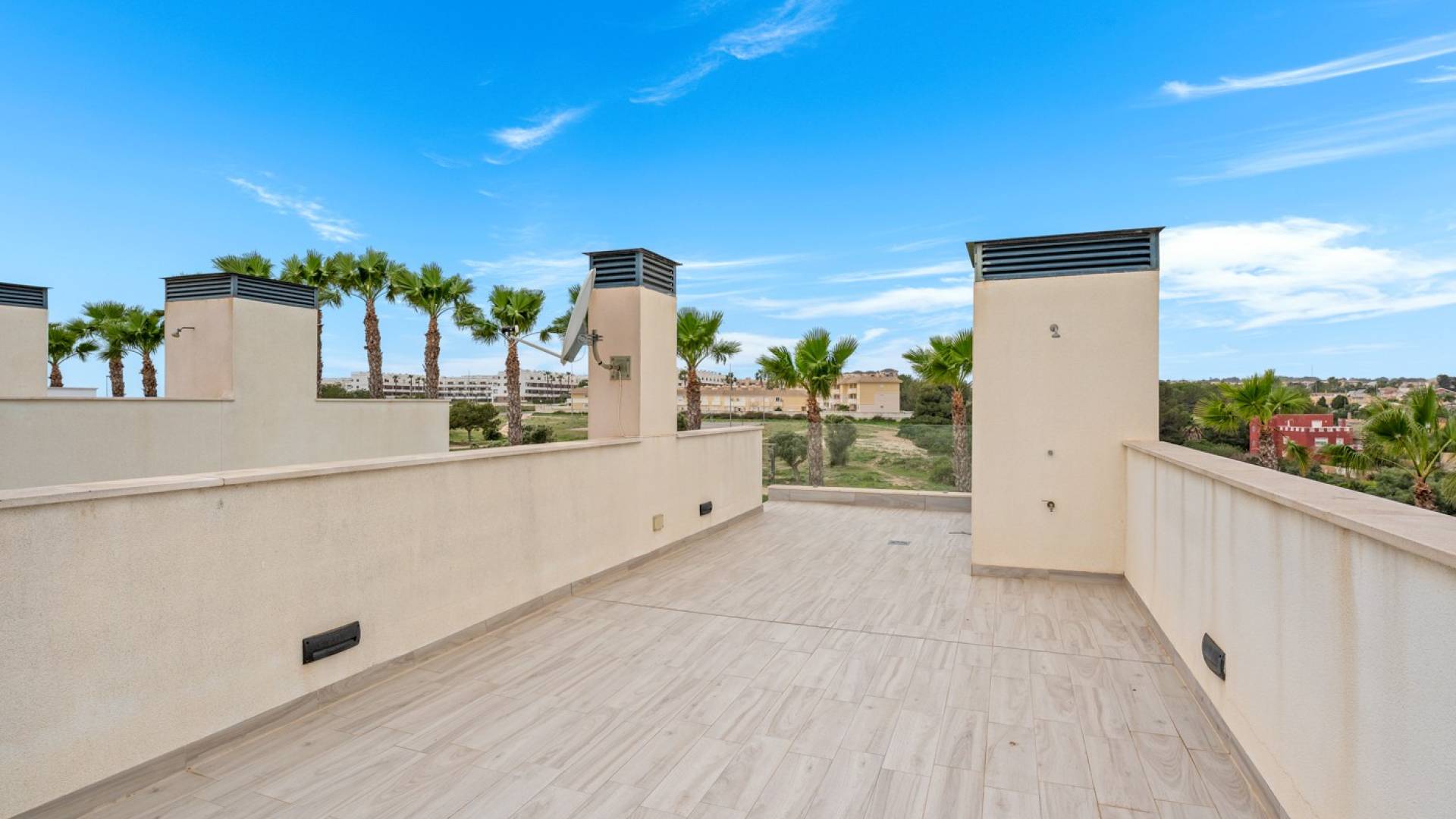 Neem een kijkje naar deze perfecte villa in Lomas de Campoamor. Een ideale investering als zomerwoning of voor verhuur. Gelegen op slechts enkele minuten van het strand en de golfbaan Las Ramblas, biedt deze moderne townhouse 3 slaapkamers en 3 badkamers. Op het gelijkvloers komt u binnen in een mooie open leef- en eetruimte met hoge raampartijen, die directe toegang geven tot het terras en het privézwembad. Op deze verdieping bevindt zich ook een slaapkamer en een badkamer. Op de eerste verdieping vindt u twee ruime tweepersoonsslaapkamers, elk met een eigen en-suite badkamer en toegang tot een terras met voldoende ruimte om een gezellige loungehoek te creëren. Vanaf dit terras bereikt u een tweede, hoger gelegen terras met prachtige natuurzichten, ideaal om te ontspannen en te genieten van de zonsondergangen. Ook het ruime solarium met zeezicht mag zeker niet ontbreken. Extra troeven van deze woning: Privézwembad van 18 m² Garage-ingang Voor- en achterterras Elektrische rolluiken Centrale airconditioning Binnenberging Omringd door palmbomen geniet u hier van rust en privacy, zonder afstand te doen van alle voorzieningen en het aangename leven dat Cabo Roig te bieden heeft.