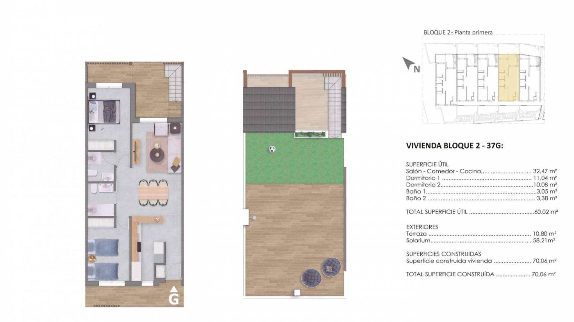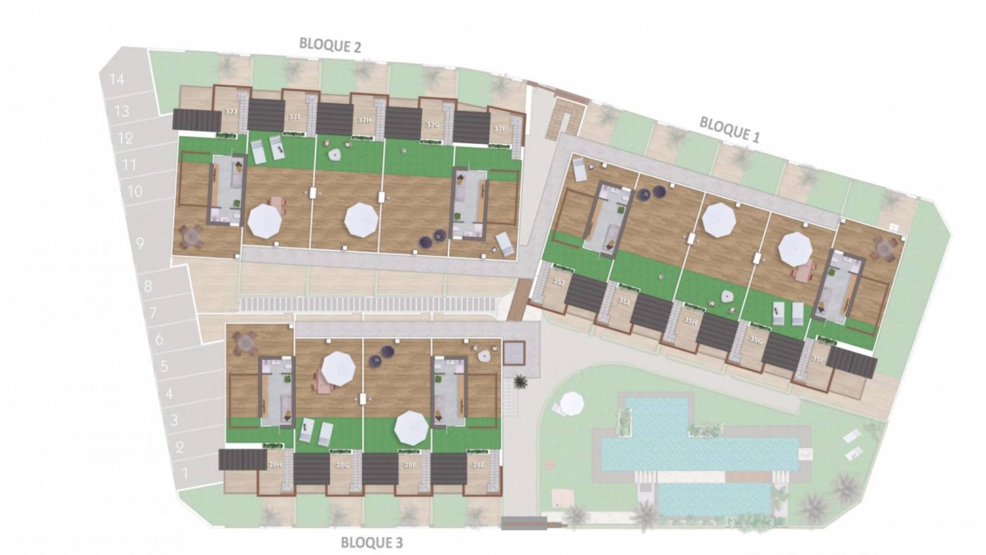 NYBYGG BOLIG TIL BUNGALOWLEILHETER I PILAR DE LA HORADADA Nybygget bolig med 28 bungalower med 2 soverom, 2 bad i første etasje med privat hage og 2 og 3 soverom og 2 og 3 bad i toppetasjen med privat solarium. Bolig med felles svømmebasseng. Hver eiendom har parkeringsplass. En avslappende kombinasjon av naturlige materialer og omfattende dekorasjon. Med det praktiske ved å ha alle tjenestene, kun 300 meter fra sentrum av Pilar de la Horadada og mindre enn 3 kilometer fra stranden, i hjertet av Costa Blanca. Pilar de la Horadada er en typisk spansk landsby i den sørligste delen av Costa Blanca. Den store hovedgaten har supermarkeder, mange butikker, restauranter og barer og noen flotte torg. De vakre strendene i Torre de la Horadada og Mil Palmeras med fin sand og promenade ligger bare 5 minutter unna. Flyplassene Corvera (Murcia) og Alicante ligger henholdsvis 40 og 55 minutter unna.