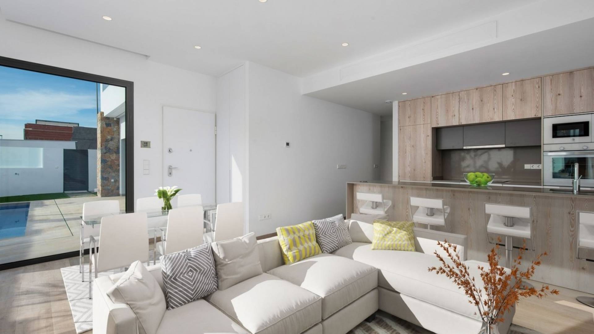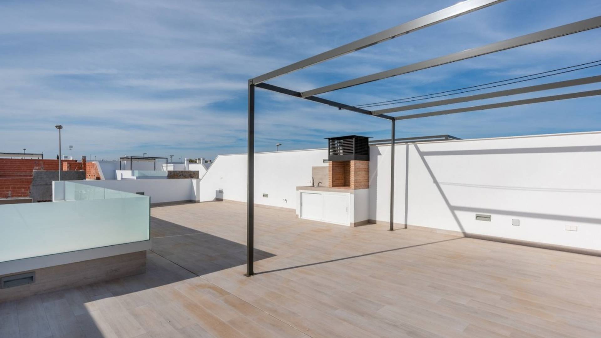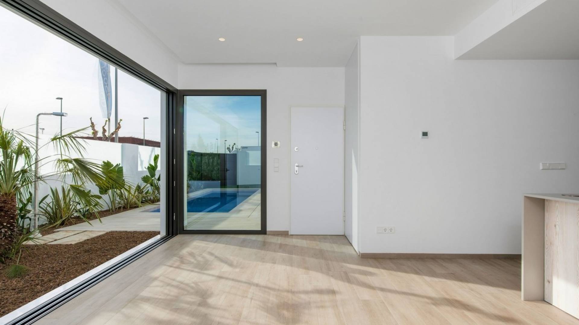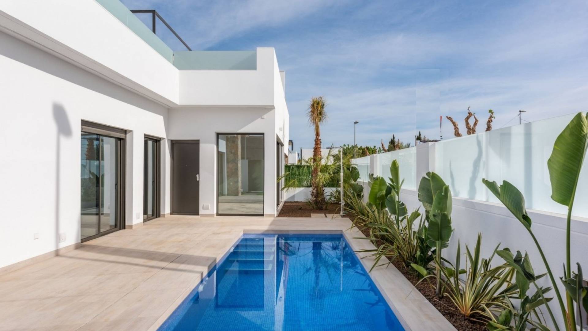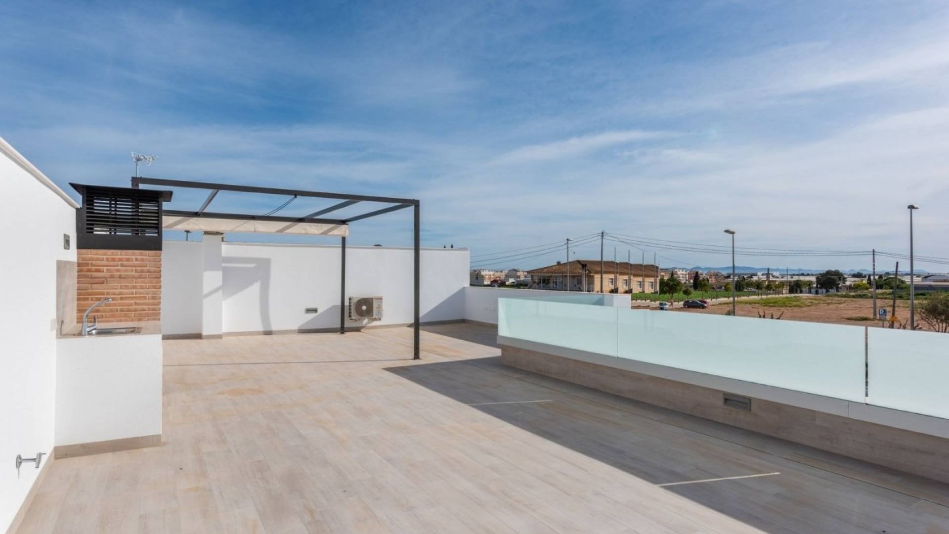 NYE BOLIGHUS MED PRIVAT BASSENG OG SOLARIUM I PILAR DE LA HORADADA !!! Enetasjes villaer i byen El Pilar de la Horadada, 3 km fra stranden og nær alle tjenester. Utstyrt med en stor privat solterrasse og privat basseng. Alt bygget med materialer av topp kvalitet. Kjøkkenet er fullt utstyrt. Alle soverommene har store innebygde garderober. Du kan parkere bilen din inne på tomten. Disse villaene er veldig lyse og layoutet på ett plan gjør det enkelt for hele familien å bruke. Villaene er på tomter fra 140 m2 og kan velges med 2 eller 3 soverom og med hjørnetomter. Byen er veldig aktiv hele året med alle tjenester tilgjengelig innen gangavstand, og du kan enkelt kjøre til motorveien AP-7, og den nye Murcia-Corvera flyplass ligger bare 25 minutter unna.