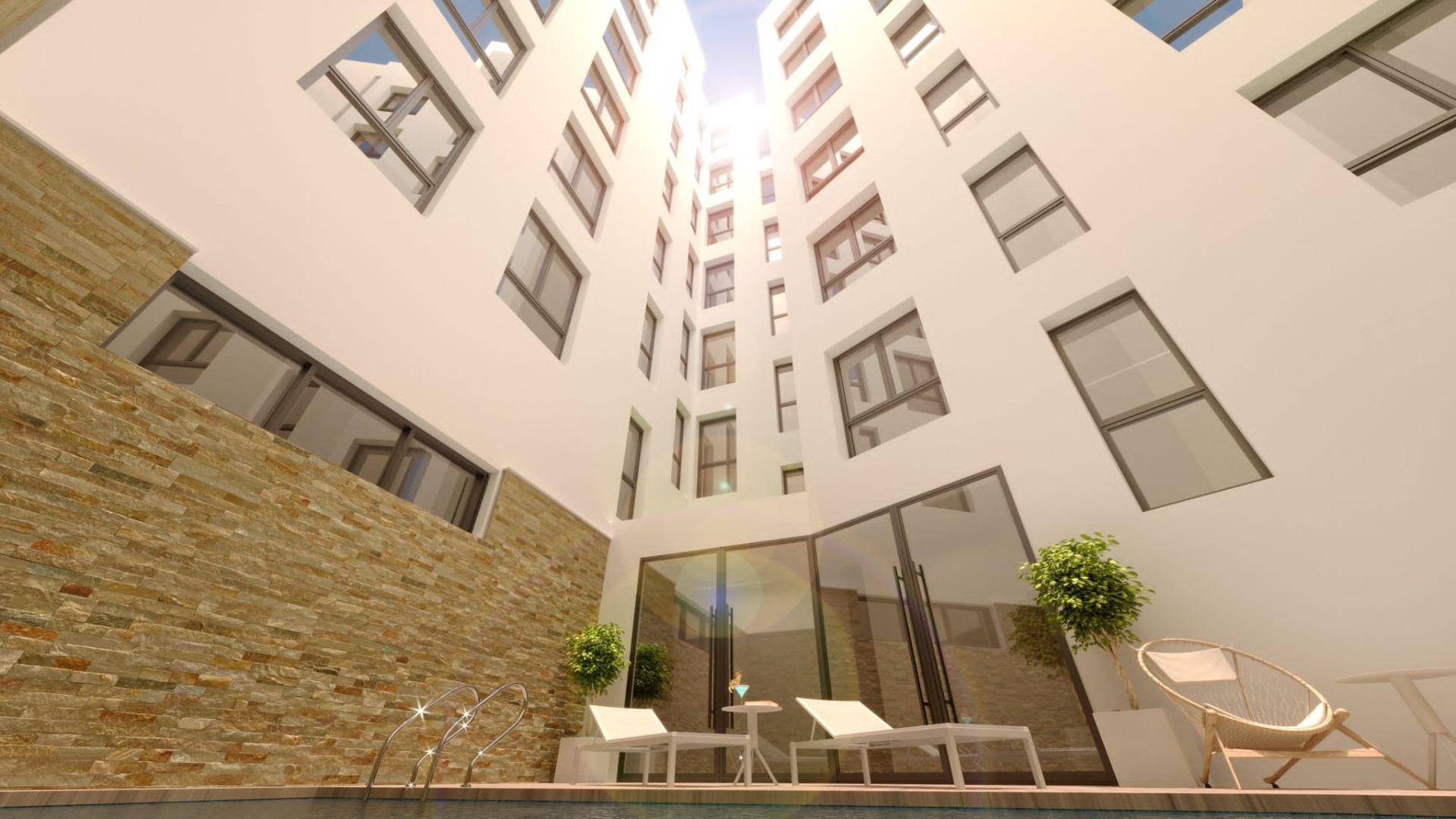 NYBYGDE TOPPLEILIGHETER I ALICANTE Nybygg med 28 moderne leiligheter og toppleiligheter med 1, 2 og 3 soverom i sentrum av Alicante med utsikt over parken og gangavstand til strandpromenaden. Komplekset går over 6 etasjer og ligger ved siden av det kommersielle området med tradisjonelle tapasbarer, butikker, kafeer, banker, sentralmarkedet, togstasjonen og mange andre lokale fasiliteter. Alle boligene har luksuriøs finish, tyske profilvinduer, støydemping og temperaturkontroll, garderober, belysning, fullt utstyrt kjøkken med hvitevarer fra ledende europeiske produsenter og bad med dusjvegger. Komplekset inkluderer - kvalitetsmaterialer - felles saltvannsbasseng - finsk badstue - treningsrom - sykkelparkering - fellesområder Leilighetene er utstyrt med: - åpen kjøkkenløsning, fullt møblert med alle elektriske apparater. - Bad med servant, speil, skjermer og gulvvarme. - individuell varm og kald luftkondisjonering - innebygde garderober - vinduer av høy kvalitet med elektriske persienner. Alicante ligger midt på Costa Blanca og er et av de viktigste turistmålene på den spanske østkysten. De mange golfbanene og det rolige Middelhavet er en del av attraksjonen i denne vakre havnebyen, som ligger ved foten av slottet Santa Barbara, et stille vitne om de mange sivilisasjonene som har bosatt seg her.
