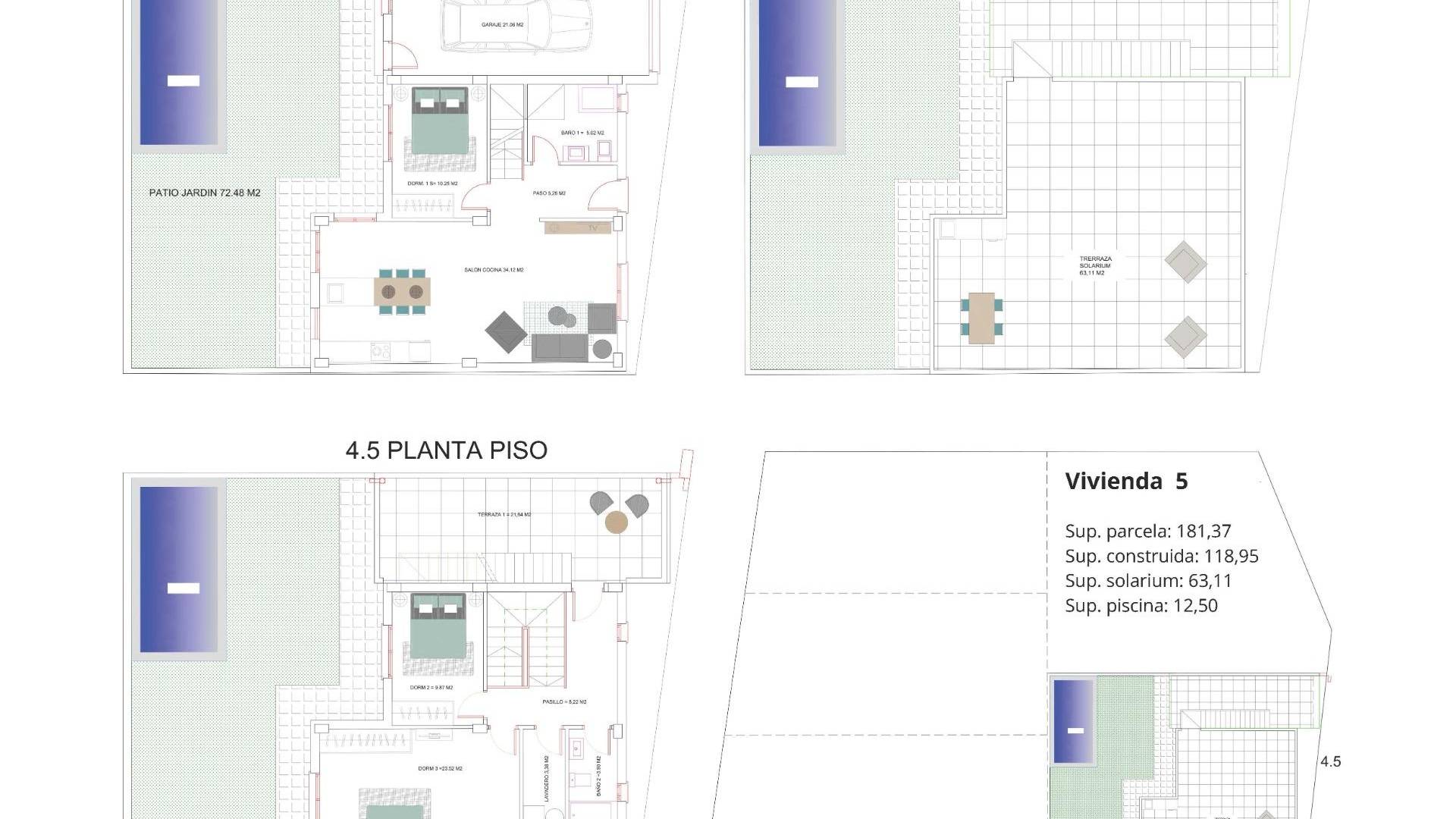 NYBYGG I LOS BELONES, LA MANGA MAR MENOR, LA MANGA MAR MENOR Nybygget luksuriøst kompleks med 5 eiendommer (3 rekkehus og 2 villaer) med privat svømmebasseng, inngjerdet garasje, innvendig uteplass, solarium med sommerkjøkken og forhåndsinstallasjon for lading av elbiler. Hver bolig har 3 soverom og 3 bad, elegant og funksjonelt interiør, fullt utstyrt kjøkken og hvitevarer inkludert. Soverommene har garderobeskap med skuffer og forhåndsinstallasjon for luftkondisjonering. Los Belones er en svært populær, stor landsby bare en kort kjøretur fra den berømte La Manga Club, 1 km fra sandstrendene i det varme Mar Menor og 3 km fra det vakre Middelhavet. Landsbyen er et blomstrende og typisk spansk miljø med et stort utvalg av tapasbarer, restauranter og mange fasiliteter. Hver tirsdag er det et ukentlig marked som er svært populært blant lokalbefolkningen og turister. Den historiske havnen i Cartagena ligger bare 20 minutters kjøring unna. Flyplasser: Murcia regionale flyplass (Corvera) ligger 35 minutters kjøring unna, og Alicante flyplass ligger 75 minutters kjøring unna.