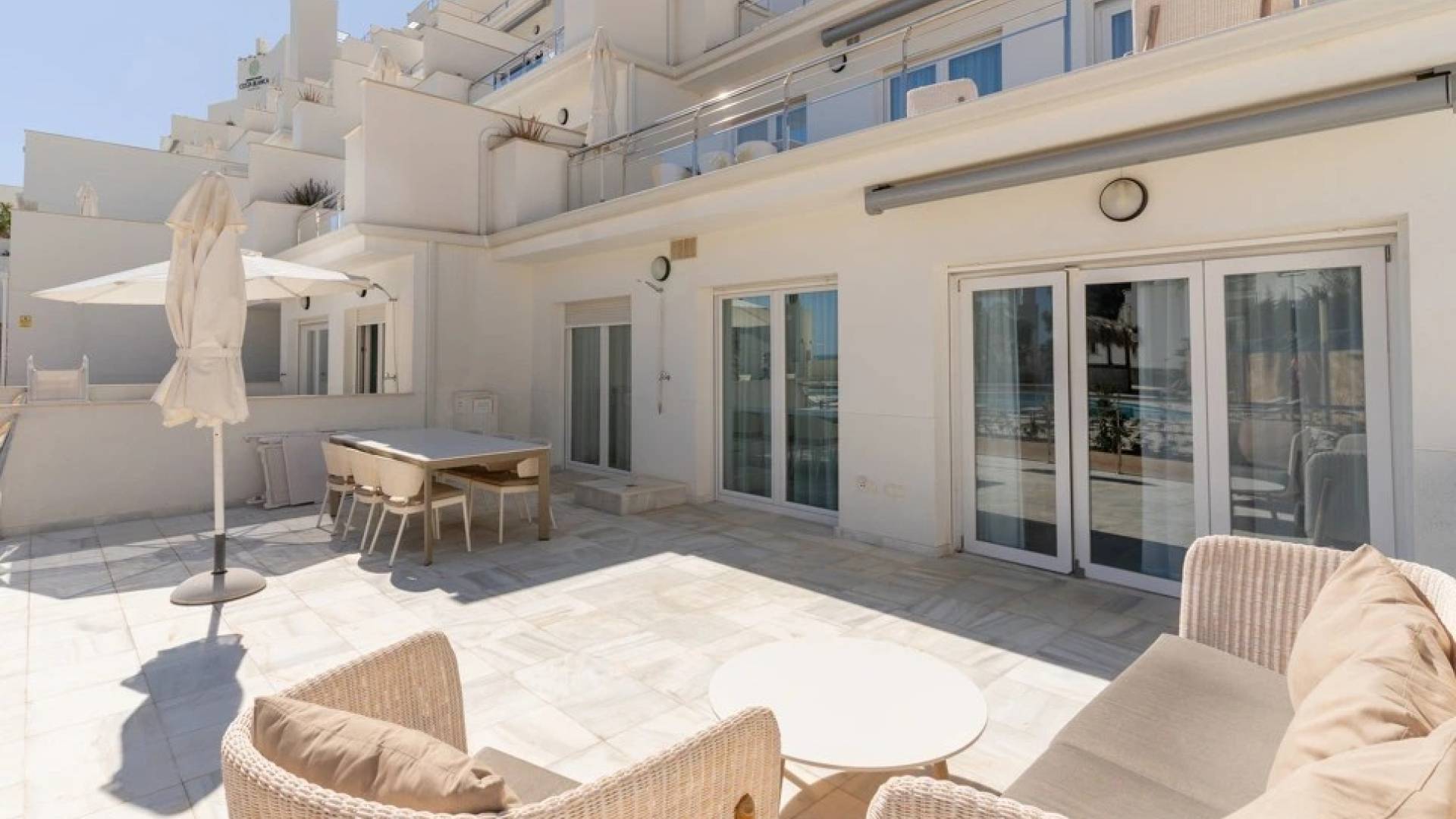 Spennende over hele leilighetens bredde, fra stuen og et av soverommene, har du tilgang til en romslig møblert terrasse med vakker utsikt over Middelhavet. Du har tilgang til parkeringsplass i underjordisk parkeringshus og eierbod.