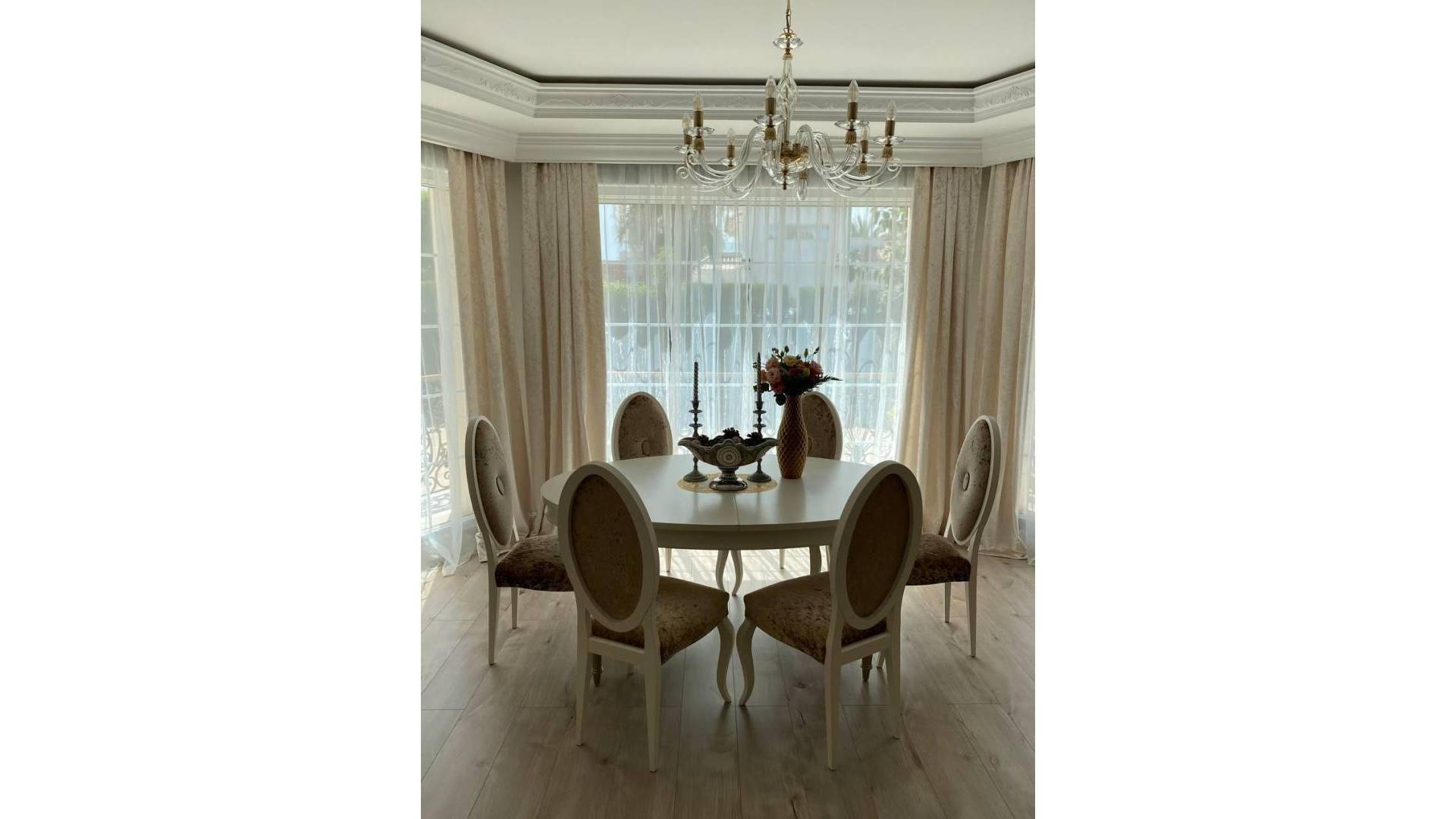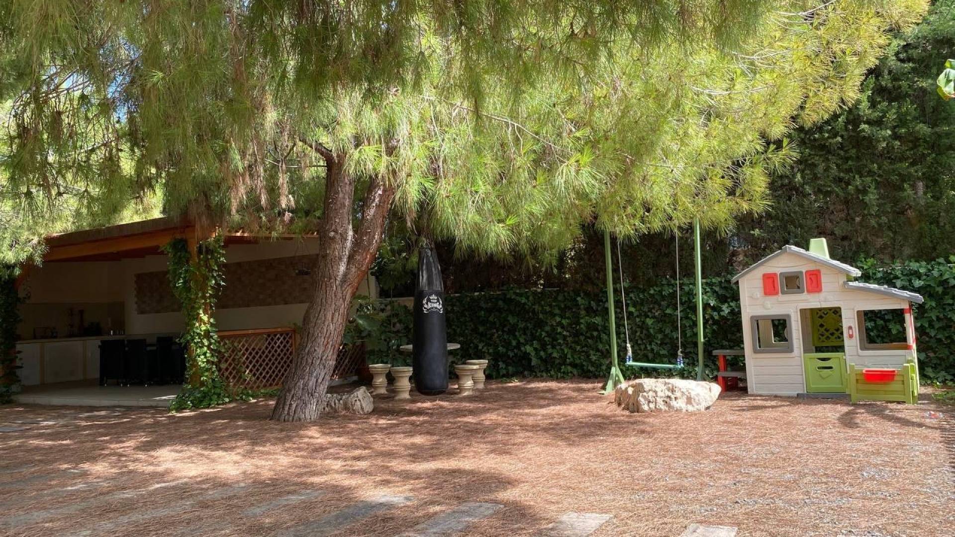 Denne imponerende boligen i Ciudad Quesada, som ligger i et fredelig nabolag, er nå til salgs og tilbyr en komfortabel og sofistikert boopplevelse. Opprinnelig bygget på en tomt på 878 m², med et boligareal på 313 m², ble eiendommen renovert i 2017 og kombinerer moderne bekvemmeligheter med en sjarmerende, anlagt uteplass. Ved ankomst møtes du av en frodig hage omgitt av trær som gir privatliv og ro. Til høyre for inngangen finner du en koselig sittegruppe som er perfekt for avslapning i skyggen på solrike dager. I midten av uteområdet ligger et velholdt svømmebasseng, ideelt for å kjøle seg ned på varme sommerdager. Til venstre for bassenget er det en hage med store trær og en hengekøye, som inviterer til rolige øyeblikk. Uteområdet inkluderer også et moderne utekjøkken utstyrt med spiseplass, grill, vask og strømuttak – perfekt for å arrangere middager utendørs med venner og familie. Når du går inn i huset, blir du møtt av en praktisk entré med en innebygd garderobe som gir rikelig med lagringsplass for klær og sko. Rett frem ligger et komfortabelt gjesterom med en dobbeltseng. Til høyre finner du en romslig stue med et åpent kjøkken som fungerer som hjemmets hjerte. Dette lyse rommet inkluderer et stort spisebord og et moderne kjøkken med topp moderne hvitevarer og rikelig med arbeidsplass – ideelt for matlaging og sosialt samvær. Fra hovedområdet har du tilgang til et andre soverom, som for tiden brukes som et barnelekerom, samt et moderne bad med dusj. I tillegg fører stuen til en garasje og et lagringsrom under trappen som leder til andre etasje. I andre etasje finner du flere funksjonelle rom. Til venstre er det to ekstra soverom som deler et bad med dusj; ett av rommene brukes som treningsrom, mens det andre fungerer som barnerom med en fransk balkong. På motsatt side av etasjen ligger hovedsoverommet, som har en walk-in-garderobe, et romslig bad med både dusj og badekar, samt en stor privat balkong – perfekt for rolige stunder. Huset er utstyrt med gulvvarme, sentral aircondition og forhåndsinstallasjon for peis, noe som sikrer komfort året rundt. Alle vinduene har doble glass og elektriske persienner for ekstra isolasjon og sikkerhet. Denne eiendommen er den perfekte kombinasjonen av moderne design og en fredelig, naturlig atmosfære – ideell for de som søker komfort, privatliv og en livsstil av høy kvalitet.