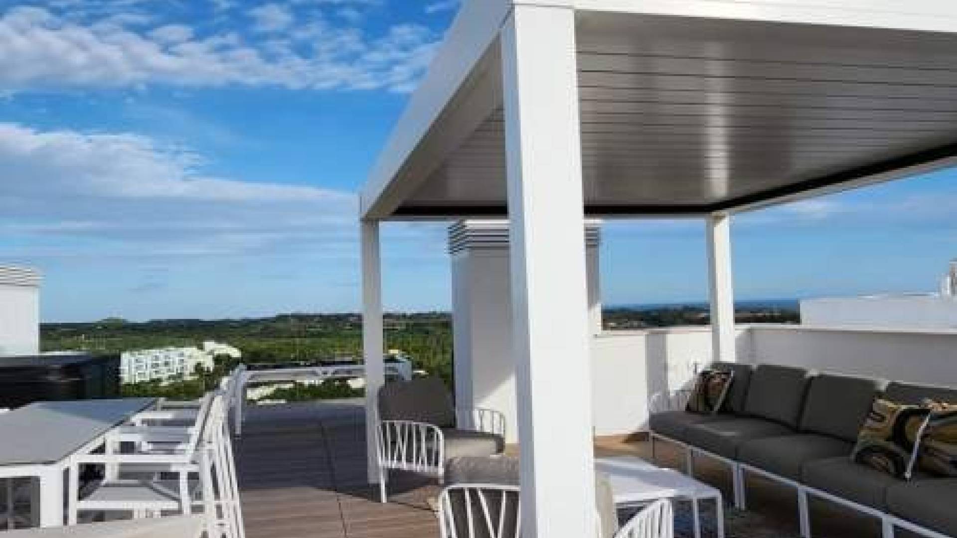 Denne splitter nye, luksuriøst innredede toppleiligheten med spektakulær utsikt ligger på det prestisjetunge golfanlegget Las Colinas. De tre møblerte soverommene, romslig og stilig stue, terrasse og solarium i kombinasjon med et vakkert middelhavslandskap og skjermet beliggenhet gjør denne drømmeleiligheten til et utmerket valg som bolig eller landsted i Spania.Ved å velge lyse farger og elegante møbler, utstråler alle 3 soverommene (inkludert 1 med eget bad) rolig ro og komfort.Stuen med åpen kjøkkenløsning, barhjørne og romslig terrasse (23m2) gir en fantastisk utsikt over golfanlegget. Det moderne fullt utstyrte kjøkkenet med innebygde skap har oppvaskmaskin med komfortløftteknologi, vannfiltersystem, induksjonstopp, vinkjøler m.m.Elektriske skodder er installert i alle rom for mer atmosfære og privatliv. Et optimalt inneklima er garantert av en energieffektiv varmepumpeluftbehandlingssystemkombinasjon og kan styres separat for hvert rom. Huset har en privat underjordisk parkeringsplass hvor ladestasjon kan monteres om ønskelig, stor bod og flott felles svømmebasseng.Den spanske feriefølelsen kan til enhver tid oppleves på den romslige takterrassen på ikke mindre enn 100 m2! med utekjøkken, pergola, jacuzzi og 360 grader uhindret utsikt over naturlandskapet og Middelhavet. Utekjøkkenet (3x3,6m2) har god skapplass, benkeplate i granitt, induksjonsplate, oppvaskmaskin og kjøleskap. Skyvetaket på aluminiumspergolaen (5x3m2) er elektrisk betjent og skaper et ideelt skyggefullt sted.For å fullføre oppholdet kan du oppleve den ultimate følelsen av å kose deg i ditt eget boblebad: 5 personer, 102 hydrojetfly, LED-belysning og høyttalere!Så herlig ville det vært å starte dagen med en fersk kopp kaffe i baren eller avslutte den med en deilig cocktail ved solnedgang på din egen takterrasse i et middelhavsmiljø!