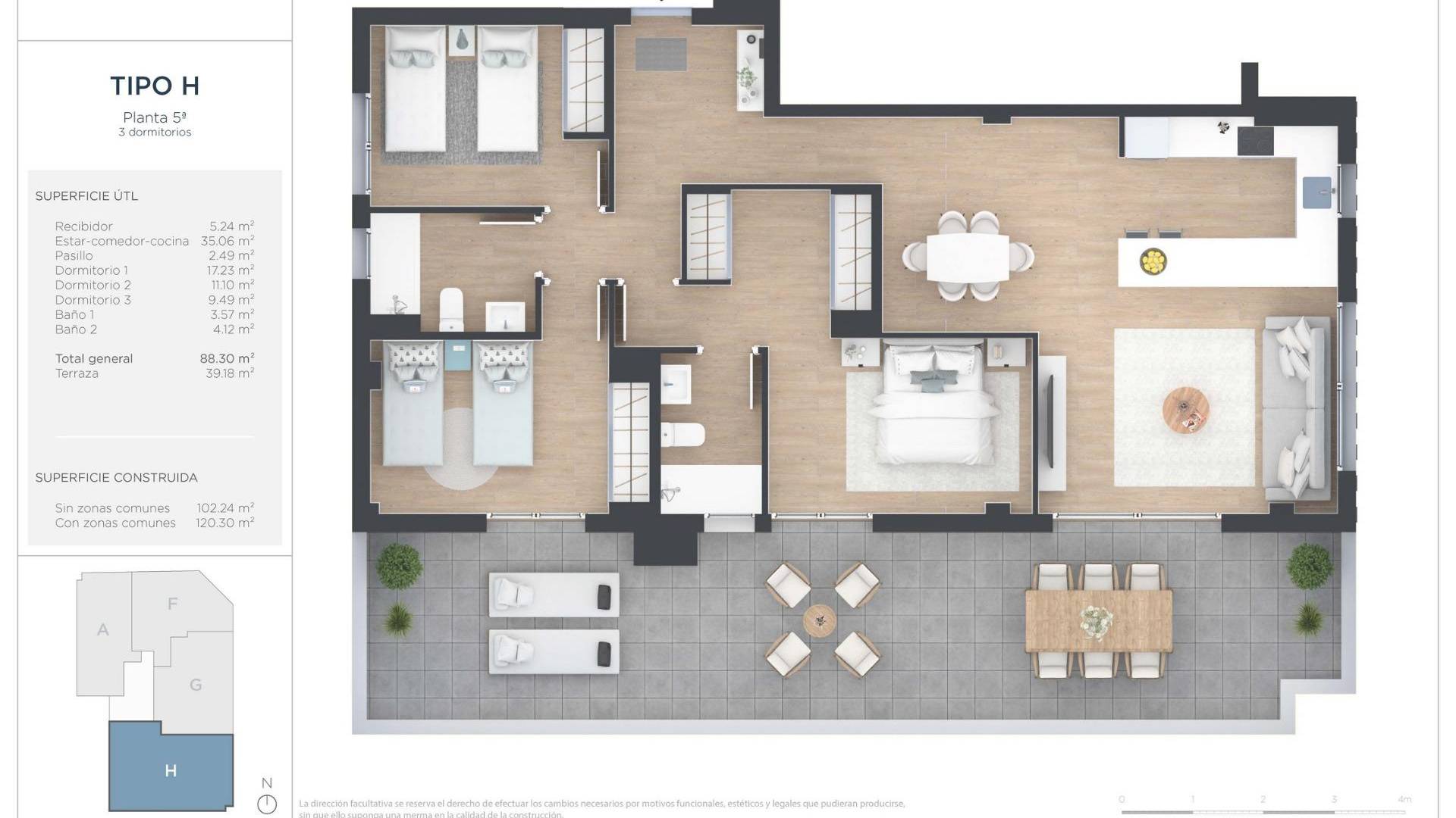 Nybygget penthouse med 3 soverom og havutsikt i sentrum av Alicante, nær Avenida Oscar Espla Førsteklasses beliggenhet i hjertet av Alicante by Dette eksklusive nye prosjektet med 28 moderne leiligheter med 2 og 3 soverom ligger ved siden av Avenida Oscar Espla, en av hovedgatene i Alicante. Prosjektet ligger i nærheten av Avenida Maisonnave, den mest kommersielle og dynamiske gaten i byen, og tilbyr en uovertruffen sentral beliggenhet med alle tjenester, butikker, restauranter og offentlig transport innen gangavstand. Fra eiendommen kan du nå høyhastighetsstasjonen på bare 10 minutter til fots. Busstasjonen, strandpromenaden, marinaen i Port of Alicante og Playa del Postiguet ligger alle mindre enn 2 km unna. Motorveiene A31 og AP7 gir utmerkede veiforbindelser, og Alicante lufthavn ligger bare 13 km unna, omtrent 13 minutter med bil. Romslig penthouse med 3 soverom og 40 m2 terrasse Denne enestående nøkkelferdige penthouse-leiligheten har 120 m2 bebygget areal fordelt på tre soverom og to komplette bad. Ett av soverommene skiller seg ut med sin generøse størrelse, noe som gjør det ideelt som hovedsoverom. Den store stuen er hjertet i hjemmet, fylt med naturlig lys og med vakker havutsikt som skaper en unik boopplevelse i sentrum av byen. Høydepunktet i eiendommen er den imponerende private terrassen på 40 m2, perfekt for å spise ute, slappe av i solen eller underholde venner og familie mens du nyter den åpne utsikten. Moderne bygning med førsteklasses fellesarealer Bygningen har heis og er fullt tilpasset for personer med nedsatt mobilitet. Beboerne kan nyte et felles svømmebasseng og solarium på taket, ideelt for å kjøle seg ned under de varme middelhavssomrene. Det er også en egen sykkelparkeringsplass. Eiendommen inkluderer en privat parkeringsplass i kjelleren og bod, noe som gir ekstra komfort og praktisk funksjonalitet i hverdagen. Kvalitetsspesifikasjoner og energieffektivitet Leiligheten leveres med høykvalitets finish, inkludert et innredet kjøkken utstyrt med keramisk komfyr, stekeovn og avtrekksvifte, innebygde garderober, forsterket sikkerhetsdør og aerotermisk system for varmt vann. Utvendig snekring har termisk isolerte aluminiumsrammer med doble vinduer for bedre isolasjon. Klimaanlegg og oppvarming via varmepumpe sikrer komfort hele året. Urban Living by the Sea Denne penthouse-leiligheten kombinerer plass, havutsikt og en førsteklasses sentral beliggenhet i Alicante. Kontakt oss i dag for å få mer informasjon eller for å avtale en visning av denne eksepsjonelle nybyggede eiendommen. 489