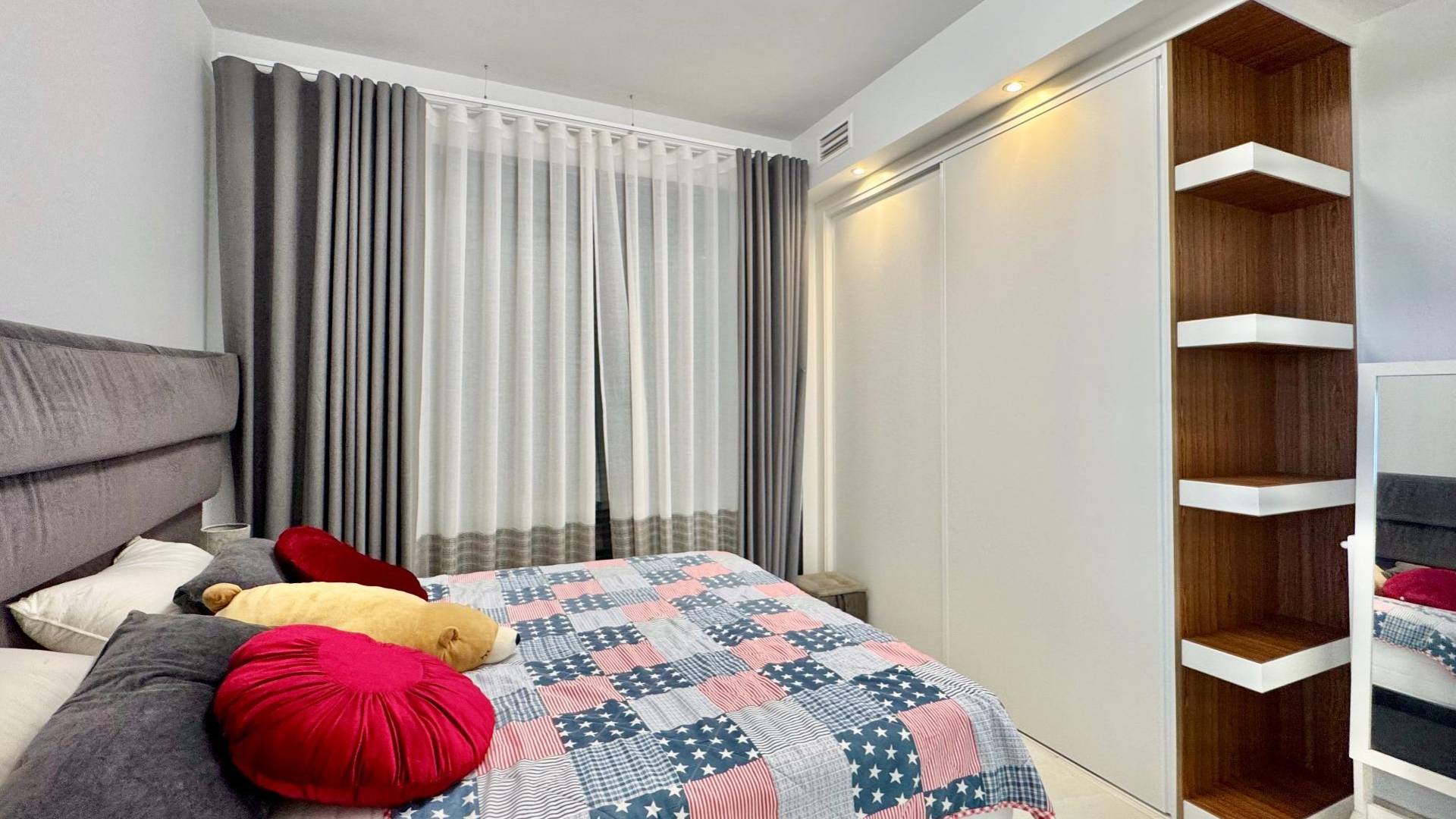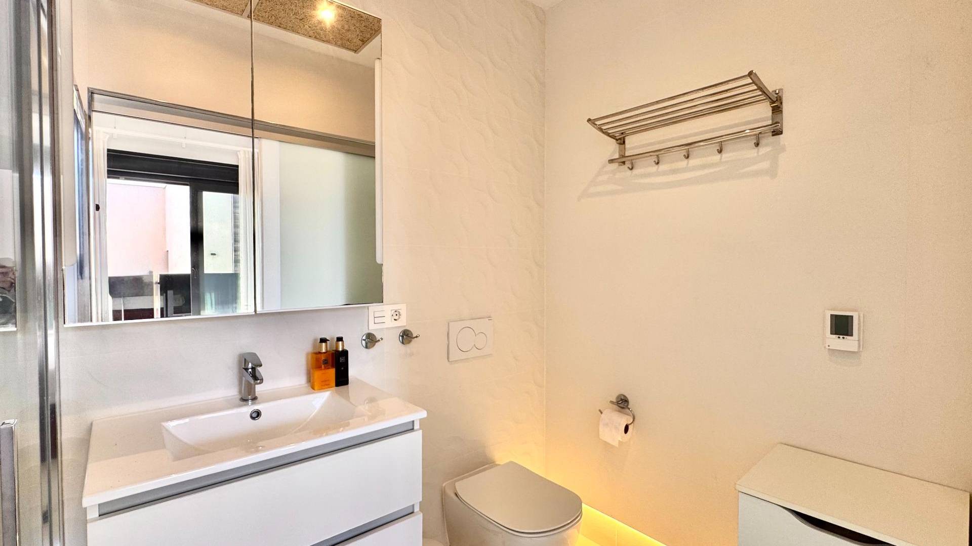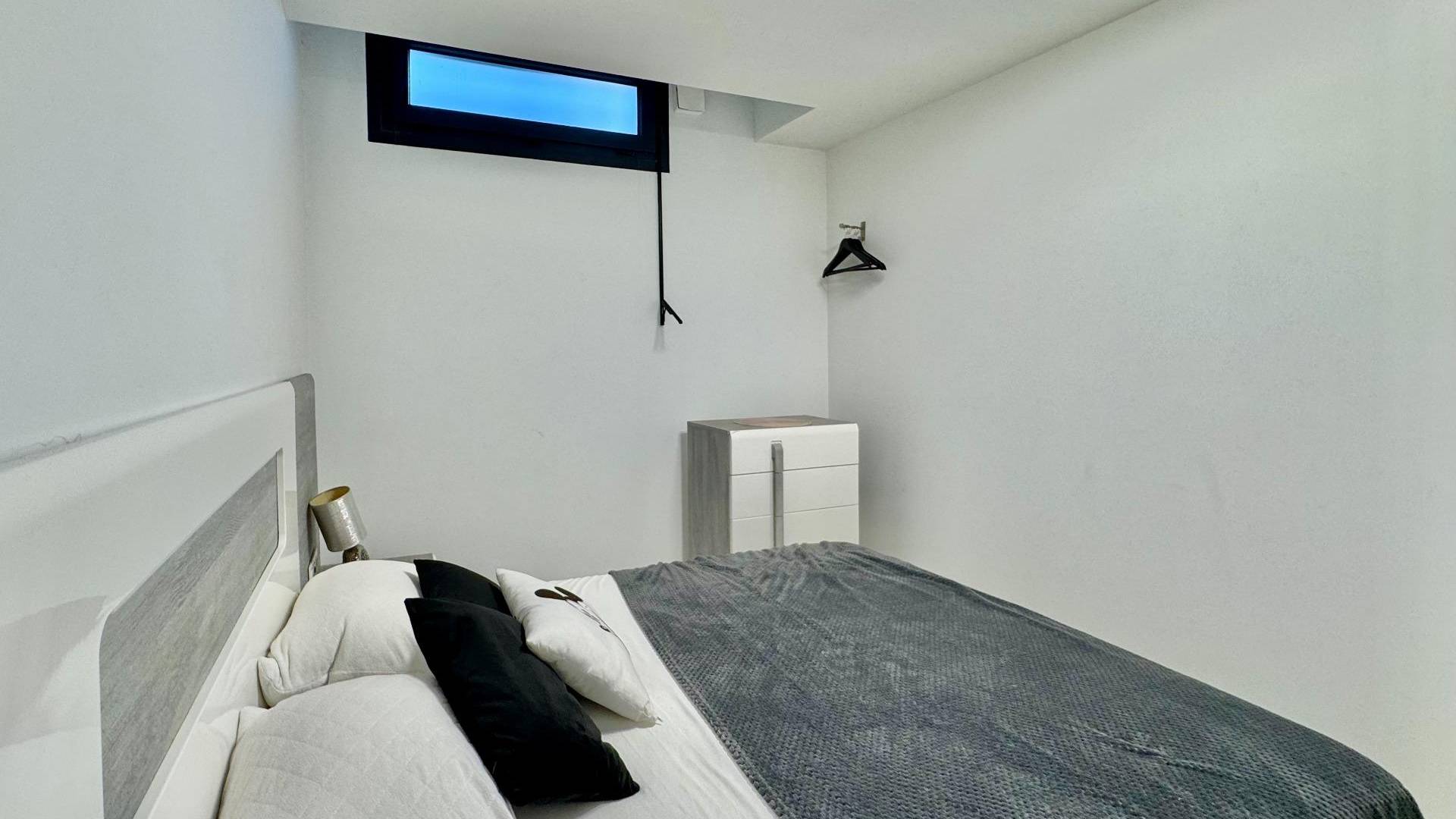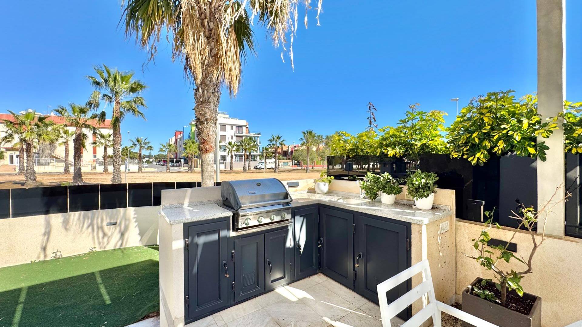 moderne frittstående villa bygget i 2021, innflyttingsklar og fullt møblert, beliggende i et rolig og solrikt område nær stranden og alle fasiliteter. denne stilfulle boligen kombinerer plass, lys og komfort og er perfekt både som helårsbolig eller som feriebolig på costa blanca. villaen har et bebygd areal på 285 m² og 185 m² boareal fordelt over to etasjer pluss en romslig kjeller. inne finner du fire soverom og fire bad, med en moderne åpen planløsning og store panoramavinduer som gir mye naturlig lys. ute kan du nyte en privat hage med svømmebasseng, flere terrasser og et flott taksolarium med jacuzzi. takket være sørvendt orientering får boligen sol nesten hele dagen. eiendommen har også aircondition, individuell elektrisk oppvarming, innebygde garderober, bod og privat parkeringsplass. solcellepanelene gir bedre energieffektivitet og lavere strømkostnader. beliggenheten er ideell: stranden ligger bare fem minutter med bil, supermarkeder fem minutter unna og et kjøpesenter rundt ti minutter. alicante flyplass ligger omtrent 45 minutter unna. en moderne og komfortabel villa, perfekt for å nyte middelhavslivet.