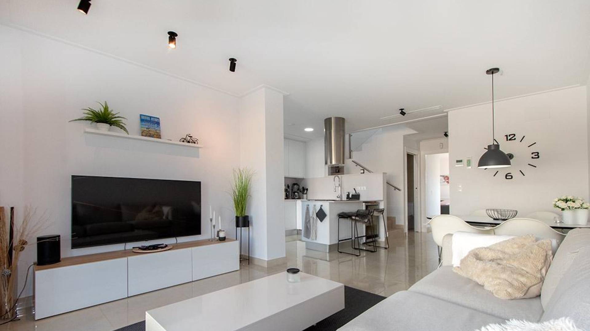 Innflytningsklar terrassevilla i det populære boligområdet Ciudad Quesada i Rojales. Kun 10 minutters kjøring fra de spektakulære strendene i Guardamar og Torrevieja, og nær den vakre naturparken i La Mata-lagunene. Alle daglige nødvendigheter ligger en kort kjøretur fra hjemmet, som supermarkeder, banker, apotek, barer og restauranter. Alicante flyplass ligger kun 45 minutter unna med bil.Dette er et vakkert presentert hjem fordelt over to etasjer pluss takterrasse, med 3 soverom, 2 bad (ett en-suite), og et gjestetoalett. Den romslige og lyse stuen kombinerer kjøkken, spisestue og stue på et plan som åpner ut mot en sørvestvendt terrasse med privat basseng og et utendørs spiseområde. Hoved soverommet med eget bad ligger i første etasje, mens de resterende 2 soverommene og felles bad ligger i første etasje. Den romslige terrassen i første etasje fører til takterrassen som er det perfekte stedet å nyte Costa Blanca-klimaet, med en pergoladekket salong med kunstgress og et sommerkjøkken.Boligen leveres med fullt installert kanalklimaanlegg (varmt/kaldt), hvitevarer, privat basseng og parkering i lokalene.