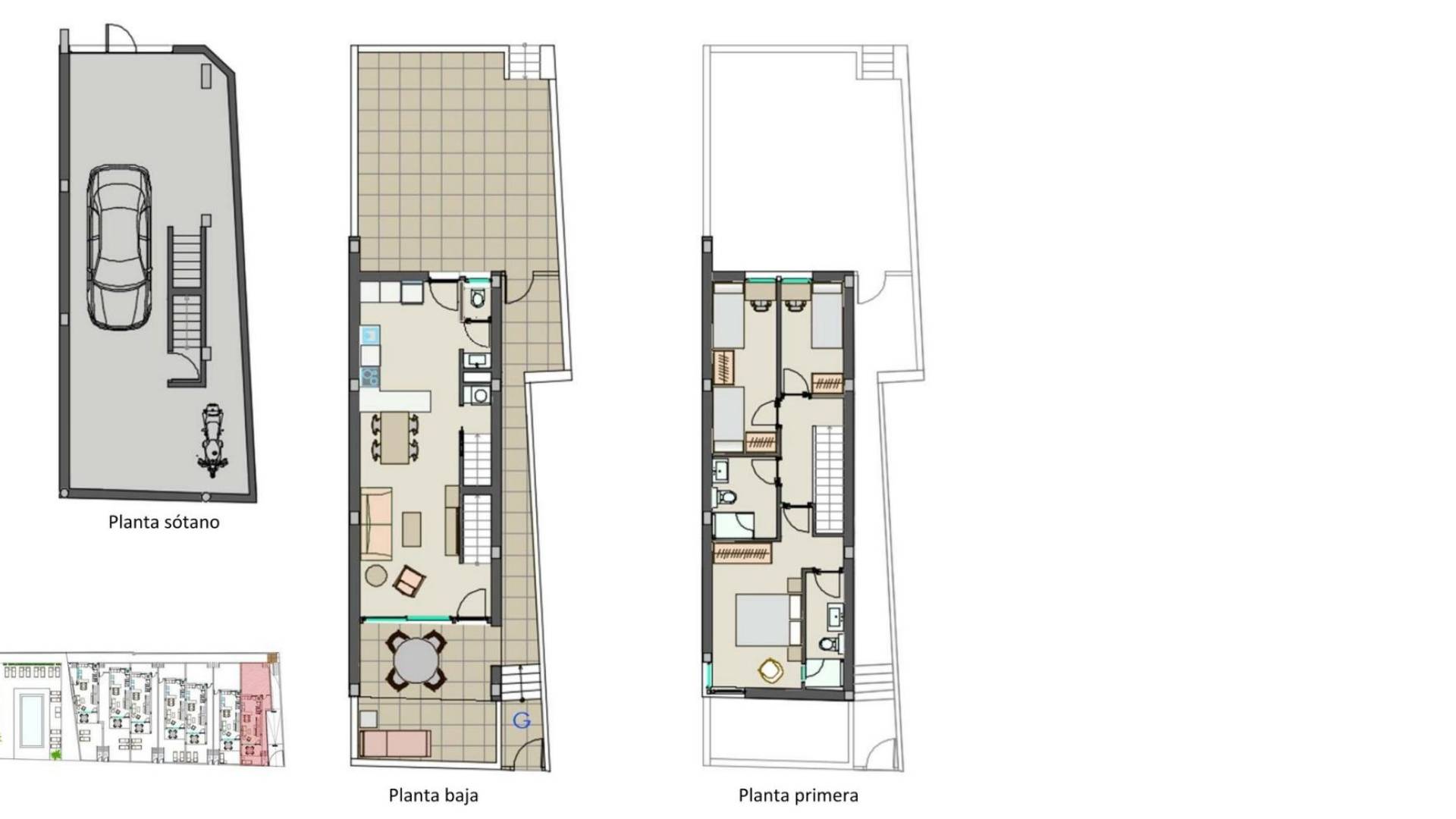 Nybygde tomannsboliger ved stranden i Moncofa med havutsikt Førsteklasses beliggenhet ved kysten av Castellón Oppdag et eksklusivt boligprosjekt med moderne tomannsboliger som ligger i første strandlinje i Moncofa, mellom kystområdene Chilches og Moncofa. Denne privilegerte beliggenheten på Costa del Azahar gir direkte tilgang til fredelige sandstrender og en avslappet middelhavsstil. Området er ideelt både for fast bolig og feriebolig, med lokale restauranter, strandbarer, supermarkeder og nødvendige tjenester i kort avstand. Moncofa har gode veiforbindelser, noe som gir enkel tilgang til nærliggende byer som Castellón og Valencia. Moderne design og funksjonell planløsning Dette eksklusive prosjektet består av bare 7 elegante boliger, designet med rene arkitektoniske linjer og fokus på komfort og hverdagsliv. Hver bolig har 3 soverom, 2 bad, inkludert ett på soverommet, og et ekstra gjestetoalett. Boligene er fordelt på tre etasjer, noe som maksimerer plassen og det naturlige lyset. Første etasje har en åpen stue og spisestue med et fullt utstyrt kjøkken, som går sømløst over i en privat terrasse med vakker havutsikt. Andre etasje rommer soverommene, inkludert en romslig master suite, mens noen enheter også har en terrasse på dette nivået. Kjellernivået har en privat garasje for 1 eller 2 biler og ekstra lagringsplass. Kvalitetsfinish og klar til innflytting Alle villaene leveres fullt møblerte. Kjøkkenene inkluderer hvitevarer, og badene er utstyrt med møbler, speil og dusjvegger. Boligene har også fullt installert klimaanlegg og et effektivt aerotermisk system for varmt vann, noe som sikrer komfort og energieffektivitet hele året. Eksklusivt nabolag og livsstil Boligkomplekset har et felles svømmebasseng og anlagte hager, alt beliggende i et miljø rett ved stranden. Dette skaper en fredelig og trygg atmosfære, perfekt for å nyte middelhavsklimaet og friluftslivet. Avstander til viktige severdigheter Moncofa-stranden: 0 km Chilches-stranden: 2 km Castellón sentrum: 30 km Valencia by: 50 km Valencia lufthavn: 55 km Castellón flyplass: 45 km Nærmeste golfbaner: ca. 20 km Ditt middelhavshjem venter Enten du er på jakt etter en fast bolig, et feriehus eller en smart investering, tilbyr disse tomannsboligene ved stranden i Moncofa en unik mulighet til å nyte havet, komfort og moderne design i et av Spanias mest autentiske kystområder. Kontakt oss i dag for mer informasjon eller for å avtale et besøk. 489