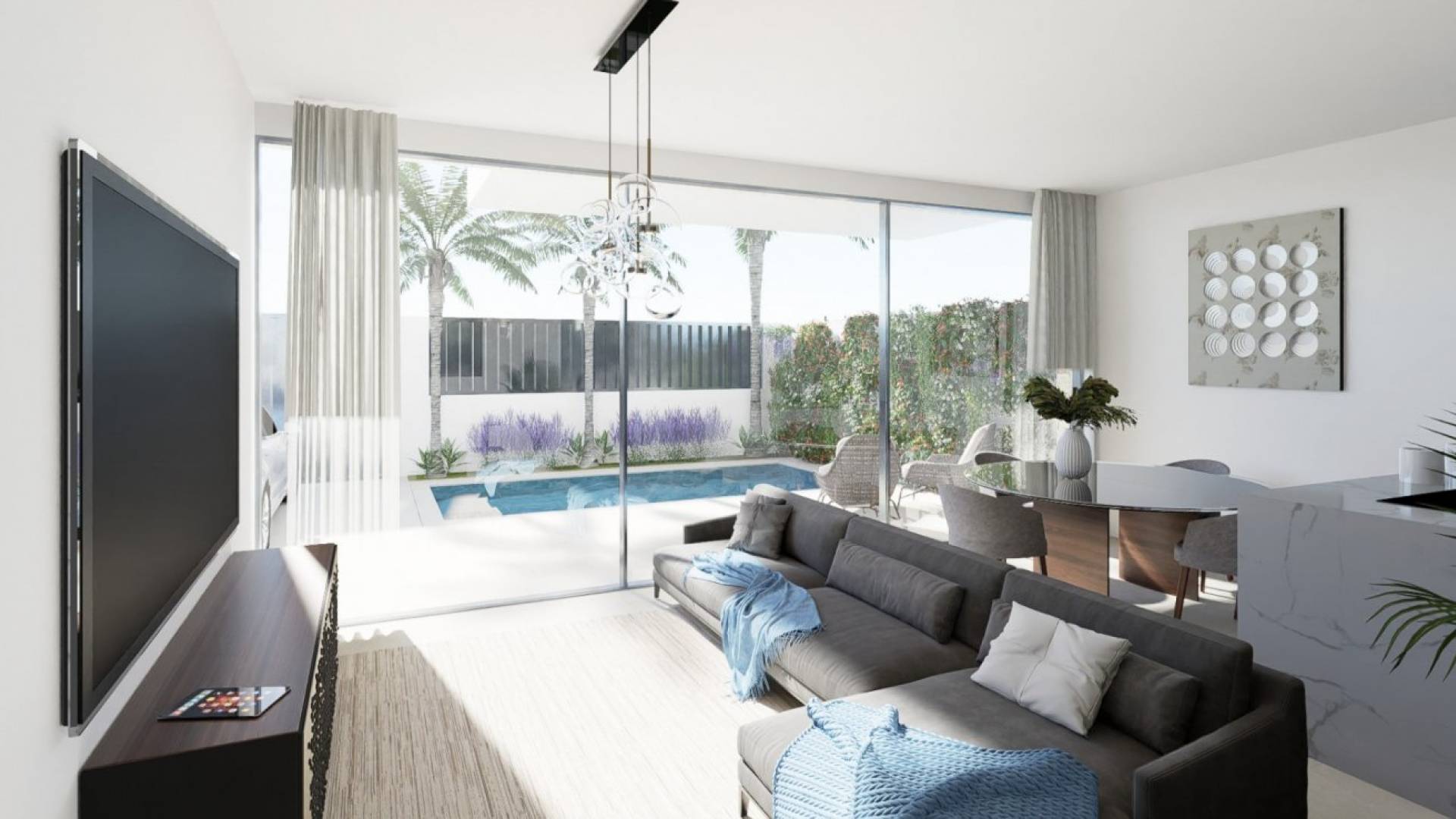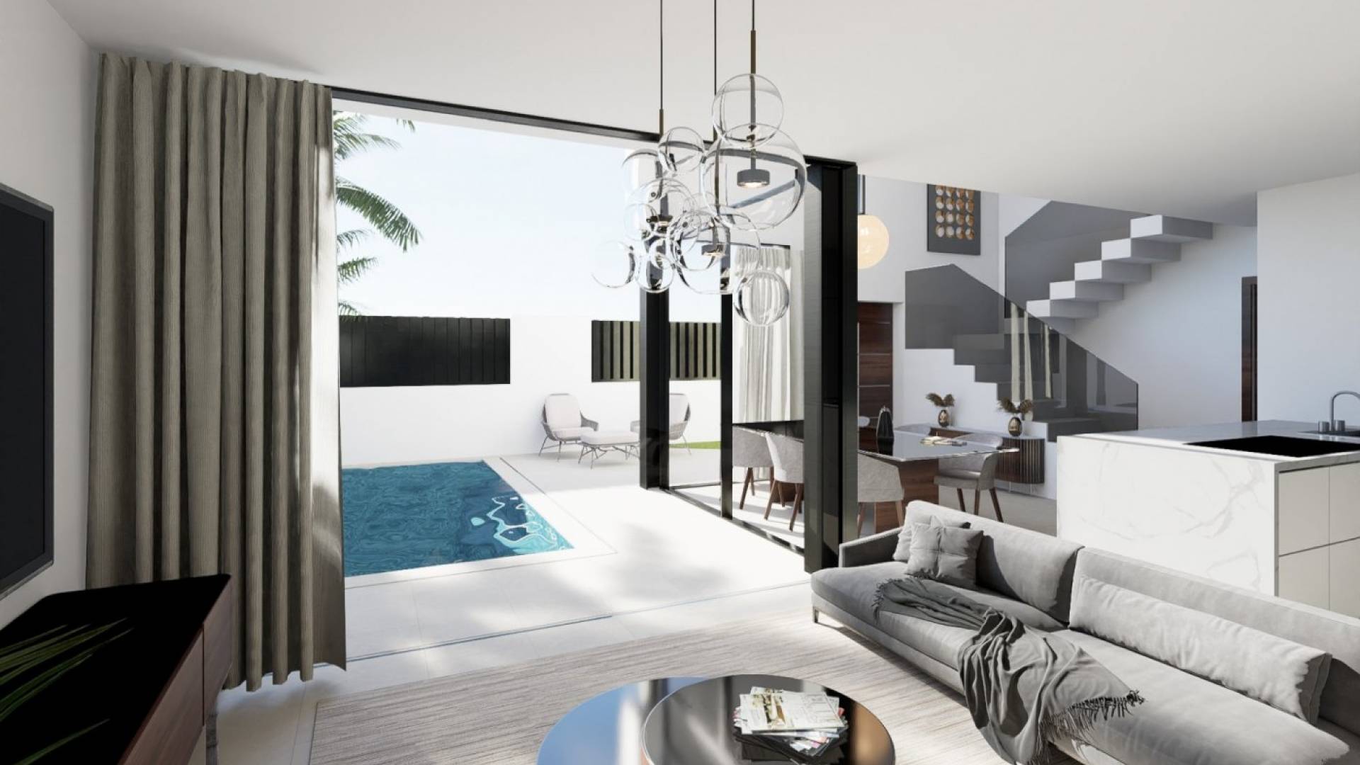 NYBYGGDE VILLAER I SAN PEDRO DEL PINATAR Nybygg 2 villaer i San Pedro del Pinatar. Nybyggede moderne villaer har 3 soverom, 3 bad, åpen kjøkkenløsning med stue, garderober, privat hage med basseng og off-road parkeringsplass, privat solarium. Store vindusflater i stuen med direkte utgang til bassengområdet. Villaer ligger godt til med hensyn til skoler, butikker, idrettssentre og offentlig transport San Pedro del Pinatars privilegerte beliggenhet ved Mar Menor og Middelhavskysten tiltrekker seg de som er interessert i seiling og vannsport, og tilbyr båthavn og seilklubber, mens strendene og naturlige gjørmebad tiltrekker seg de som søker trygg sol, sjø og sand. San Pedro del Pinatar har et etablert samfunn og tilbyr et utmerket utvalg av aktiviteter, inkludert overbygd svømmebasseng og idrettsanlegg, samt et helårs program med sosiale aktiviteter i det behagelige vinterværet. Fordelene med gjørmebadene, typisk for regionen, eller det rolige vannet i Mar Menor, har favorisert veksten av Lo Pagán, som for tiden har alle slags fasiliteter. I tillegg har det en utmerket beliggenhet, kun 5 minutter fra Commercial Centre Dos Mares. Murcia/Corvera flyplass ligger 30 minutter unna, og Alicante flyplass ligger en times kjøretur unna.