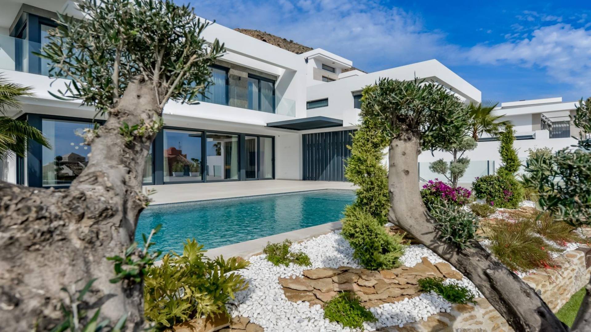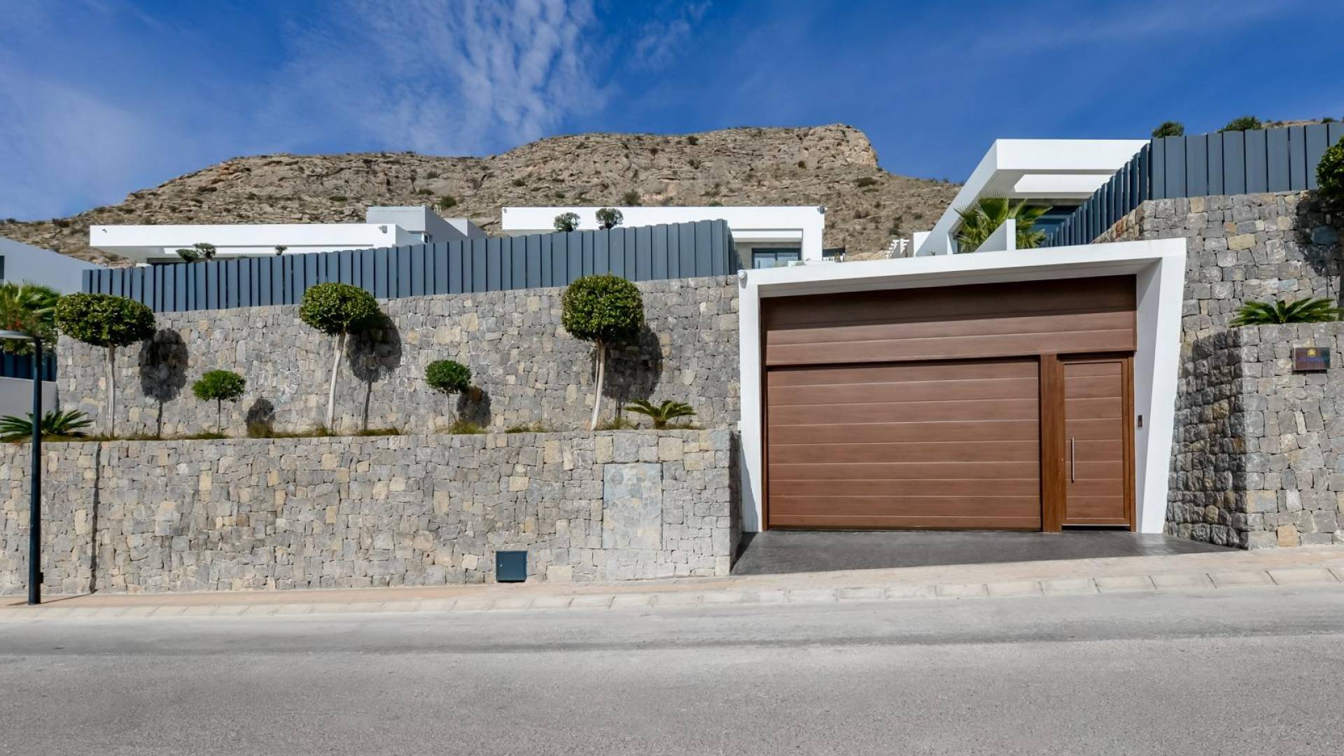 NYBYGD LUKSUSVILLA I FINESTRAT Nybygget moderne villa i Finestrat med havutsikt. Utmerket beliggenhet med store privilegier for å være i en rolig Sierra Cortina urbanisering, men veldig nær alle tjenester og butikker, samt stranden. Design og moderne linjer med de nyeste teknologiene og materialene. Villa bygget på tomten på 704 m2, har 4 soverom, 4 bad, åpent fullt utstyrt kjøkken med øy, stue med direkte tilgang til terrassen med bassenget, helt ferdig hage med automatisk vanning, velevator inne i huset, garderober, utstrålende gulv, elektriske persienner, utvendig og innvendig lys merke Siemens, høye tak opp til 3. 20 m høy, kjeller med engelsk uteplass, aerotermisk oppvarming, Iroco inngangsport, garasje for 4 biler med automatiske dører på 128m2 med 5m tak, fasade ferdig med naturstein, innerdører med en høyde på 2,40 m. Villa ligger i Sierra Cortina feriestedkompleks, ved siden av to golfbaner, fornøyelsesparker, et stort kjøpesenter og noen få minutter fra strendene i Benidorm. Finestrat ligger i Marina Baixa-regionen på Costa Blanca, nær nabobyen Benidorm og omtrent 40 kilometer fra byen Alicante og den internasjonale flyplassen. Landsbyen ligger på fjellsiden av Puig Campana og tilbyr vakker utsikt over fjellene, kysten og Middelhavet.