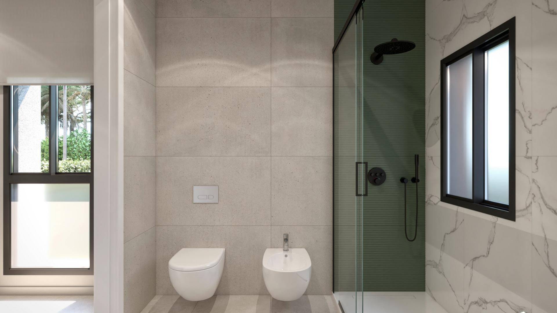 NYBYGDE VILLAER I PRIVAT INNGJERDET FERIESTED I PROVINSEN MURCIA Nybygde villaer i privat inngjerdet feriested i Murcia-regionen, omgitt av utmerkede golfbaner og bare 10 minutter fra sandstrendene i Mar Menor-havet. Villaer bygget over 2 etasjer og har 3 soverom, 2 bad og et gjestetoalett og er designet med en moderne stil og åpent konsept, bestående av et fullt utstyrt kjøkken og stue / spisestue, garderober, privat hage med basseng og parkeringsplass utenfor veien, privat solarium. Stor villa på 146 m² pluss en veldig nyttig kjeller på 120 m² ferdig med glatte vegger, vann og elektriske punkter. Dette gir den perfekte muligheten til å bruke som ekstra innkvartering, kontor, treningsstudio, kinorom, lekerom for barn.... Ligger i et privat inngjerdet feriested, med en hovedinngang og 24 timers sikkerhet. Anlegget er designet rundt et imponerende grøntområde på 126 000 m2. Det består av gang- og sykkelstier, idrettsanlegg, padle- og tennisbaner, en minigolfbane, hager, hundeparker, fritidsområder, klubbhus.... Også i det sentrale området er juvelen i feriestedet, en krystallklar kunstig innsjø på nesten 17.000m2 vannoverflate, omgitt av hvite sandstrender og palmer, og bringer et stykke Karibia til Murcia-regionen. Det er 2 øyer i innsjøen, en av dem har sin egen bar, det er også "strand Chiringuitos" spredt rundt innsjøen. Anlegget ligger strategisk plassert mindre enn 4 km fra stranden og byen Los Alcázares, hvor du kan utøve forskjellige vannsport, omgitt av flere golfbaner og byen Cartagena mindre enn 15 minutter med bil og 22 km fra Murcia flyplass, og har derfor et bredt kulturelt, gastronomisk og sportstilbud innen rekkevidde.
