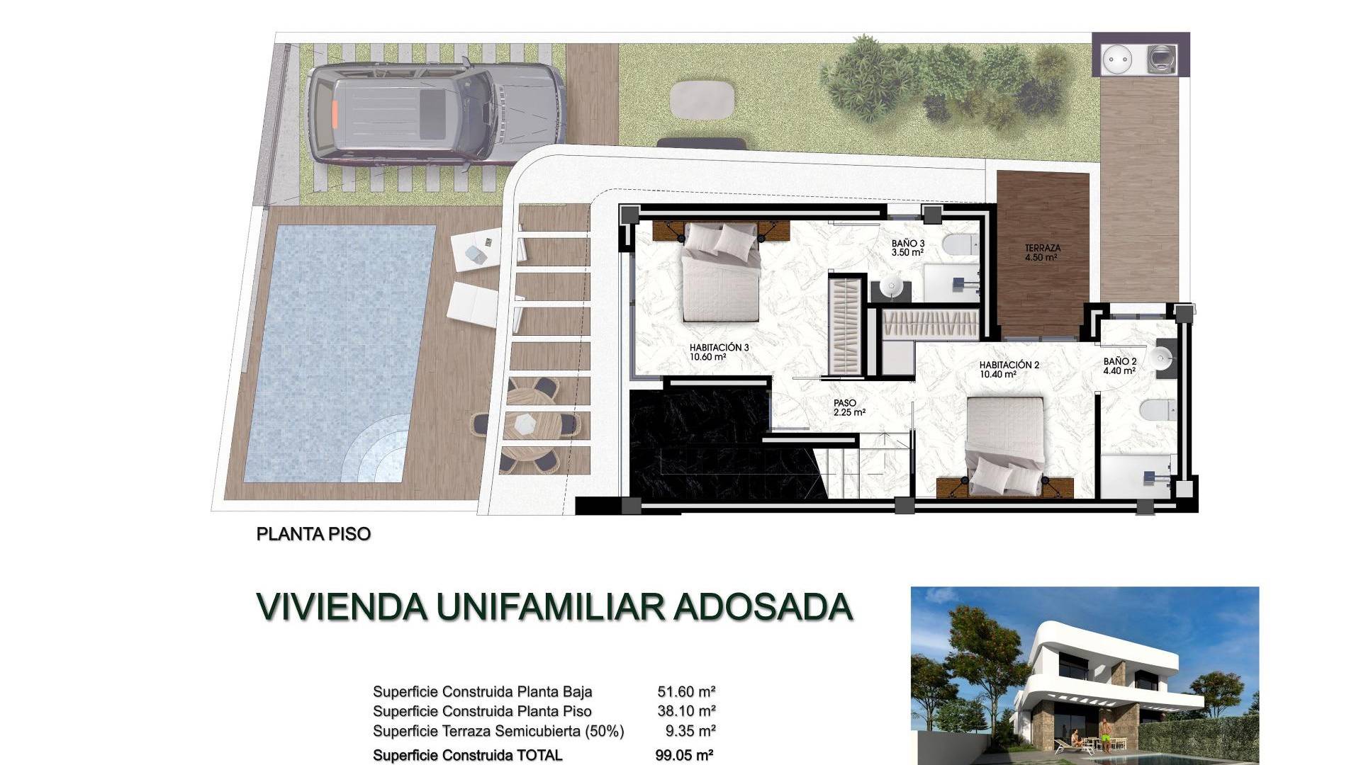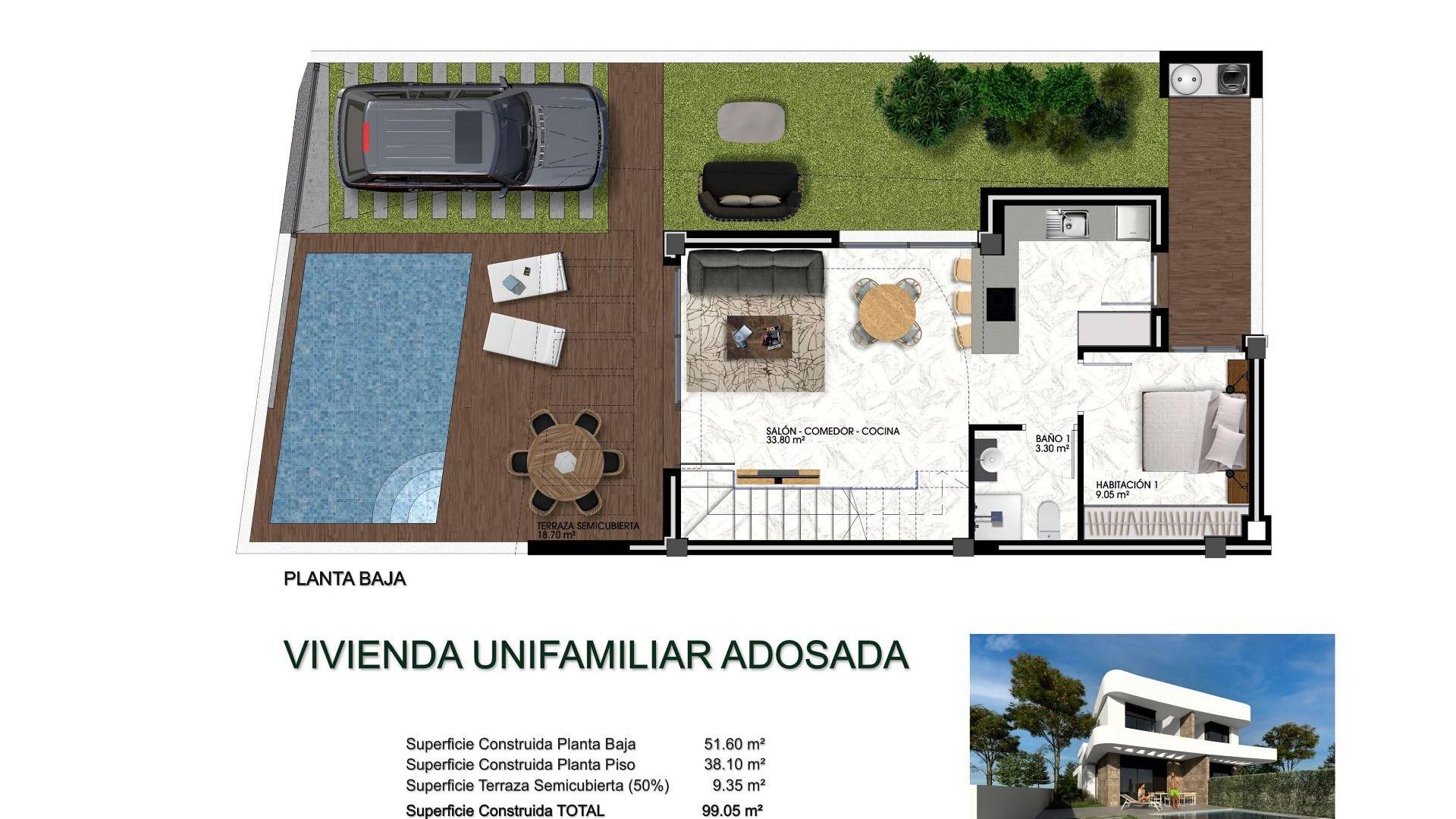 NOWE WILLE W ZABUDOWIE BLIŹNIACZEJ W LOS MONTESINOS Projekt New Build znajduje się w La Herrada (Los Montesinos), w uprzywilejowanej lokalizacji w pobliżu najlepszych plaż Guardamar i ze wszystkimi udogodnieniami oferowanymi przez dużą gminę, taką jak Los Montesinos. Ten projekt ma 32 bliźniacze wille na dwóch piętrach z około 150m2 działki, dostarczane z najlepszym wyposażeniem, w tym solarium, ekrany kąpielowe, ogród wykończony sztuczną trawą najlepszej jakości dekoracyjnych elementów ogrodniczych, a także preinstalacja dla paneli słonecznych, gniazdo elektryczne i silnik bramy dla pojazdów. Ta willa ma 3 sypialnie, 3 łazienki, kuchnia na otwartym planie z salonem, wyposażone szafy, taras. Opcjonalny prywatny basen. Typowe miasteczko Los Montesinos jest strategicznie położone 10 minut samochodem od plaż i wypoczynku w Torrevieja (ze wszystkimi usługami dużego miasta: teatr, 2 szpitale, szkoły międzynarodowe, itp.), od kilku pól golfowych i z łatwym dostępem do autostrady A7, aby dotrzeć do lotniska w Alicante w 20 min. W urbanizacji są supermarkety i bary dla codziennych usług, będąc wiejskim i cichym środowisku. Klimat tego obszaru gwarantuje 300 dni słonecznych w roku ze średnią temperaturą 20ºC, co w połączeniu z bogatą gastronomią oraz działalnością kulturalną i sportową dostępną w okolicy sprawia, że obszar ten jest idealnym miejscem do ustanowienia drugiej rezydencji na wakacje lub spokojnego miejsca do życia na stałe.
