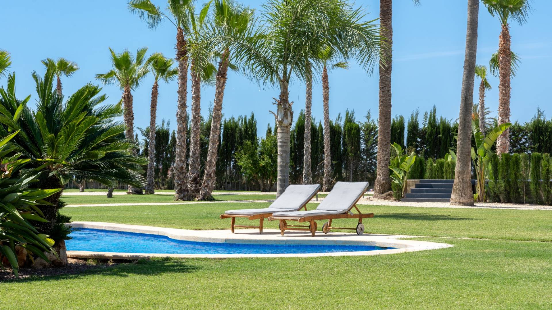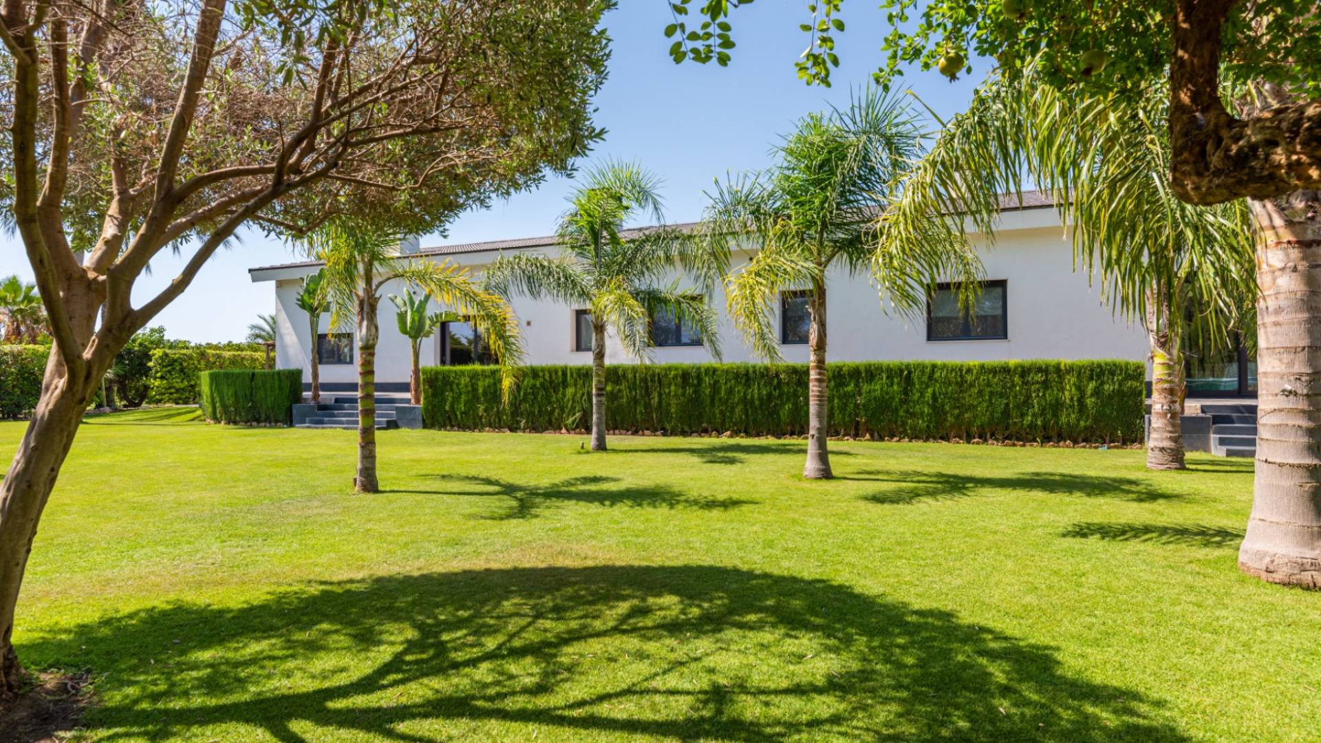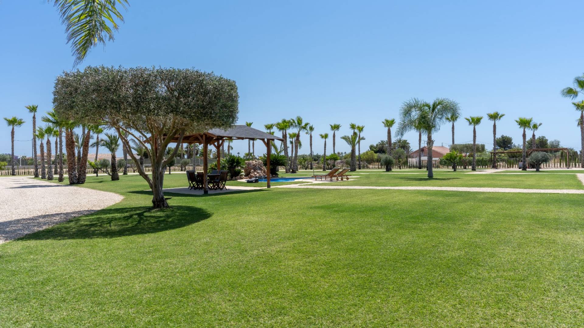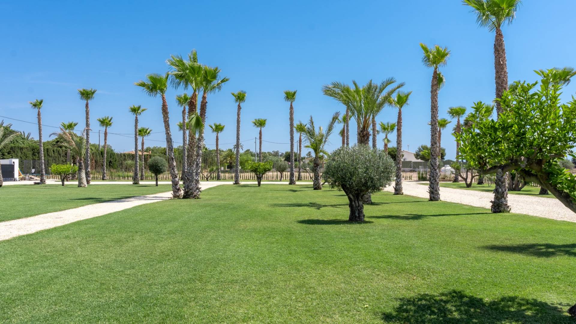 Działka 6.000 m² z palmami, oliwkami i 3.200 m² trawnika pielęgnowanego przez robota. Basen 8x3 m z naturalnym wodospadem. Całość ogrodzona, z roletami elektrycznymi i pełną prywatnością.