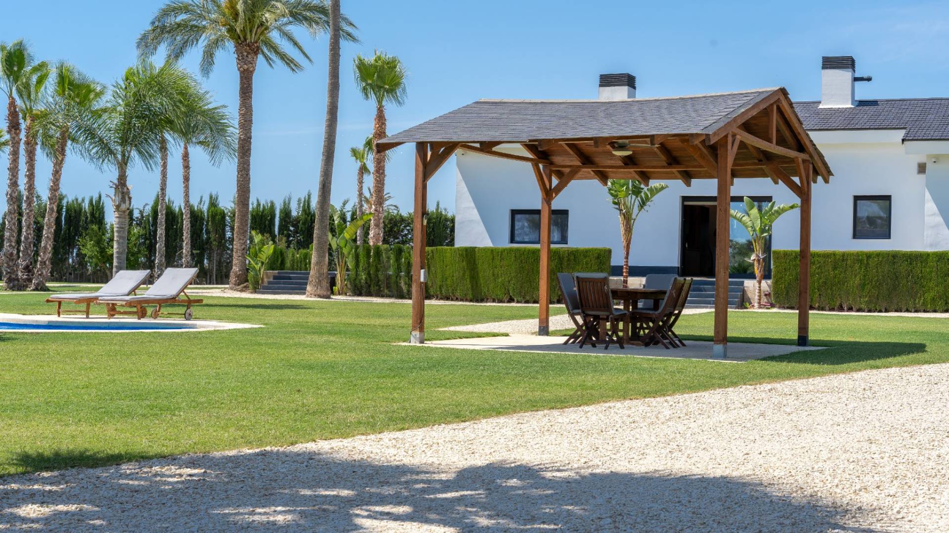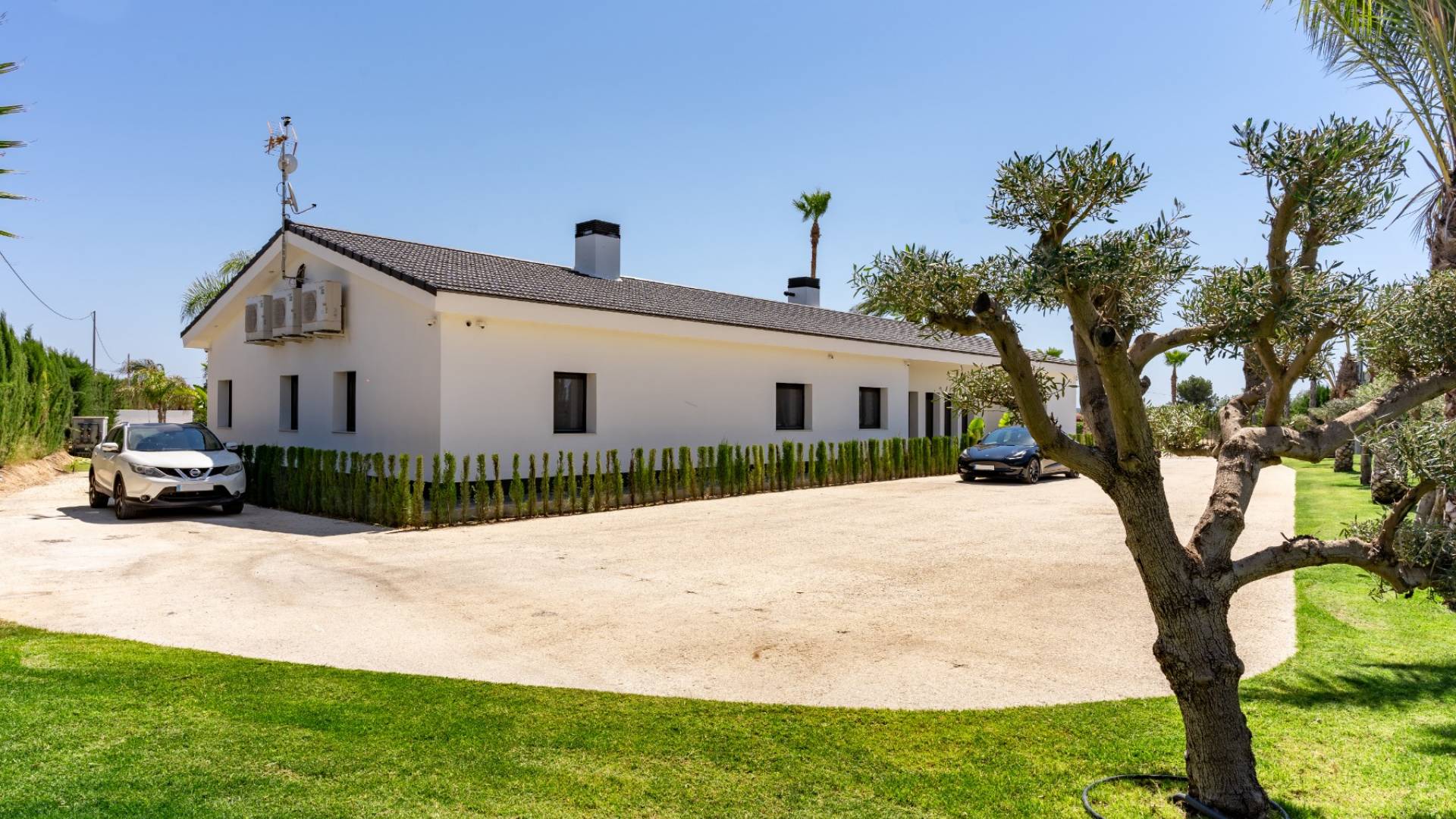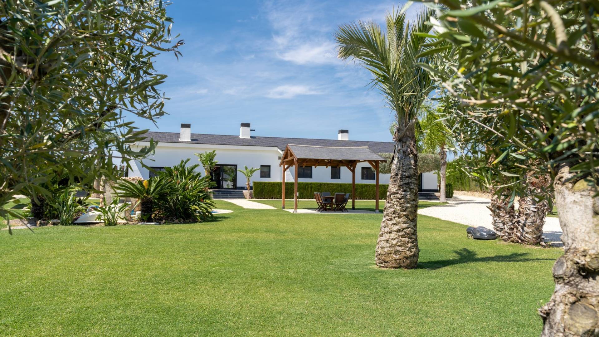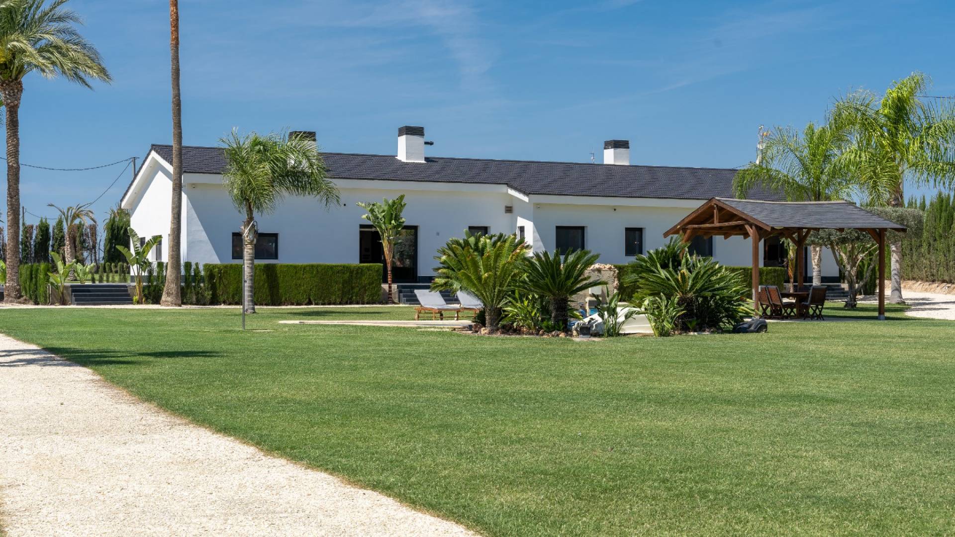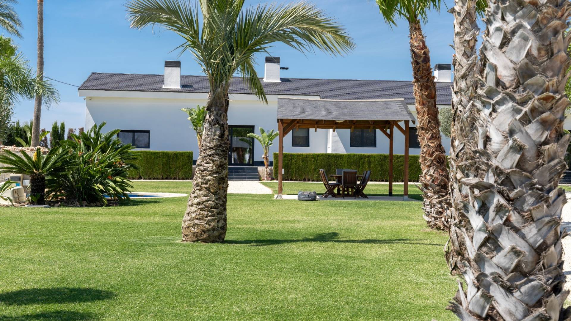 Działka 6.000 m² z palmami, oliwkami i 3.200 m² trawnika pielęgnowanego przez robota. Basen 8x3 m z naturalnym wodospadem. Całość ogrodzona, z roletami elektrycznymi i pełną prywatnością.