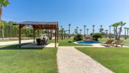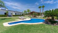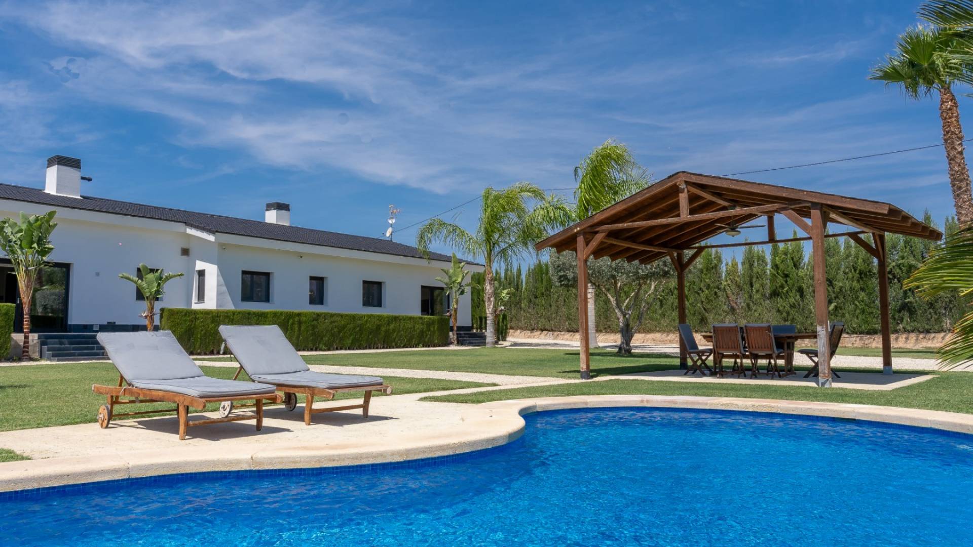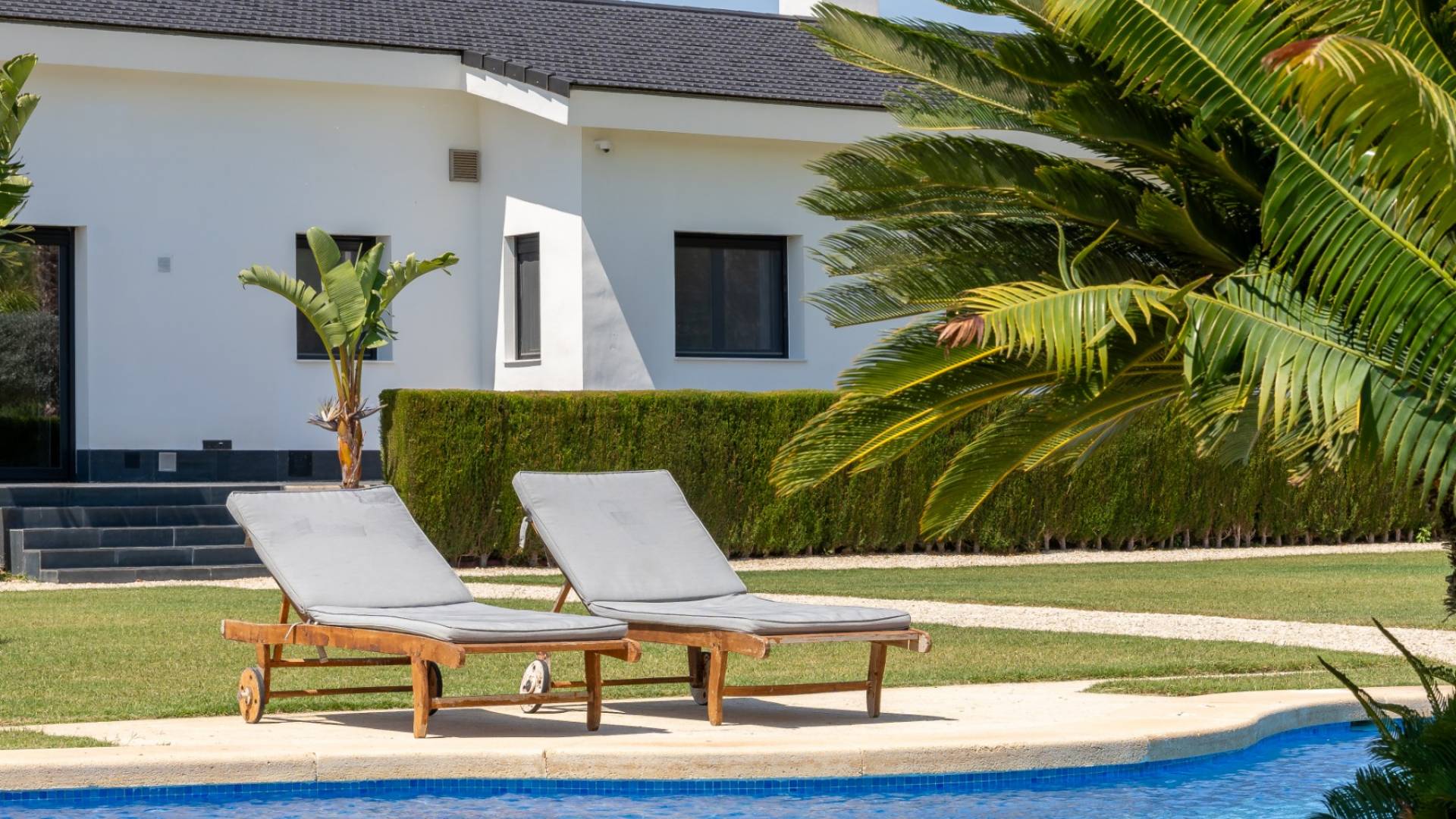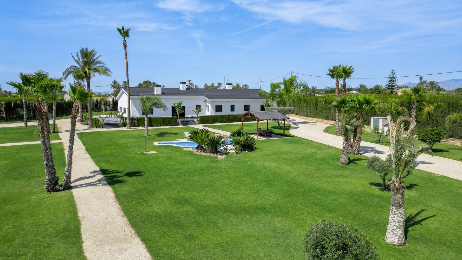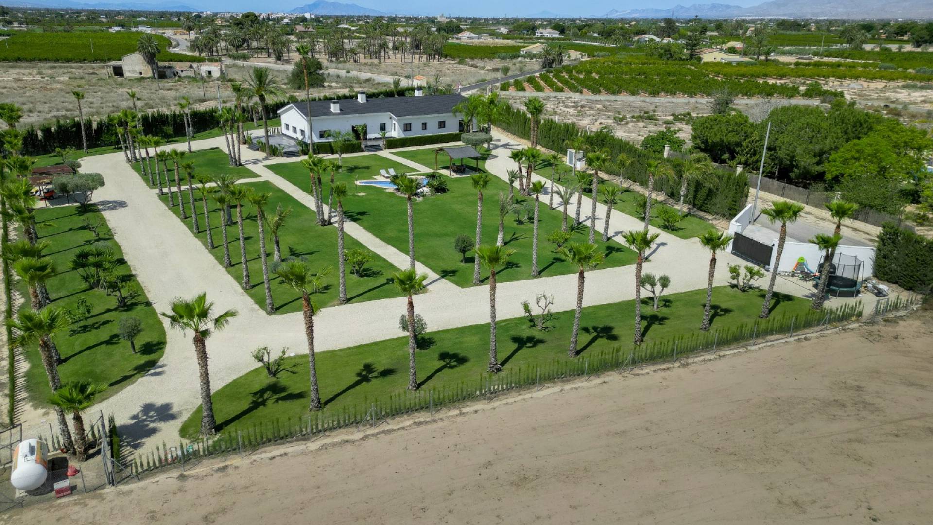 Działka 6.000 m² z palmami, oliwkami i 3.200 m² trawnika pielęgnowanego przez robota. Basen 8x3 m z naturalnym wodospadem. Całość ogrodzona, z roletami elektrycznymi i pełną prywatnością.