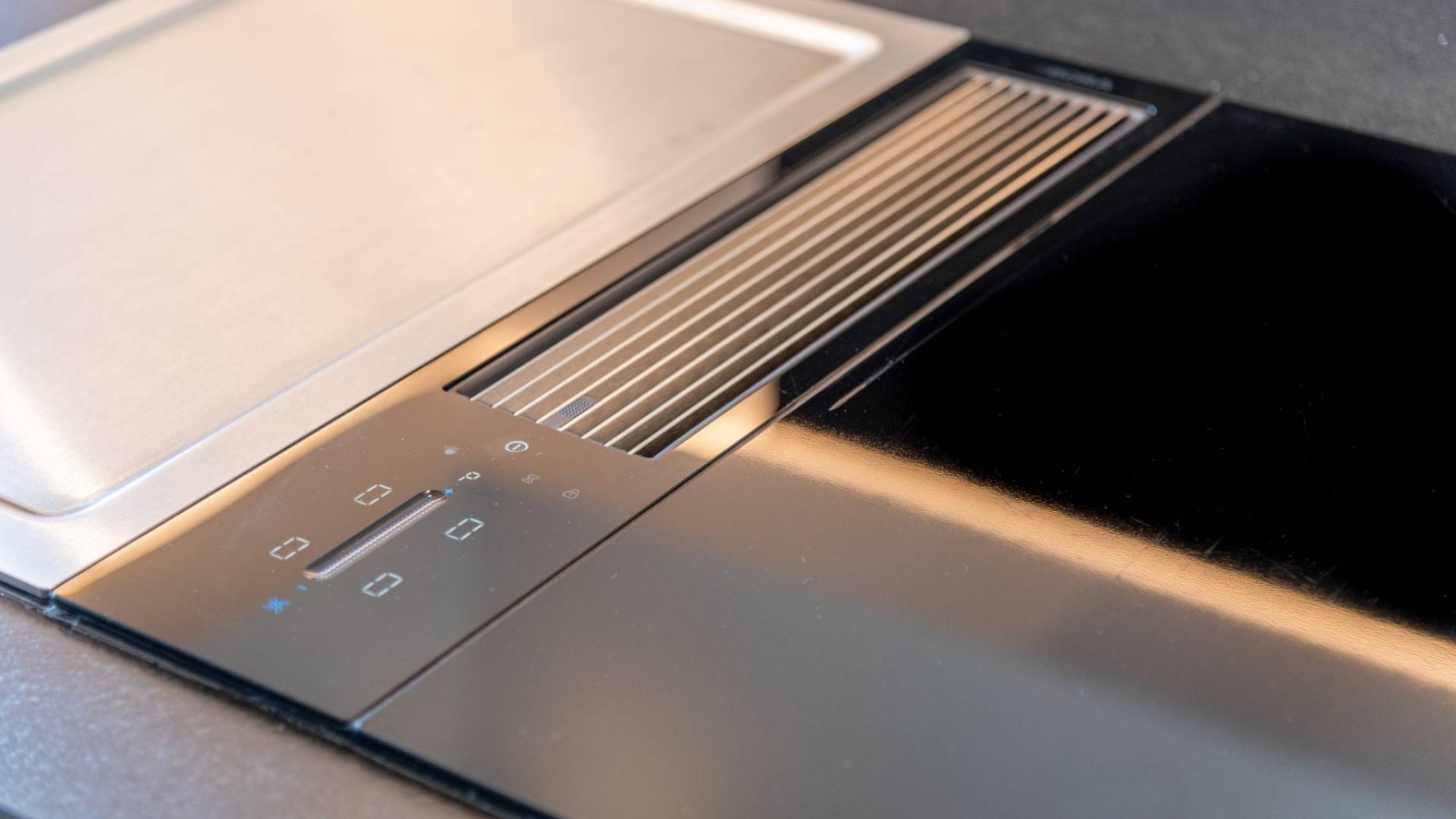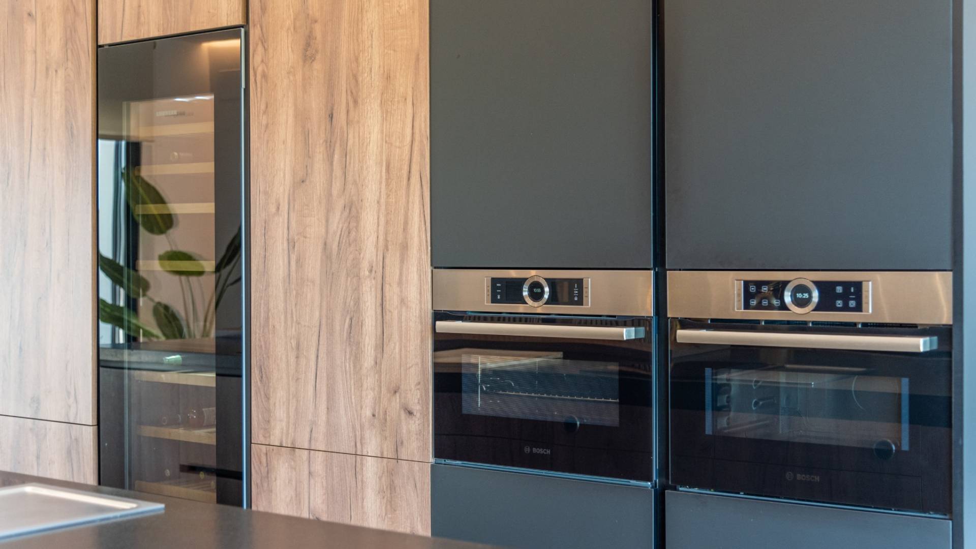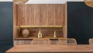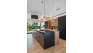Salon 45 m² z kominkiem i otwarta kuchnia 40 m² z urządzeniami Bora, centralną wyspą i winiarnią na 80 butelek – idealna dla miłośników gotowania i stylu.
