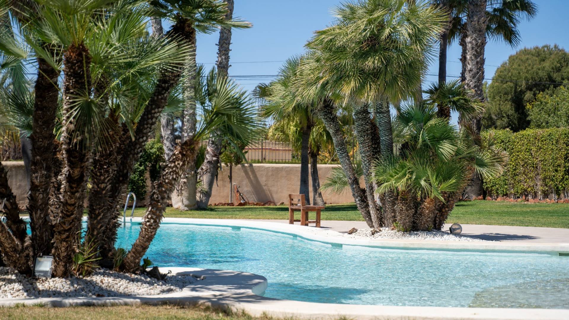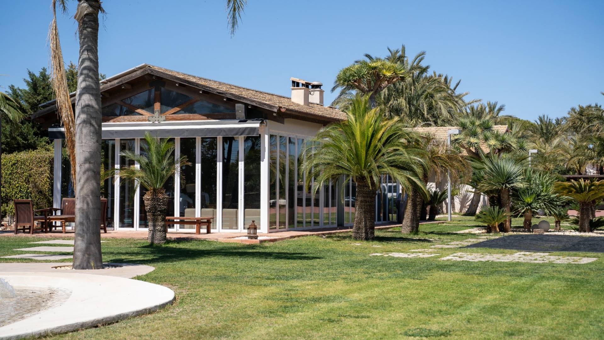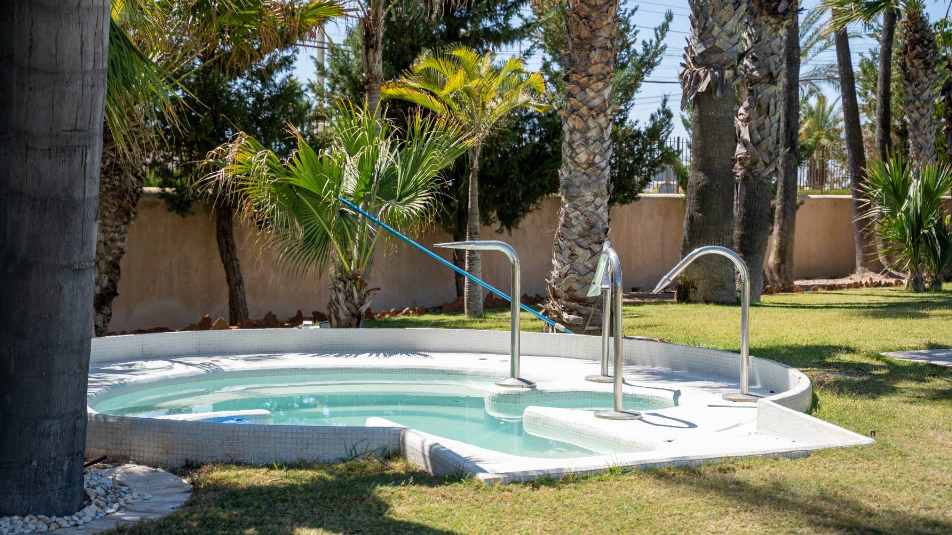 Przestronny ogród jest starannie pielęgnowany i zaprojektowany w stylu tropikalnym, idealny do relaksu i korzystania z klimatu śródziemnomorskiego. Na uwagę zasługuje imponujący basen otoczony palmami oraz jacuzzi na zewnątrz, mieszczące 12 osób, idealne na wydarzenia i chwile relaksu.