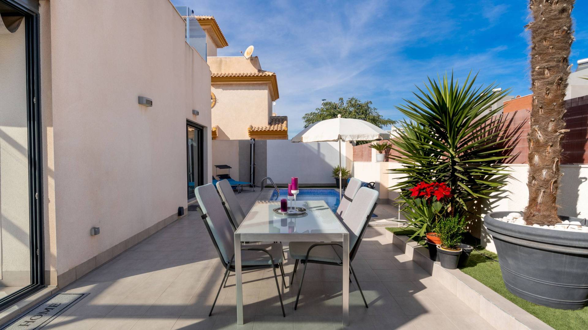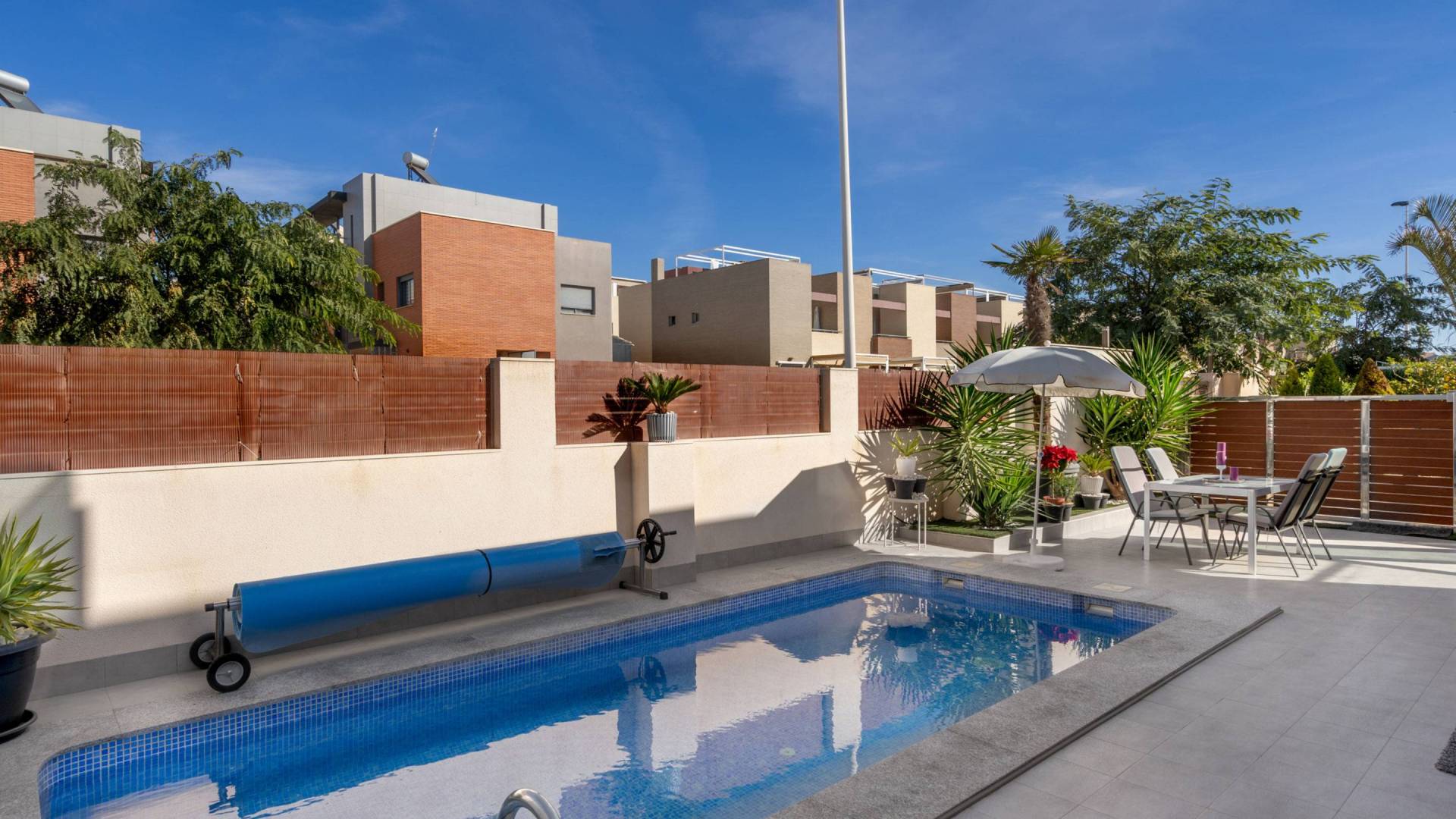 Oferujemy naszym klientom tę nowoczesną i dobrze utrzymaną willę położoną w popularnej dzielnicy Aguas Nuevas, na północ od centrum Torrevieja. Willa ma dwa piętra oraz piwnicę i taras na dachu. Na parterze znajduje się salon z kuchnią na otwartym planie, pomieszczenie gospodarcze, sypialnia i łazienka. Na piętrze znajdują się dwie sypialnie, łazienka i przestronny taras, który zapewnia również dostęp do tarasu na dachu, skąd można podziwiać piękny widok na okolicę. W piwnicy znajduje się kolejny pokój rodzinny, łazienka i dwa pokoje obecnie używane jako sypialnie. Na zewnątrz nieruchomości znajduje się prywatny basen, piękny przeszklony taras i dodatkowe patio, na którym można cieszyć się dobrą pogodą. Dom znajduje się na zamkniętym osiedlu. Willa jest postawiona się w bardzo popularnej okolicy, w pobliżu supermarketów, restauracji, barów, szkół i w odległości spaceru od słynnego piątkowego targu w Torrevieja. Stąd można dojechać rowerem do centrum handlowego Habaneras, centrum Torrevieja i znanej plaży La Mata. Torrevieja to tętniące życiem miasto przez cały rok, oferujące zajęcia dla wszystkich grup wiekowych i zainteresowań, takie jak kręgle, golf, zakupy lub po prostu spędzanie dnia na plaży. Jeśli szukasz przestronnej, nowoczesnej willi w doskonałym stanie dla całej rodziny, znalazłeś idealne miejsce. Witamy w nowym domu.