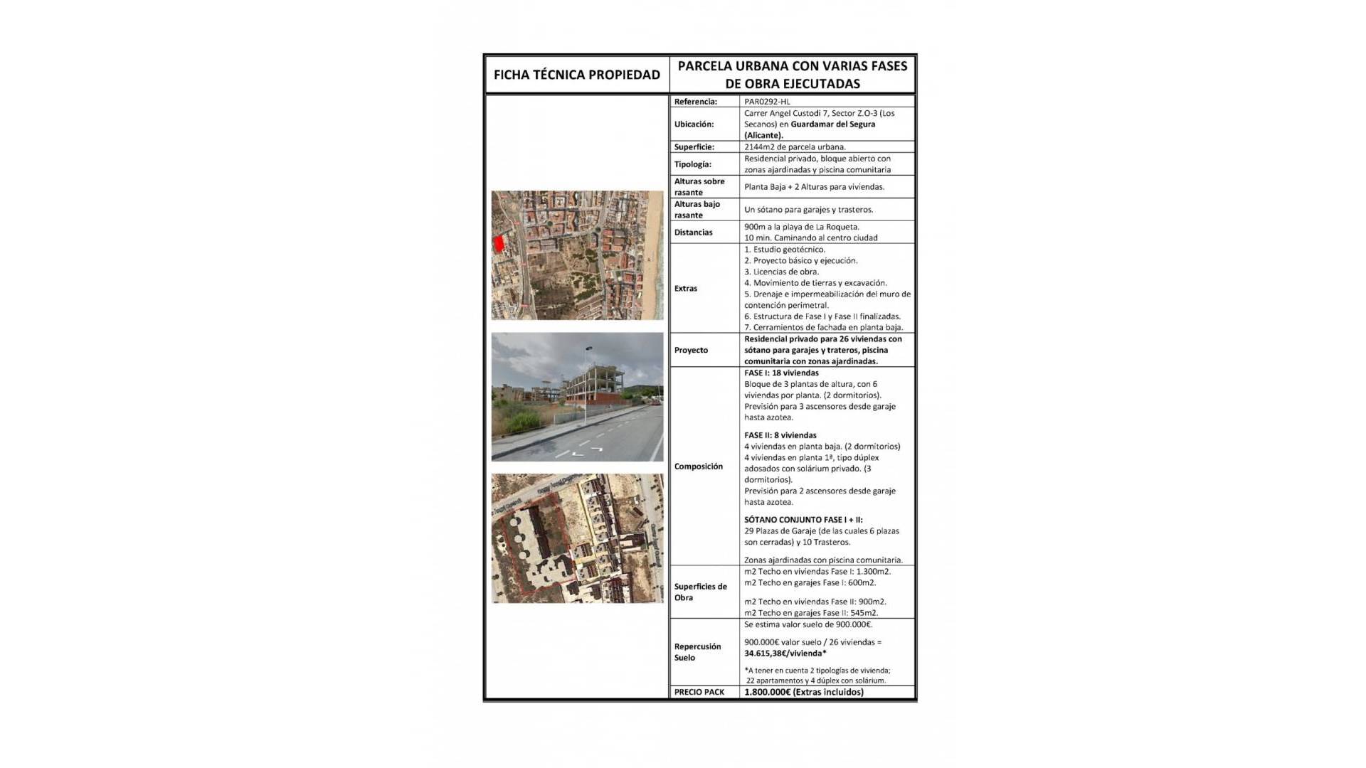 Na sprzedaż działka miejska o powierzchni 2144m2 z już wykonanymi różnymi etapami prac. Znajduje się w sektorze ZO-3 (Los Secanos) Guardamar del Segura. Obejmuje projekty, licencję na pracę i różne etapy już wykonanej pracy. Zabudowa dla 26 domów z różnymi typami domów; mieszkania i kamienice. W piwnicy byłoby 29 miejsc parkingowych i 10 komórek lokatorskich. Prywatne mieszkanie ze wspólnym basenem i ogrodami w Guardamar del Segura (Alicante) mniej niż 1 km od plaży Roqueta (Costa Blanca). Promocja składa się z dwóch etapów pracy: * I etap: 18 lokali mieszkalnych na parterze + 2 kondygnacje. * Faza II: 8 domów; 4 mieszkania na parterze i 4 kamienice na 1 piętrze. Mieszkalny z prywatnym basenem, ogródkami i piwnicą na 29 garaży i 10 pomieszczeń gospodarczych. Prognoza 5 wind (3 na Fazie I i 2 na Fazie II, z trasą z piwnicy do solarium społecznościowego). Spośród już wykonanych etapów pracy ma: * Projekty podstawowe i wykonawcze. * Studium geotechniczne. * Licencje na pracę. * Roboty ziemne i wykopy, * Drenaż i hydroizolacja ściany obwodowej. * Struktura Faza I i II. * Zabudowa elewacji na parterze. Cena gruntu z już wykonanymi licencjami, projektami i fazami prac: 1.800.000 € Działka miejska położona w dzielnicy mieszkalnej Z.O.- 3 sektor Los Secanos, blisko usług i niecały 1 km od plaży La Roqueta w Guardamar del Segura (Alicante).