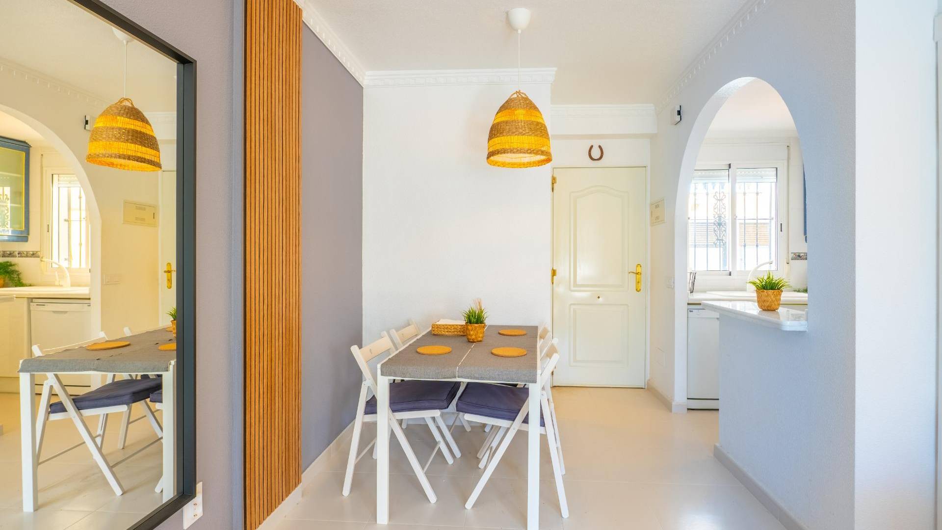 Prezentuję piękny, wyremontowany duplex położony w Algorfie — miejscu łączącym spokój, słoneczny klimat oraz naturalne otoczenie, co czyni je bardzo pożądanym miejscem do zamieszkania. Nieruchomość ma bardzo komfortowy układ pomieszczeń i sprzedawana jest w pełni umeblowana oraz po remoncie. Przestronny, jasny salon z wyjściem do ogrodu to jeden z głównych atutów domu, wypełniony naturalnym światłem przez cały dzień, tworząc ciepłą i przytulną atmosferę. Oddzielna, w pełni wyposażona kuchnia z meblami i sprzętem AGD. Dom posiada 2 umeblowane sypialnie oraz 2 w pełni wyposażone łazienki. Jasny taras pozwala cieszyć się widokami, a solarium na dachu to idealne miejsce do relaksu w słońcu. Dodatkowo do dyspozycji jest pomieszczenie gospodarcze – idealne do przechowywania rzeczy i utrzymania porządku. Jednym z wyróżniających się elementów jest również prywatny zamknięty garaż wraz z piwnicą. Nieruchomość znajduje się w zamkniętym kompleksie z zadbanymi terenami zielonymi i wspólnym basenem, w spokojnej i naturalnej okolicy. Miejsce wyróżnia się relaksującą atmosferą, bezpieczeństwem oraz łatwym dostępem do wybrzeża — idealny styl życia dla osób szukających spokoju i komfortu. Wśród głównych atrakcji znajduje się prestiżowe La Finca Golf Resort, doskonałe do rekreacji, sportu i gastronomii, a także doskonała lokalizacja zaledwie kilka minut od plaż i nadmorskiego klimatu Torrevieja. Połączenie z Alicante oraz resztą Costa Blanca umożliwia łatwy dostęp do lotnisk, sklepów i oferty kulturalnej. Słoneczny klimat przez większą część roku, międzynarodowe otoczenie i śródziemnomorska jakość życia sprawiają, że Algorfa jest idealnym miejscem zarówno na stałe zamieszkanie, jak i na drugie domy.