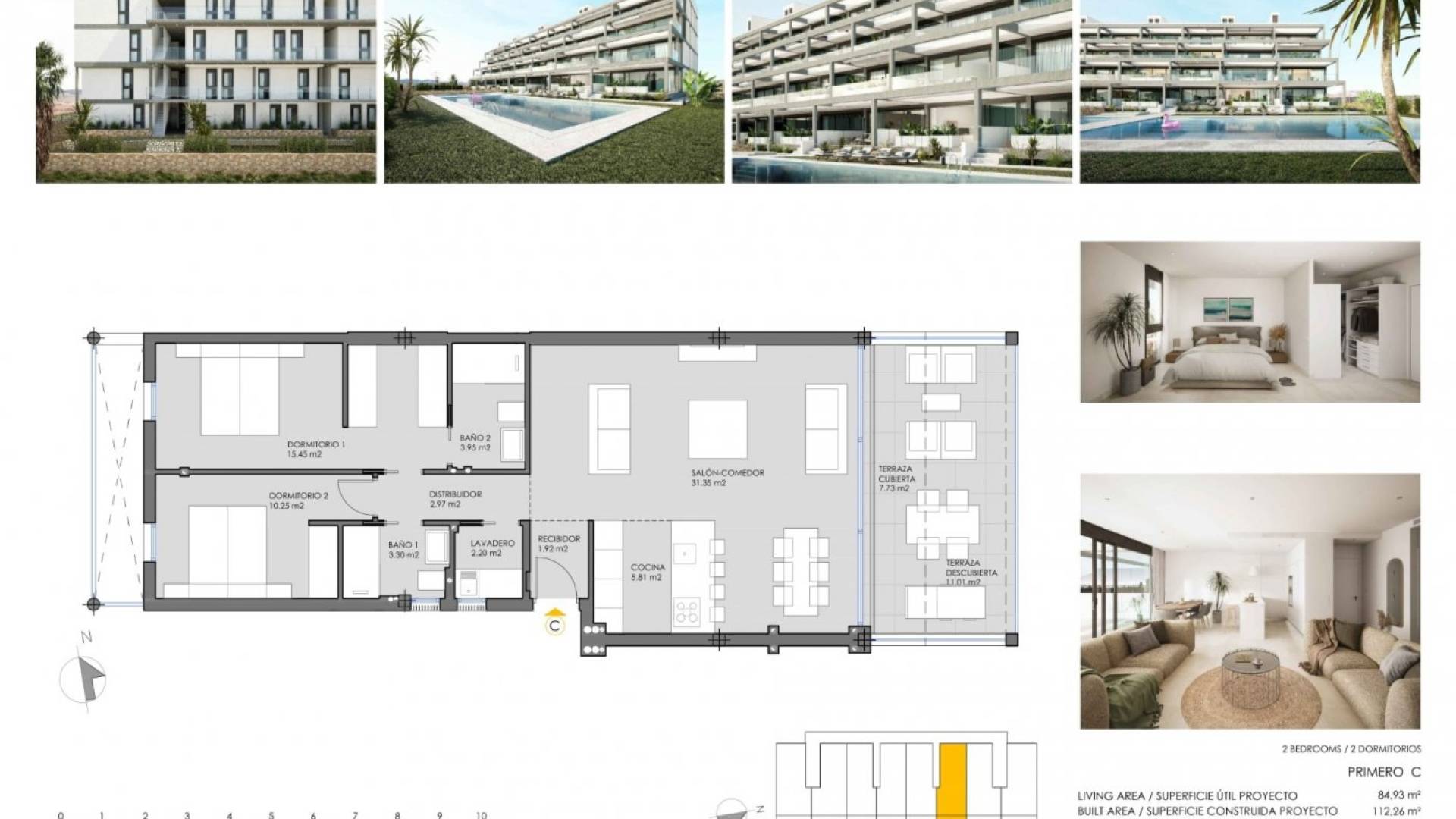 NEW BUILD RESIDENTIAL COMPLEX IN MAR DE CRISTAL New Build modern residential complex of apartments and penthouses located very close to the promenade and the long lovely sandy beaches of Mar de Cristal. You can choose from ground floor apartments with a private garden, mid-floor apartments with a terrace, and penthouses with private solarium. Properties has 2 or 3 bedrooms and 2 bathrooms. The apartments have a modern design, presenting an open plan living area, combining the kitchen, dining area and lounge, into a large space with access to the terrace. The master bedroom has a private bathroom. Built with top quality finishes, fitted wardrobes, pre-installation of ducted A/C, a storage room, and a underground parking space. All the daily necessities, like supermarkets, bars and restaurants, are available all year ‘round and are located close to the complex. Mar de Cristal has beautiful sandy beaches, a tennis centre, marina, supermarkets, bars and restaurants. The Calblanque national park where you will find unspoilt long white sandy beaches, as well as the famous La Manga Club and the bustling town of Los Belones are all within a 5 min drive from the village. Murcia airport is 25 mins and Alicante 1 hour drive. You can also visit the historic cities of Cartagena and Murcia.
