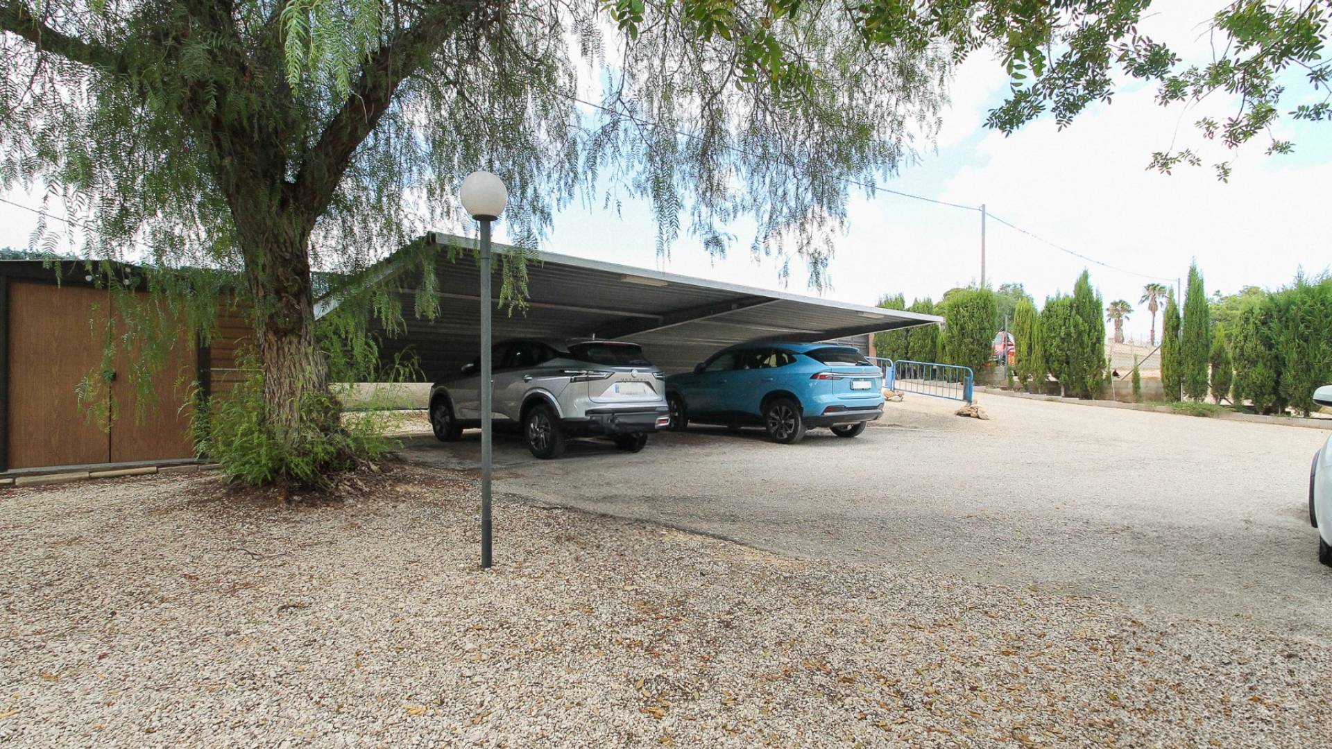 Covered outdoor parking for four vehicles.