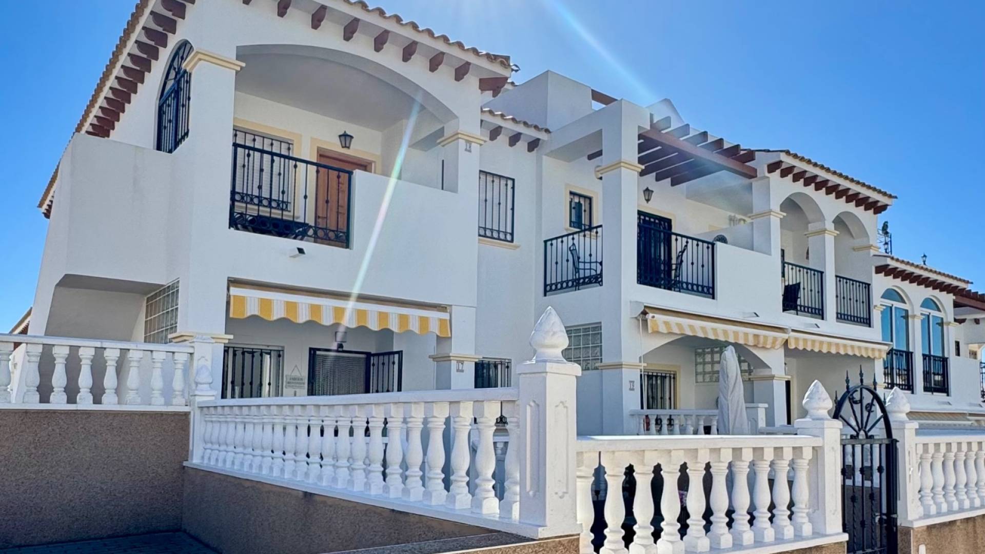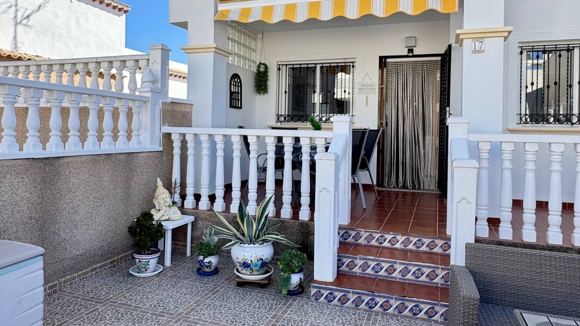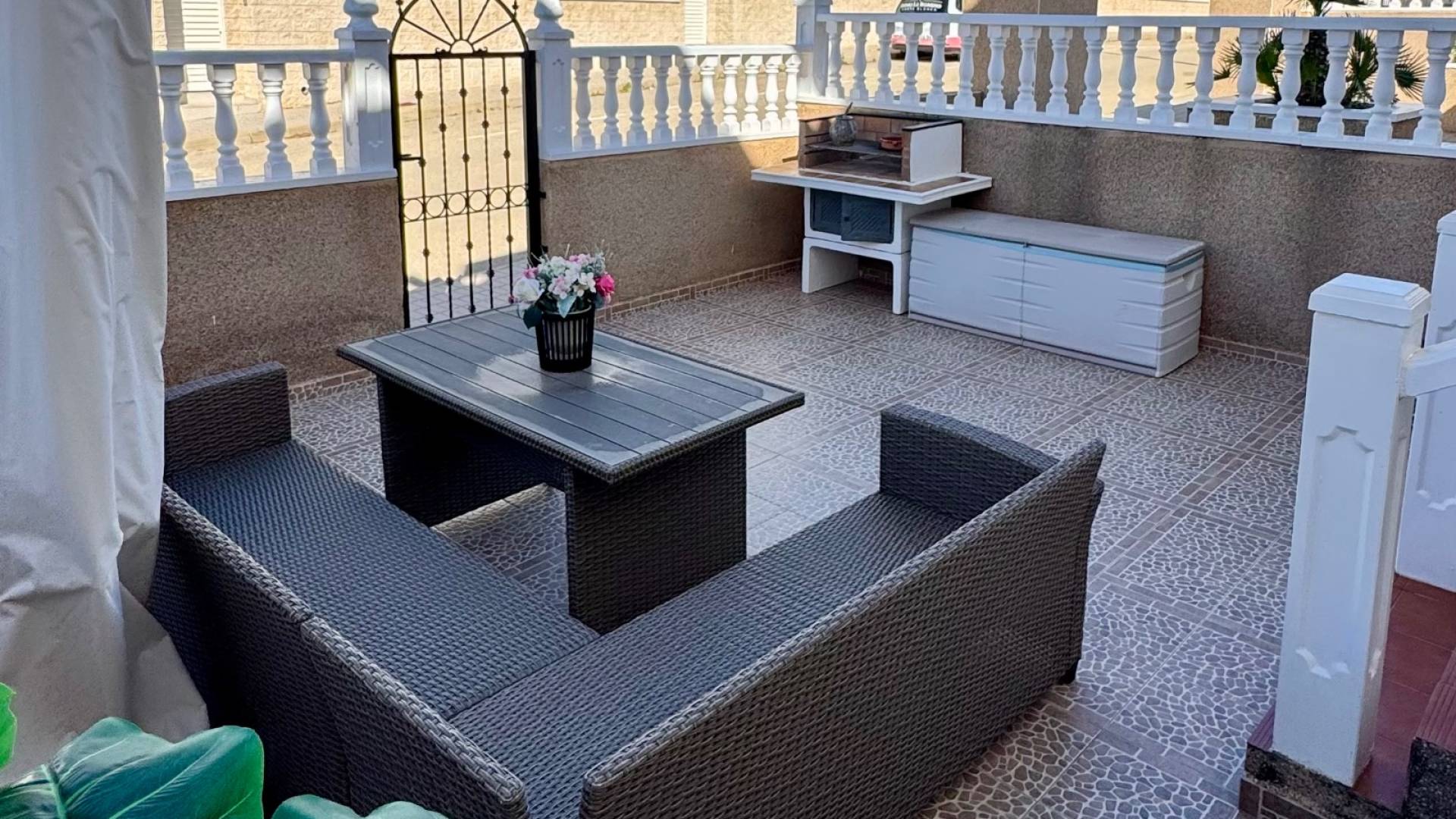 Located in a pleasant residential complex with a communal pool, this charming single-story bungalow offers an ideal setting for a sunny holiday. The property features two bedrooms and two bathrooms, a bright living room opening onto a covered terrace, and a large northwest-facing terrace that enjoys afternoon sun, perfect for soaking up the Mediterranean climate. The fully equipped kitchen is complemented by a covered back patio, conveniently accommodating the washing machine and water heater. The house also benefits from hot/cold air conditioning, ensuring optimal comfort year-round. In addition, the property includes an underground parking space and a storage cellar, providing valuable extra storage space. Its real advantage lies in its prime location between Punta Prima and Playa Flamenca, with all amenities within walking distance: shops, restaurants, and leisure activities. The sea is just 2 km away, allowing easy access to the beaches without a car. A practical, comfortable property perfectly located to fully enjoy the Costa Blanca.