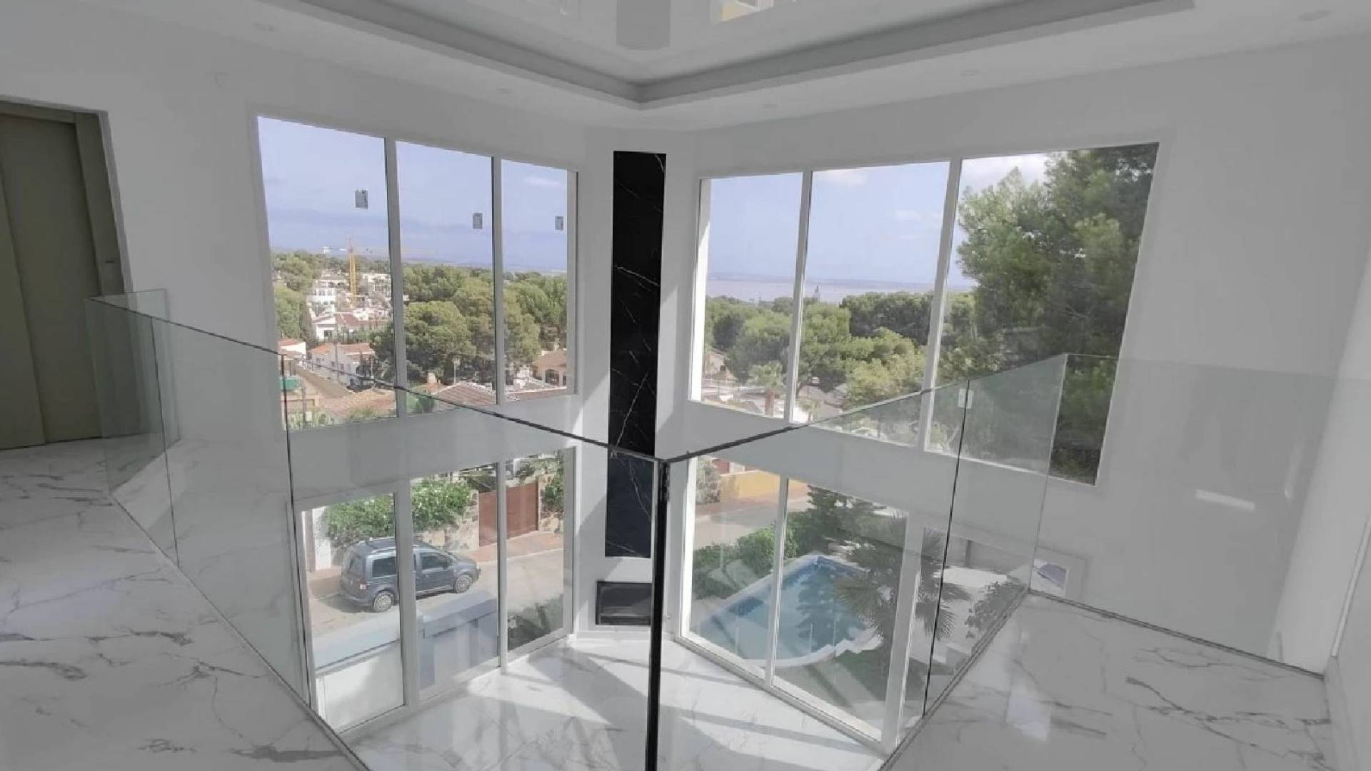 Villa for sale in the Los Balcones area. Built area 286 m², plot size 608 m². The villa is distributed over three floors and features six bedrooms, a living room with a fireplace, a separate kitchen, three bathrooms and an elevator.The ground floor offers 4 bedrooms, 2 bathrooms, a kitchen and a living room.The second floor has 2 bedrooms and 1 bathroom; one of the bedrooms has access to a 47 m² terrace. The house is equipped with an elevator.The property is sold unfurnished, so the buyer will be able to decorate the villa to their own taste.From the rooftop area, which can also be fitted out as a chill-out or leisure space, there are beautiful views of the pink salt lakes of Torrevieja.On the plot there is a large barbecue area and a big 8 x 4 m swimming pool with LED lighting. The house also has a large garage.Los Balcones is a residential area that belongs to the municipality of Torrevieja and is an ideal place to fully enjoy the mild Mediterranean climate, beautiful beaches and excellent leisure opportunities. It is a green area with many pine trees. The neighbourhood is just a few minutes’ drive from the centre of Torrevieja and the wonderful beaches of Orihuela Costa. Nearby you will also find large shopping and entertainment centres such as Habaneras and La Zenia Boulevard, offering a wide selection of shops and restaurants. For golf lovers, there are several golf courses with adjacent leisure areas close by, including Villamartin, Las Ramblas, Campoamor and Las Colinas.Online purchase is possible, as well as bank financing at 3–6% per annum.When buying property in Spain, you can obtain a residence permit. Our company assists with arranging residence permits of any type.