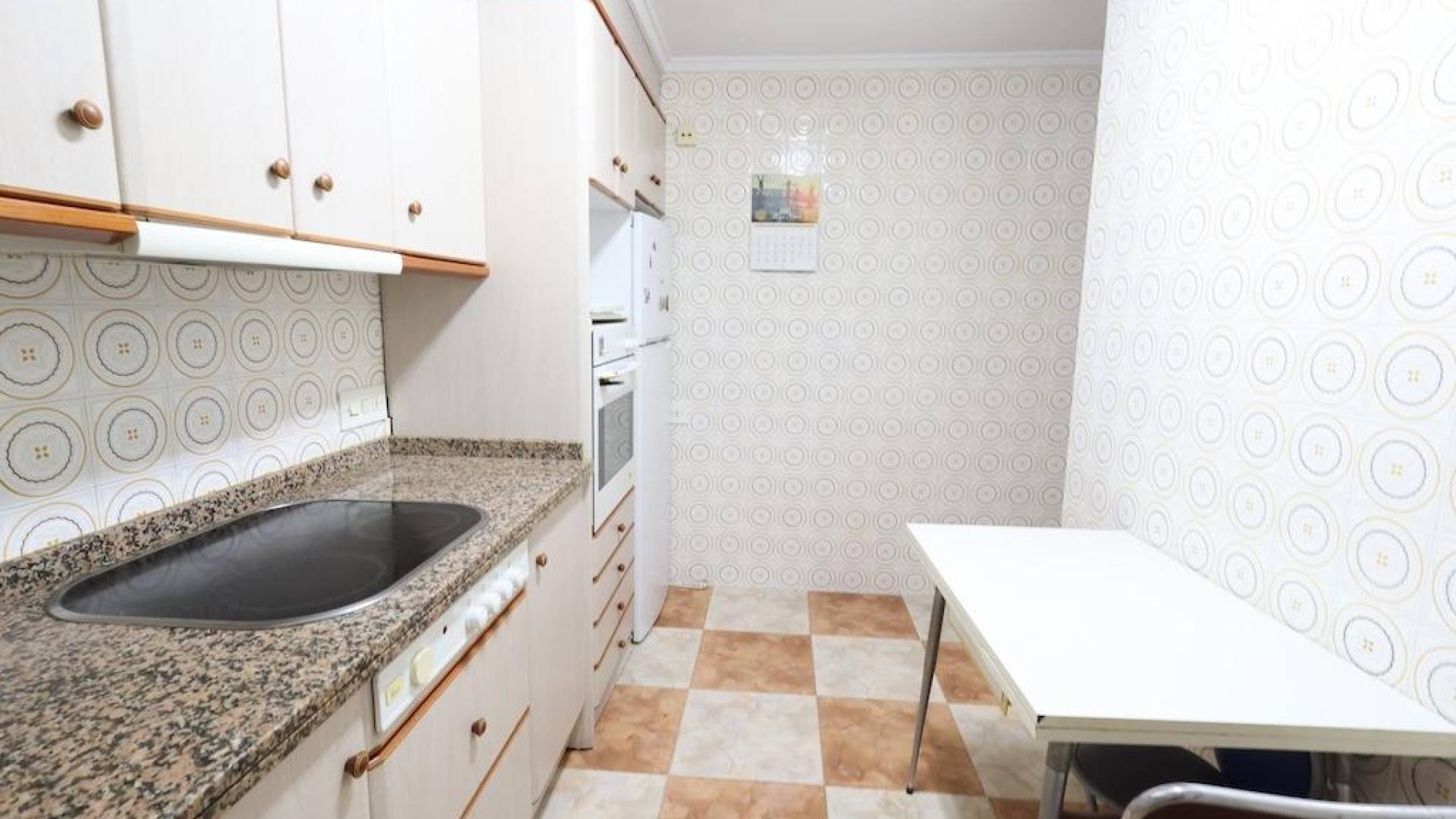Torrevieja Center – Calle Azorín 3rd-floor south-facing apartment (with elevator). 117 m2, 3 bedrooms, 2 bathrooms, large independent kitchen, living-dining room, and terrace. Sold fully furnished and equipped with AC. Side sea views.. . Optional garage available nearby!