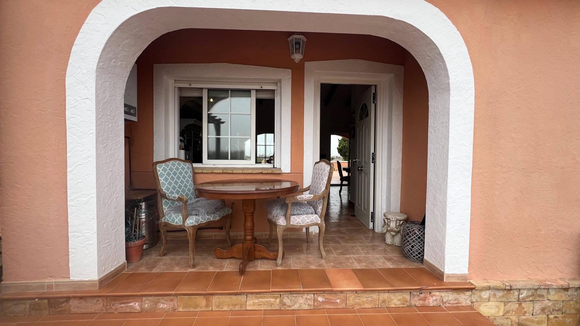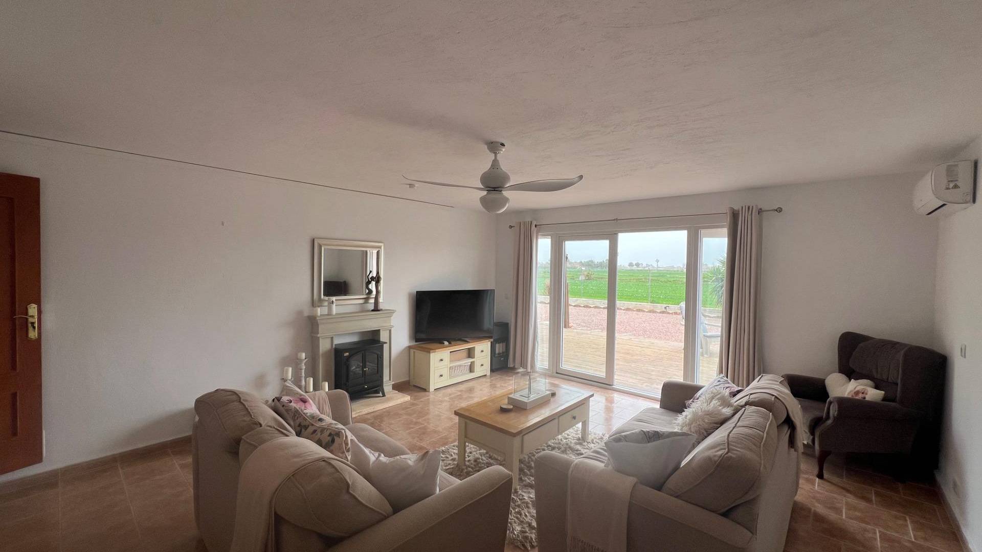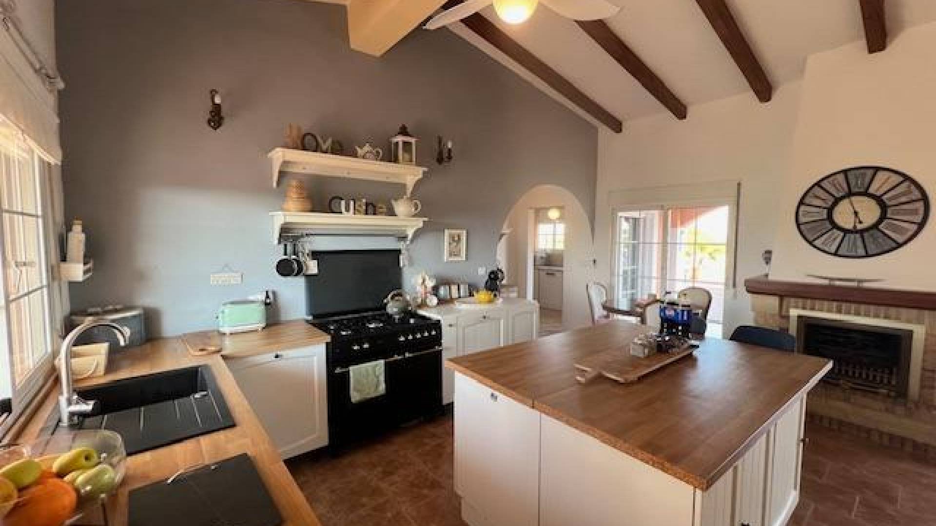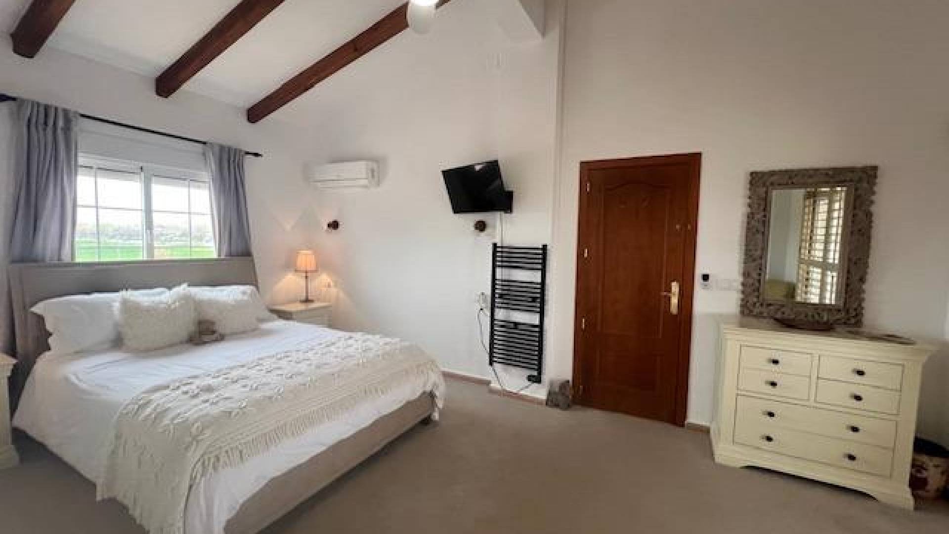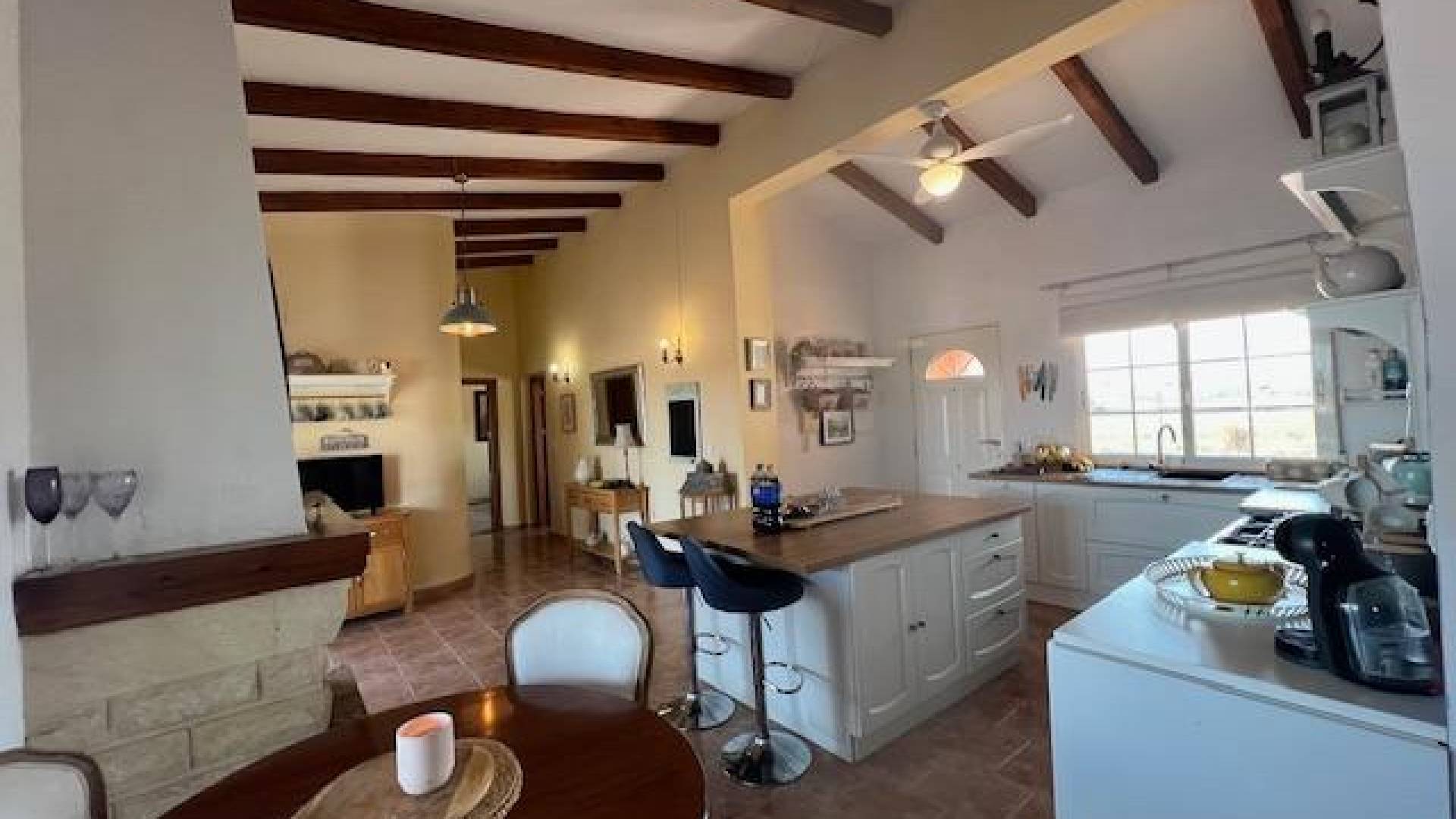 Stunning country house in Dolores, ALICANTE with 3 double bedrooms, 2 bathrooms, 2 walk-in wardrobes, lounge/diner with fireplace open kitchen, separate preparation kitchen, study andsecond lounge with access to decking area to the garden. The villa is on a fenced plot of 6,300m with a 10 x 5m pool with large terrace surround. Ideally situated in a peaceful rural setting although close to town and only 15 mins’ drive to beaches and 35 mins to the airport of Alicante/Elche. Enjoy the superb views from the rooftop sun terrace. Mains water and electricity via solar panels with back up generator.