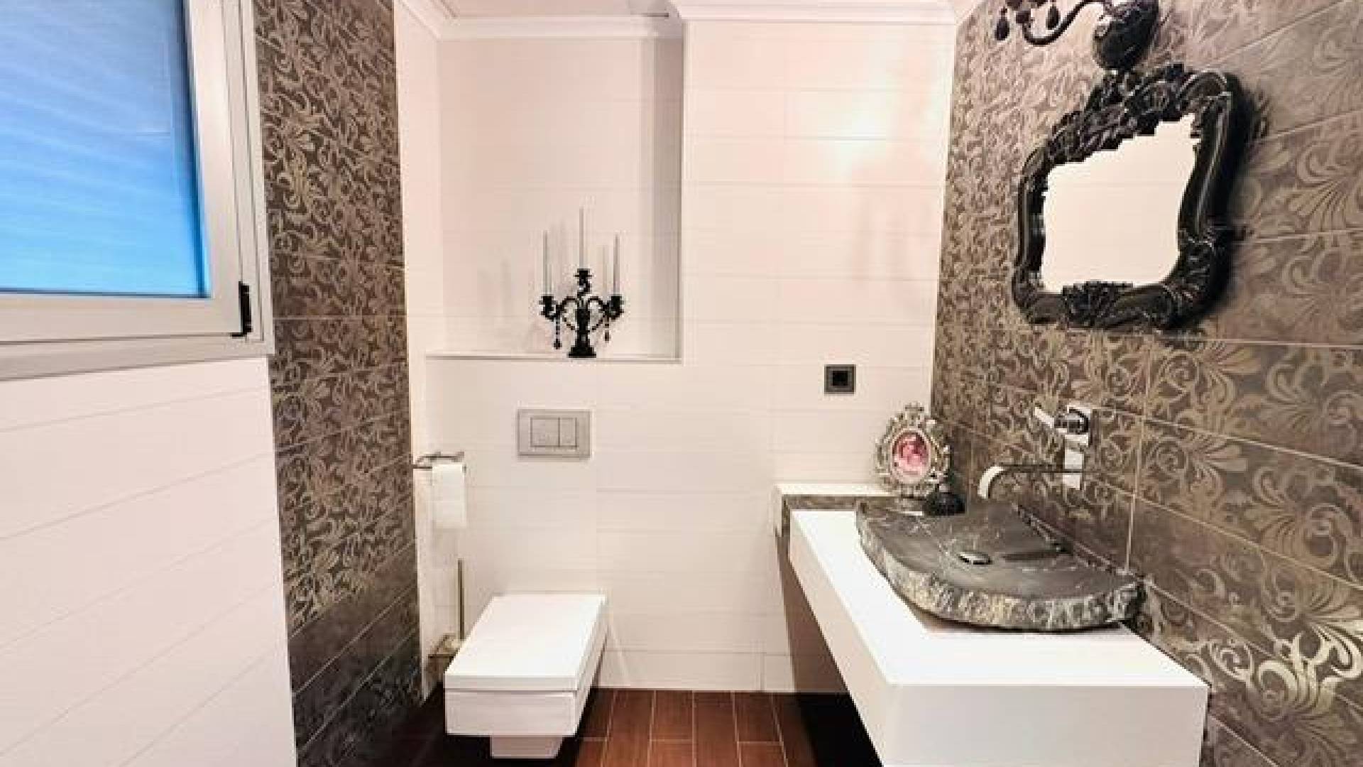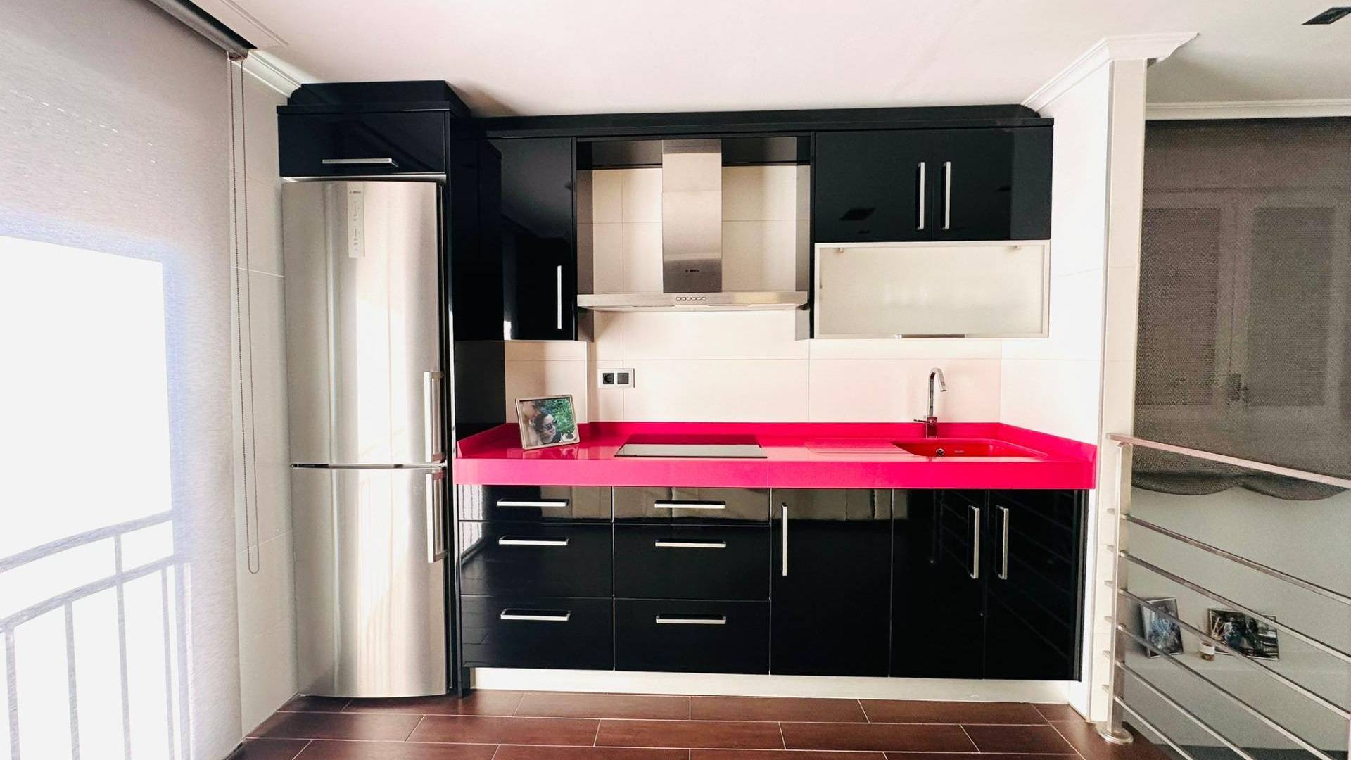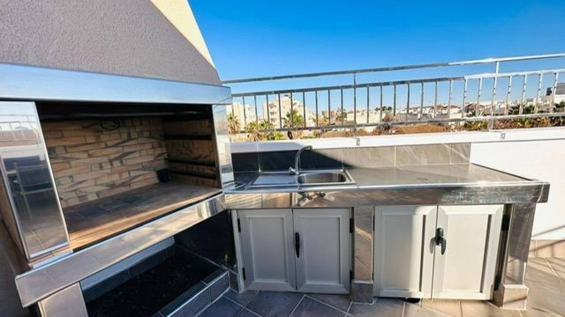 Beautiful luxury duplex penthouse located in Torrevieja, distributed over two floors of 90 square meters each. It consists of 3 double bedrooms, a full bathroom with shower and jacuzzi, and a separate kitchen. The second floor consists of a living room with an open kitchen of 50 m2, a toilet with shower, and a 25 m2 terrace with barbecue and laundry room.