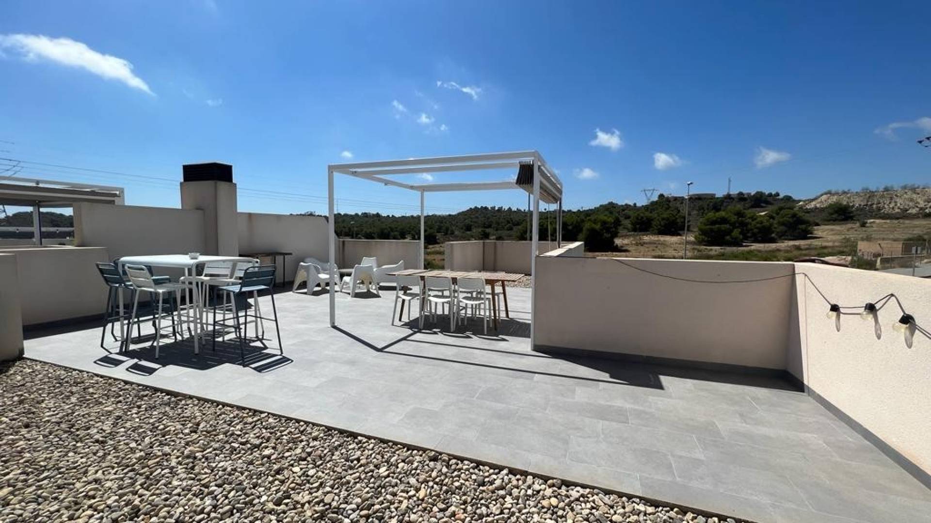 Luxury modern flat with 3 bedrooms with vieuws. This beautiful south-facing flat in the Salinas residence in San Miguel de Salinas is accessed via an external staircase and comprises 3 bedrooms, 2 bathrooms, one of which is en-suite to the master bedroom. The flat has a spacious living and dining room with open kitchen, a small open terrace next to the living room and external stairs to the private solarium. For your comfort there is air conditioning and ceiling fans, a security system and fully furnished.It is located in a small modern community with a beautiful tropical pool.From the solarium you have beautiful views of the pool, nature, the salt lakes and in the distance sea views where you can blissfully enjoy hot summer days under a nice pergola for shade.The flat currently has a tourist licence and has proved very popular with holidaymakers, generating a significant income stream for the owners. So an ideal investment!San Miguel de Salinas is a very popular Spanish village just a 10-minute to 15-minute drive from the beaches Cabo Roig, Campoamor, Mil Palmeras, La Zenia ... and surrounded by beautiful countryside with citrus and almond orchards . For golf lovers, there are 5 golf courses in the area.