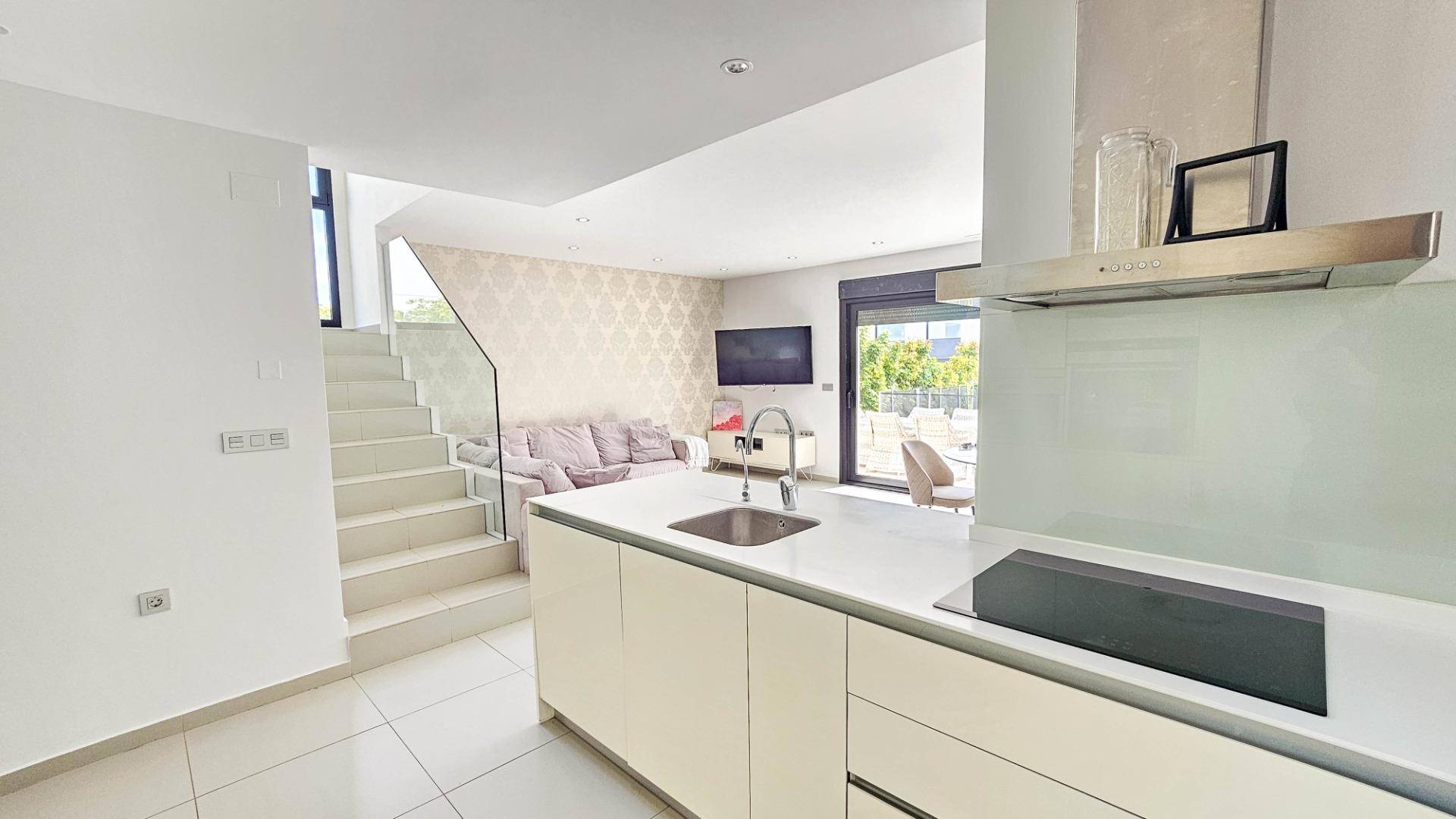 We present this magnificent modern-style villa, located in a peaceful and well-connected residential area — an ideal place for those who value comfort, privacy, and a high standard of living. Built in 2014, this property combines contemporary design with high-quality materials and a thoughtful layout, ensuring maximum convenience in every room. The villa has a total built area of 125 m² on a 300 m² plot. The house spans two floors, with a spacious rooftop solarium — a perfect spot for sunbathing and enjoying open views all year round. On the ground floor, there is a bright and spacious open-plan living-dining area connected to a fully equipped modern kitchen. Here is also the master bedroom with a walk-in closet, a full bathroom, and a guest toilet, all with direct access to the garden and private pool. On the second floor, there are two additional large bedrooms and another full bathroom, all filled with natural light and with access to a private terrace. An external staircase leads from this floor to the solarium, creating a private space for relaxation, entertaining, or enjoying the Mediterranean climate. The villa is equipped with central air conditioning, underfloor heating throughout, and is sold fully furnished, ready to move in. The outdoor area combines relaxation zones with a stunning private pool, creating ideal conditions for enjoying the outdoors in complete privacy. Additionally, there is a parking space on the property, ensuring convenience and security. The modern architectural style, high-quality finishes, and spacious interiors make this villa an excellent option for permanent residence or a vacation home. This villa embodies the essence of Mediterranean comfort: space, light, style, and an excellent location in a quiet and convenient area. A perfect home for those who want to enjoy the sun, privacy, and luxury to the fullest.