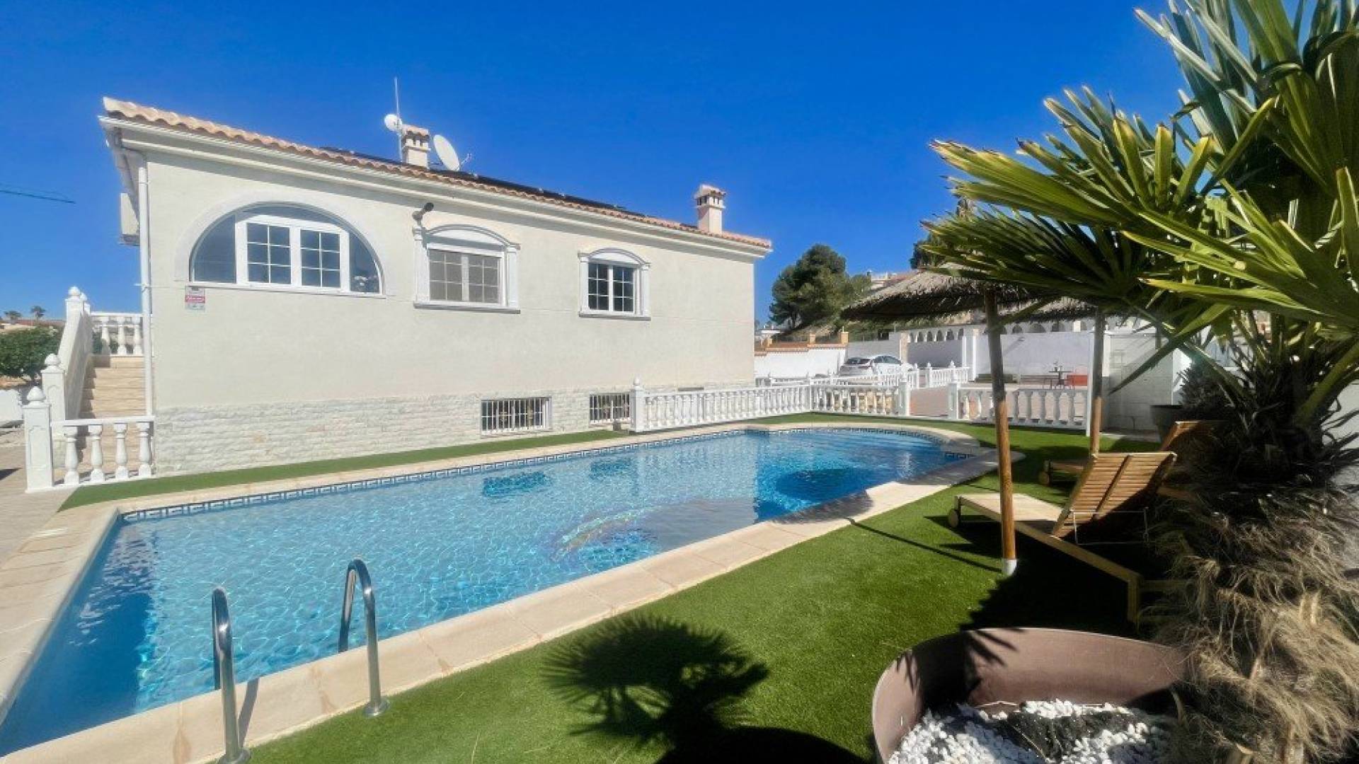 wp:paragraph We are delighted to present this fantastic five-bedroom, two-bathroom detached villa with private swimming pool, ideally located in the prestigious La Escuera area of La Marina Urbanisation. Offering 308 m² of built space arranged over two levels and set on a generous 980 m² plot, this property represents the perfect blend of comfort, space and Mediterranean lifestyle. The villa is in very good condition, beautifully maintained, bright and ready to move into. Situated within the sought-after La Escuera residential area, the property enjoys a peaceful setting while remaining close to local amenities and the stunning Blue Flag beaches of La Marina. It is an ideal location for those seeking tranquillity without compromising on convenience or proximity to the coast. The upper level features two spacious and tastefully designed bedrooms, both filled with natural light and offering pleasant open views. The family bathroom on this floor is finished to a high standard and offers a spa-like atmosphere, complete with a large bathtub, separate walk-in shower and double washbasin. The lower level comprises three additional bedrooms, two of which include fitted wardrobes, making them ideal for family members. A second full bathroom provides added convenience, and there is also a useful storage room. The basement benefits from a quality ventilation system specifically designed to prevent damp and odours, ensuring a dry, fresh and comfortable environment throughout the year. The exterior of the property is truly impressive. The large private swimming pool is surrounded by relaxation areas, creating a perfect setting for enjoying the sunshine. A dedicated chill-out space provides the ideal spot to unwind during the day or enjoy warm Mediterranean evenings in complete serenity, there are solar panels in the house producing clean, renewable energy and reducing your long-term energy costs. The expansive 980 m² plot offers endless possibilities, whether you envision landscaped gardens, a children’s play area or additional outdoor leisure spaces. The property holds a licence to build a substantial garage of great size where a Caravane can fits offering an excellent opportunity for those who has a Caravane. Combining generous living space, privacy and an enviable coastal location near the Mediterranean Sea, this villa is perfectly suited as a permanent residence, holiday home or investment opportunity. /wp:paragraph wp:paragraph /wp:paragraph