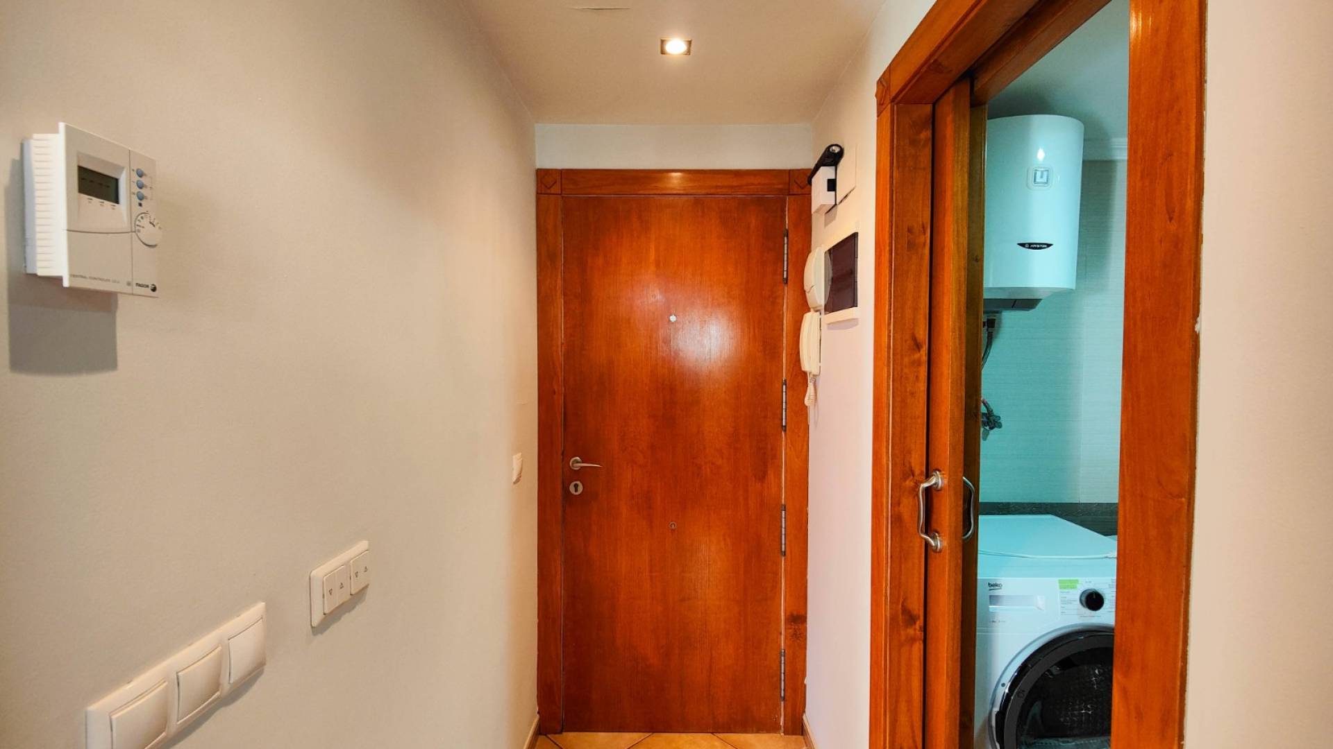 Exclusive ground floor corner apartment for sale in a closed front line residential at the La Mata Beach, one of the most sought-after areas of Torrevieja. The property features a spacious south-facing terrace of around 18m², overlooking the green areas of the residential complex. The perfect place to enjoy the sun all year round, have breakfast outdoors or relax after a day at the beach. The apartment includes 2 bedrooms with built-in wardrobes, 1 good size bathroom with walk-in shower, and an open-plan kitchen connected to the living room. The property has been partially renovated, including windows, flooring, electrical installation and bathroom. It is sold fully furnished and equipped with white goods, making it ready to move in.The property offers a lot of extras such as air conditioning, electric heating, electric shutters, security door, awnings, and much more. The residential complex offers a beautiful environment with a communal swimming pool surrounded by natural grass, palm trees and a pond, creating a true Mediterranean oasis.There is a small communal parking area outside the complex, a huge communal solarium with views over the La Mata beach, a social club and a concierge. The location is exceptional: the building is frontline, with direct access to the promenade and the La Mata beach, both just 50 metres from the apartment. An excellent opportunity as a holiday home, rental investment or permanent residence by the sea.