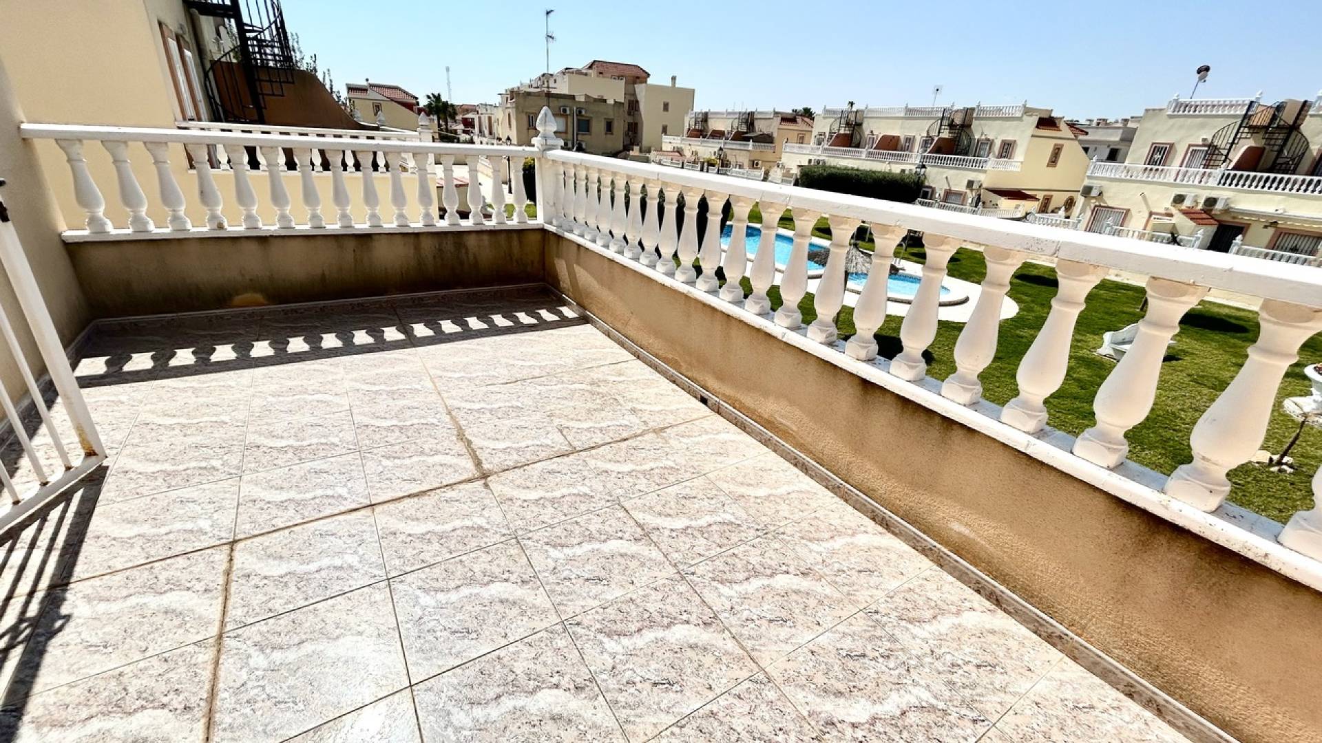 Discover this charming 3-bedroom, 2-bathroom semi-detached townhouse ideally located within walking distance of La Zenia Boulevard, offering the perfect blend of convenience, comfort, and Mediterranean outdoor living.At the front of the property, a sun-drenched private garden provides ample space not only for relaxing but also for secure off-road parking. To the rear, a spacious terrace opens directly onto the beautifully maintained communal pool area, creating a seamless indoor-outdoor lifestyle perfect for entertaining, sunbathing, or enjoying family time.The ground floor features a bright and welcoming living and dining area, a fully equipped kitchen, and a convenient double bedroom, ideal for guests or single-level living.Upstairs, you’ll find two generous bedrooms, each with its own private terrace, offering peaceful spots to enjoy morning coffee or evening sunsets. One of the terraces provides access to a private solarium, delivering additional outdoor space and panoramic views—perfect for soaking up the year-round sunshine. A well-appointed bathroom serves this level.Whether you’re searching for a permanent residence, holiday retreat, or investment property, this home offers an unbeatable location, fantastic outdoor spaces, and direct access to communal amenities—all just moments from shops, restaurants, and beaches.
