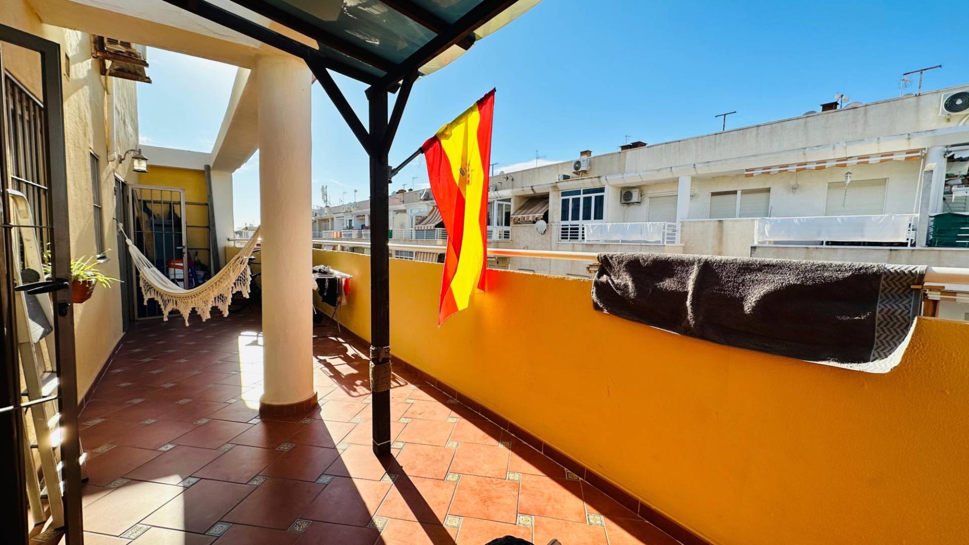 This penthouse is for sale in a prime location in Torrevieja, just 500 meters from Playa del Cura beach. The area boasts excellent amenities: shops, restaurants, public transport, and everything you need for a comfortable and relaxing life, all within easy walking distance. The apartment has a very practical layout, without long hallways, maximizing usable space and natural light. It includes two bedrooms, a spacious living room, a separate kitchen, a bathroom, and a large terrace, which is the property's main advantage. Total: 86 m² Built: 56 m² Terrace: 30 m²The apartment is fully furnished and equipped. Street parking is available. Property Tax (IBI): €235 per yearUtilities: €133.26An excellent option for both personal use and real estate investment thanks to its proximity to the sea and its convenient location.