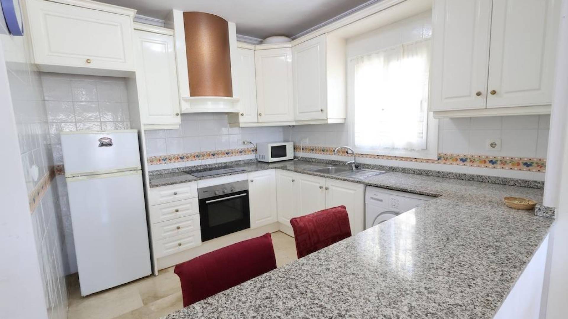 For sale a large two-bedroom, two-bathroom ground floor apartment is for sale. It's organized into a condominium with a swimming pool and lawn, located in the Jumia 2 development in Playa Flamenca. The apartment faces west, with access to the pool from the living room via the terrace and from the bedroom via the terrace. The apartment has 95 square meters of floor space and was built in a building dating back to 2001. The apartment consists of a small entrance hall, a spacious living room with a fully equipped American kitchen, two separate bedrooms with built-in wardrobes, and two full-size bathrooms, one of which is located in the master bedroom. It is sold furnished, with appliances included, and air conditioning in the living room.