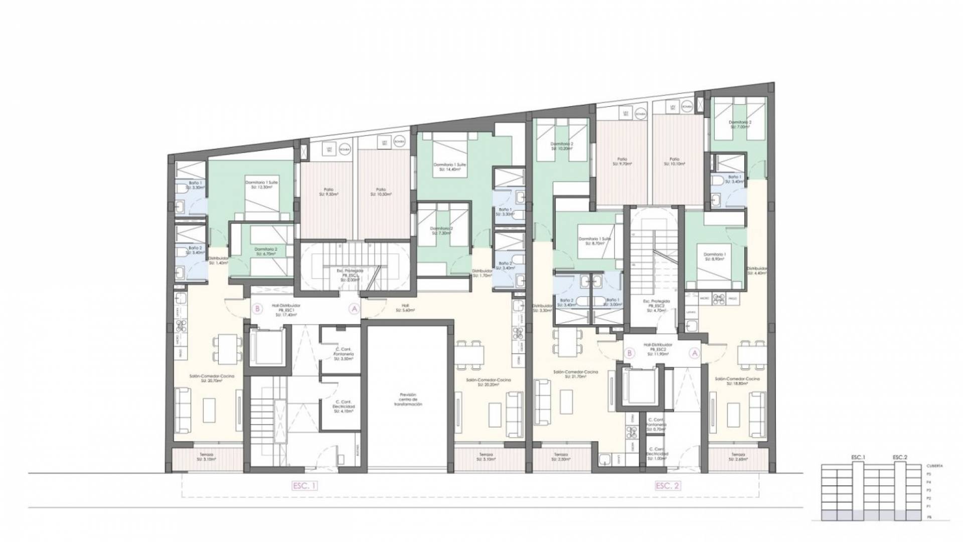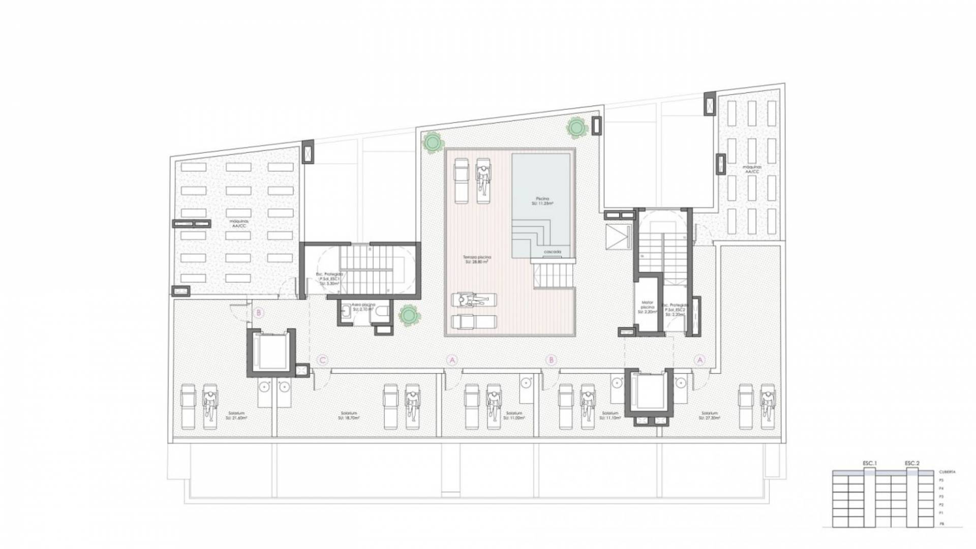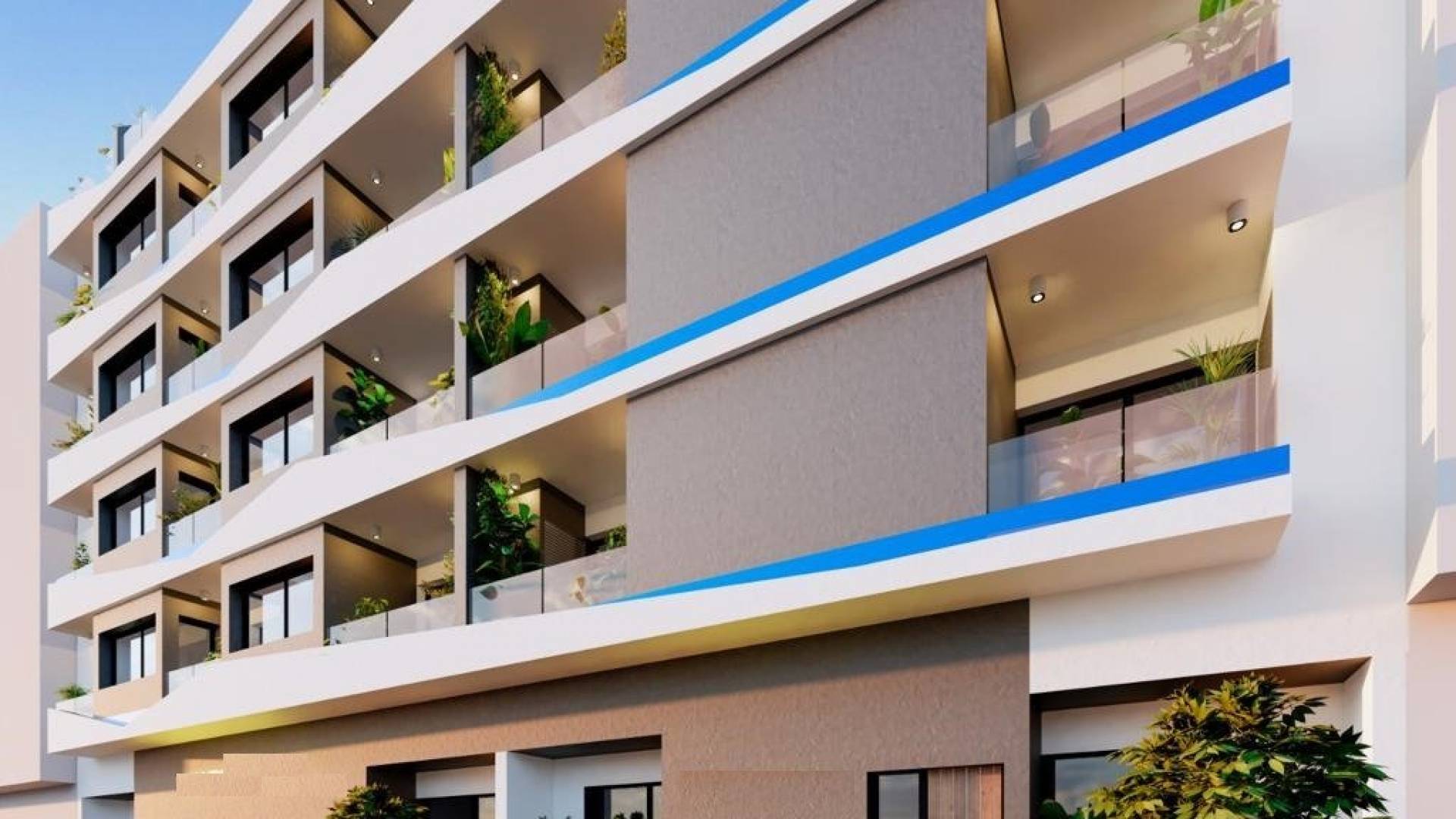 NEW BUILD APARTMENTS AND PENTHOUSES IN TORREVIEJA New Build privileged building just 350 metres from El Cura beach in Torrevieja, offering 29 flats and penthouses with 1 or 2 bedrooms and a rooftop swimming pool. Enjoy the sea views from the rooftop terrace of this modern building, where you will have access to a swimming pool with a waterfall and a relaxation area to unwind and make the most of the sunny days. There is an optional garage space and storage room at an extra cost. The flats are distributed from ground floor to fifth floor. All flats have a cosy terrace that invites the fresh air and sunlight, where you can relax and enjoy the first sip of coffee in the morning. Most of the flats have 2 bedrooms and 2 bathrooms, except one of the penthouses, which has 1 bedroom and 1 bathroom. All feature an open plan design with kitchens integrated into the spacious living/dining areas, as well as bright interiors and glass balustrades. Torrevieja is a Spanish town in the province of Alicante, on the Costa Blanca. It is known for its typically Mediterranean climate and coastline. It has boardwalks with resorts along its sandy beaches. The small Museum of the Sea and Salt houses exhibitions on the fishing and salt history of the city. In the interior, the Lagunas de La Mata-Torrevieja Natural Park has trails and two salty lagoons, one pink and the other green. Alicante airport located 40 minutes away and Murcia airport about 1 hour away.