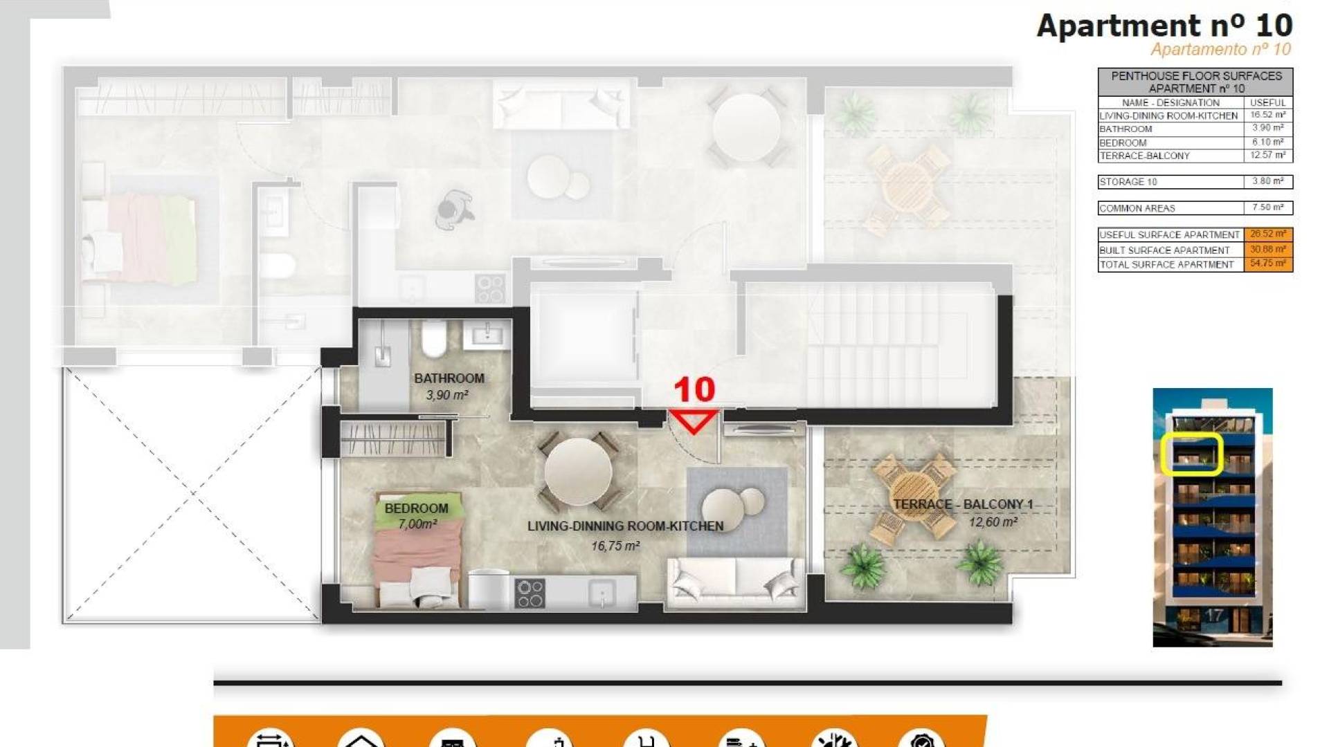 Новые апартаменты в 200 метрах от моря в Торревьехе Современные дома в привилегированном месте Откройте для себя этот новый проект в самом сердце Торревьехи, всего в 200 метрах от пляжа Асексьон, одного из самых популярных в городе. Этот жилой комплекс состоит из 11 квартир, расположенных в тихом районе, идеально подходящем для тех, кто хочет жить рядом с морем, не отказываясь от городских удобств. Расположение комплекса позволяет пешком дойти до центра Торревьехи, парков, ресторанов, супермаркетов и всех необходимых для повседневной жизни услуг. Расстояния до основных объектов: Пляж Асекьон: 0,2 км Центр Торревьехи: 0,7 км Марина Салинас: 1,5 км Университетская больница Торревьехи: 5,5 км Поле для гольфа Villamartín: 10 км Торговый центр Habaneras: 3 км Аэропорт Аликанте: 45 км Различные типы квартир для всех потребностей Здание предлагает на выбор студии, апартаменты с 1 и 2 спальнями, а также пентхаусы с просторными частными террасами. Все апартаменты имеют кладовую на первом этаже и доступ к современным общим помещениям, которые повышают уровень комфорта и стиля жизни. Общие помещения для благополучия и удовольствия Крыша здания была спроектирована как премиальное общественное пространство с: Бассейн Солярий Сауна Зона для барбекю Идеально подходит для наслаждения средиземноморским климатом Торревьехи круглый год. Высококачественные материалы в каждой квартире Квартиры построены из материалов высшего качества и имеют современный дизайн: Наружная столярная продукция из ПВХ с двойным остеклением Guardian Sun Моторизованные жалюзи с теплоизоляцией Бронированная входная дверь с замком безопасности Кухня, оборудованная высокими и низкими шкафами и встроенной бытовой техникой: стеклокерамическая плита, духовка, микроволновая печь, вытяжка и посудомоечная машина Горячее водоснабжение с помощью аэротермической системы Полностью установленный кондиционер Светодиодное освещение Лифт в здании Живите в шаге от моря и центра города Торревьеха - один из самых динамичных и быстрорастущих прибрежных городов Коста-Бланка, известный своим климатом, пляжами, соляными каньонами и культурной жизнью. Этот комплекс идеально подходит как для постоянного проживания, так и для инвестиций или в качестве второго дома для отдыха. Свяжитесь с нами сегодня для получения дополнительной информации или для организации посещения и обеспечьте себе жилье у моря в Торревьехе.