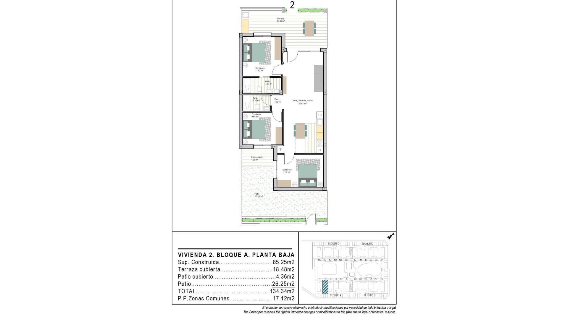 Современные новые апартаменты в Сан-Каэтано, Торрепачеко, Мурсия Современная жизнь в спокойной средиземноморской обстановке Этот эксклюзивный новый жилой комплекс расположен в Сан-Каэтано, Мурсия, входящем в состав муниципалитета Торре-Пачеко, всего в 9 км от моря и в окружении нескольких известных полей для гольфа. Проект сочетает в себе спокойствие, комфорт и современный дизайн, предлагая идеальную среду для постоянного проживания, отдыха или инвестиций на побережье Коста-Калида. Комплекс состоит из 72 квартир с 2 и 3 спальнями и 2 ванными комнатами, одна из которых примыкает к спальне, распределенных по четырем современным зданиям. Также запланирована вторая фаза строительства с бунгало и виллами, что добавит еще больше ценности и привлекательности этому району. Специально спроектированные общие зоны для отдыха и хорошего самочувствия Жители смогут наслаждаться тщательно благоустроенными общими зонами, которые включают два бассейна, красивые сады и полностью оборудованный тренажерный зал. Эти зоны создают приятную и социальную среду, где соседи могут расслабиться, позаниматься спортом и насладиться средиземноморским образом жизни. Жилой комплекс также оснащен фотоэлектрическими солнечными панелями мощностью 40 кВт, которые помогают покрыть расходы сообщества на электроэнергию, способствуя созданию более устойчивой и энергоэффективной среды проживания. Квартиры с частными открытыми пространствами и солярием Каждая квартира спроектирована так, чтобы максимально использовать преимущества жизни на открытом воздухе. Квартиры на первом этаже имеют частные сады, квартиры на втором этаже — просторные террасы, а квартиры на верхнем этаже — террасы и частные солярии на крыше. Все квартиры имеют летнюю кухню на террасе или солярии, идеально подходящую для наслаждения солнцем круглый год. Все дома имеют открытое парковочное место и частное помещение для хранения вещей в подвале, что добавляет дополнительного удобства и практичности. Качественные характеристики и энергоэффективные установки Эти новостройки сдаются с качественной отделкой и современными установками, обеспечивающими комфорт и функциональность, в том числе: Полностью оборудованная кухня с бытовой техникой Полностью оборудованные ванные комнаты с мебелью, зеркалами, освещением и душевыми перегородками Предварительная установка для канального кондиционирования Аэротермальная система для горячей воды Сочетание современных материалов и энергоэффективных систем делает эти дома идеальными для круглогодичного проживания. Отличное расположение рядом с гольф-полями, пляжами и инфраструктурой Сан-Каетано — тихий и хорошо связанный с инфраструктурой поселок с местными удобствами, магазинами и услугами. Его стратегическое расположение позволяет легко добраться до пляжей, гольф-полей и основных транспортных узлов. Ключевые расстояния до достопримечательностей: Пляжи Мар-Менор — 9 км Рода-Гольф — 6 км Гольф-клуб La Serena — 14 км Лос-Алькасарес — 10 км Картахена — 30 км Аэропорт Мурсия-Корвера — 25 км Аэропорт Аликанте — 90 км Забронируйте свою недвижимость в Сан-Каетано сегодня Этот современный жилой комплекс предлагает отличную возможность насладиться средиземноморским образом жизни в тихом, но хорошо связанном с транспортной инфраструктурой рай