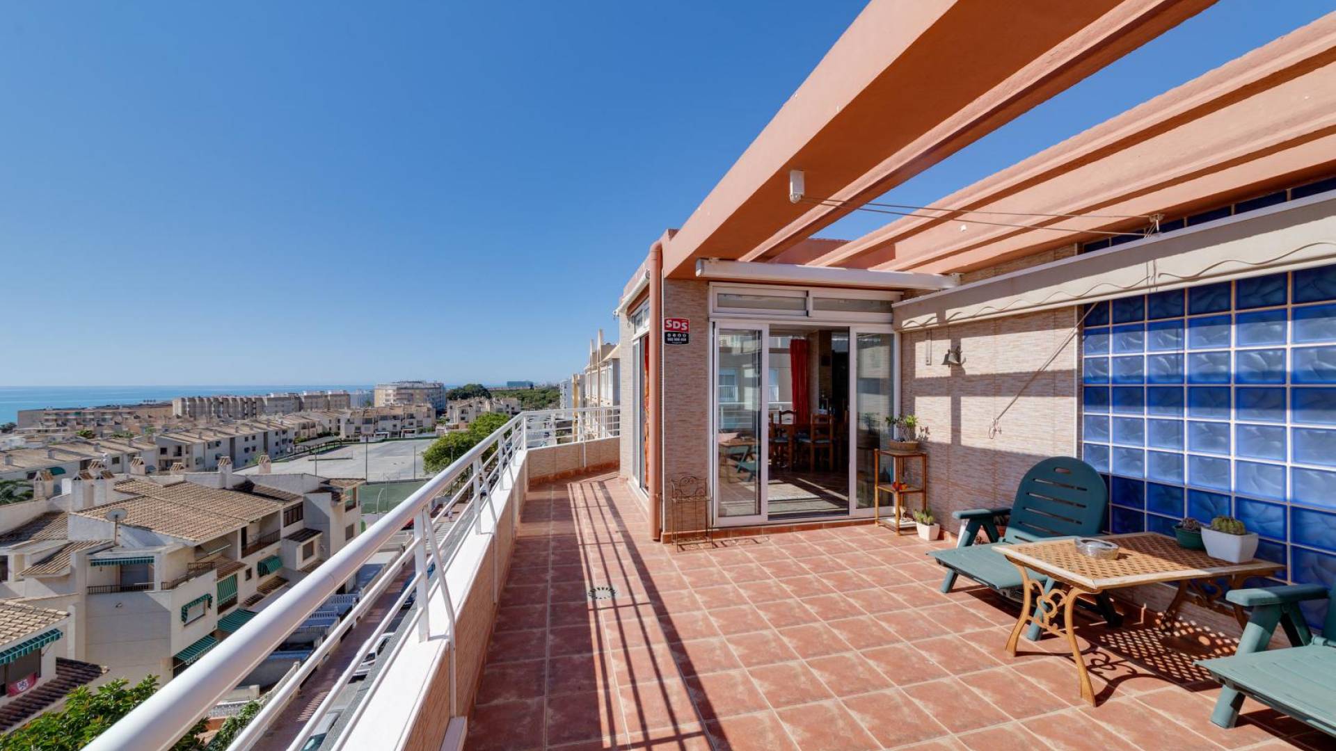 Продается квартира на последнем этаже дома в городе Гуардамар. Площадь квартиры составляет 142 м2. На первом этаже квартиры находятся две спальни, ванная комната, просторная гостиная, отдельная кухня, в которой оборудован лифт для подъема продуктов или готовых блюд на второй этаж (террасу). Изо всех комнат открывается вид на море. По лестнице можно подняться на второй этаж, где находится зона отдыха на застекленной части террасы, там же установлен камин. С открытой части террасы также открывается потрясающий вид на море, там установлены лежаки для принятия солнечных ванн.В квартире проведено газовое отопление. Владельцы квартиры имеют в собственности гараж на подземной парковке, который можно приобрести за дополнительную плату, по желанию покупателя. Покупая недвижимость в Испании, можно оформить вид на жительство. Наша компания помогает оформить ВНЖ любого типа!