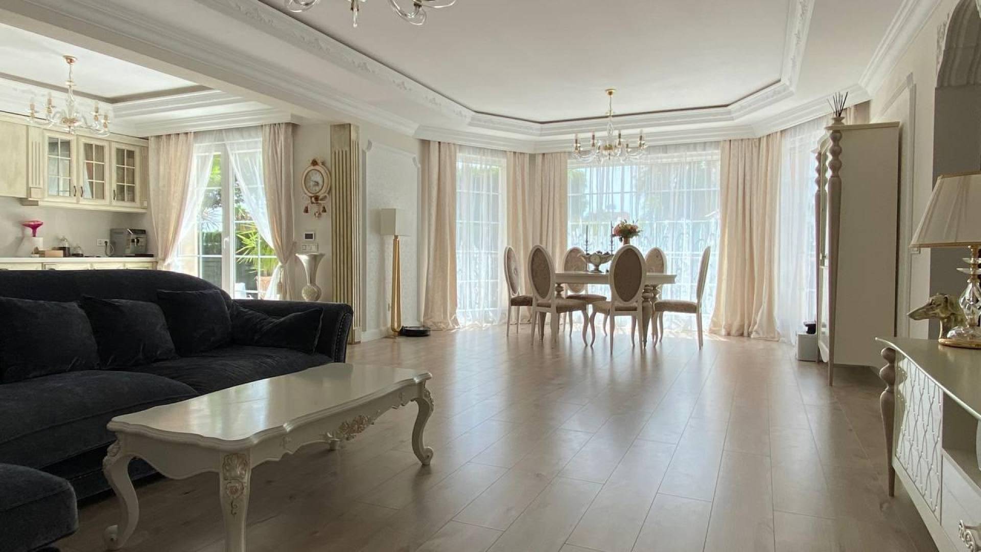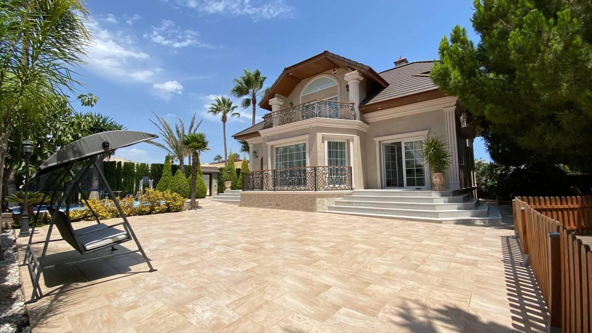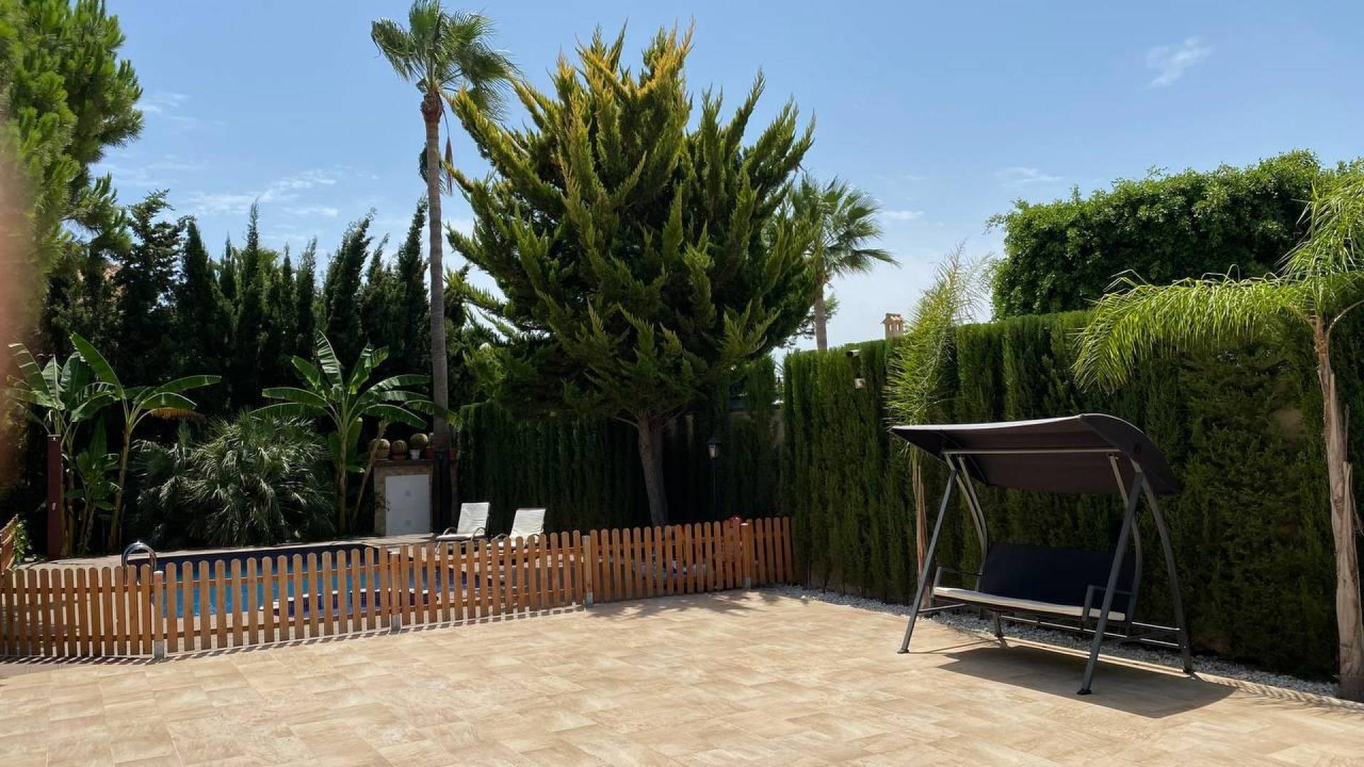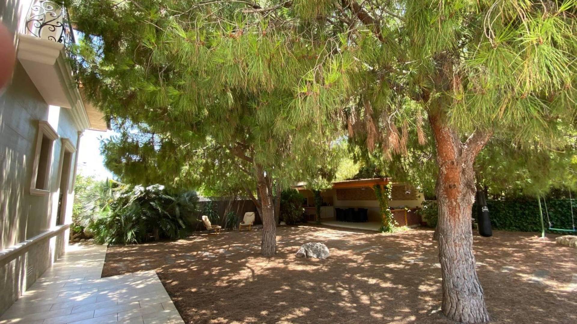 Этот впечатляющий дом в Сьюдад-Кесада, расположенный в спокойном районе, теперь доступен для продажи и предлагает комфортное и элегантное проживание. Первоначально построенный на участке площадью 878 м², с жилой площадью 313 м², этот объект был отремонтирован в 2017 году, сочетая современные удобства с очаровательным благоустроенным садом. При входе вас встречает пышный сад, окружённый деревьями, которые создают приватность и атмосферу уюта. Справа от входа находится уютная зона отдыха, идеально подходящая для расслабления в тени в солнечные дни. В центре участка расположен ухоженный бассейн, идеально подходящий для освежающих купаний в летнюю жару. Слева от бассейна находится сад с большими деревьями и гамаком, который приглашает к отдыху. Кроме того, на участке имеется современная летняя кухня с обеденной зоной, барбекю, раковиной и электрическими розетками — идеальное место для ужинов на свежем воздухе с семьёй и друзьями. При входе в дом вас встречает практичная прихожая с встроенным шкафом, предоставляющим достаточно места для хранения одежды и обуви. Прямо напротив расположена уютная гостевая спальня с двуспальной кроватью. Справа находится просторная гостиная с открытой кухней, которая является сердцем дома. Это светлое помещение включает в себя большой обеденный стол и современную кухню с высококлассной техникой и просторными рабочими поверхностями, идеально подходящими для готовки и общения. Из этой главной зоны можно попасть во вторую спальню, которая в настоящее время используется как детская игровая комната, и в современную ванную комнату с душевой кабиной. Кроме того, из гостиной есть выход в гараж и кладовую под лестницей, ведущей на второй этаж. На втором этаже находятся дополнительные функциональные помещения. Слева расположены две спальни, которые делят между собой ванную комнату с душем; одна из них используется как тренажёрный зал, а другая как детская комната с французским балконом. На противоположной стороне этажа находится главная спальня с гардеробной, просторной ванной комнатой с ванной и душем, а также большим частным балконом — идеальное место для отдыха. Дом оснащён системой отопления полов, центральным кондиционированием воздуха и подготовкой для установки камина, что обеспечивает комфорт в любое время года. Все окна имеют двойное остекление и оборудованы электрическими жалюзи для улучшенной изоляции и безопасности. Эта недвижимость представляет собой идеальное сочетание современного дизайна и спокойной природной атмосферы — идеально подходит для тех, кто ищет комфорт, приватность и высокий уровень жизни.