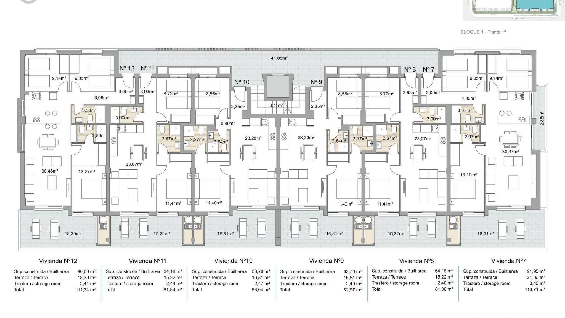 NYBYGGT BOSTADSOMRÅDE I PILAR DE LA HORADADA Nybyggt bostadsområde med lägenheter och takvåningar med exceptionell finish i Pilar de la Horadada. Lägenheter på bottenvåningen med privata trädgårdar, lägenheter på mellanvåningen med stora terrasser och takvåningar på översta våningen med privata solarium. Köket levereras fullt möblerat och lämnar tillräckligt med utrymme för dig att välja apparater enligt dina önskemål. Endast ädla material har använts, såsom inredningssnickerier helt i trä och yttre Climalit/aluminiumfönster, idealiska både för sin design och för den höga termisk-akustiska nivå de har. Alla terrasser vetter mot söder. Automatiska grindar i bostadsområdet, både för fotgängare och fordon. Byggnaden är omgiven av trädgårdar, den kommer också att ha en gemensam pool, parkering inne i komplexet och varje fastighet har sitt eget privata förråd. I närheten av detta bostadsområde hittar du alla faciliteter för kollektivtrafik, skolor, stormarknader, köpcentra, golfbanor och fantastiska kommunala parker med sina lekplatser. Allt vid dina fingertoppar så att du kan njuta av ett utmärkt läge. Pilar de la Horadada är en typisk spansk by i den sydligaste delen av Costa Blanca. Den stora huvudgatan har stormarknader, massor av butiker, restauranger och barer och några härliga torg. De vackra stränderna Torre de la Horadada och Mil Palmeras med strandpromenad med fin sand ligger bara 5 minuter bort. Flygplatserna i Corvera (Murcia) och Alicante ligger 40 respektive 55 minuter bort.