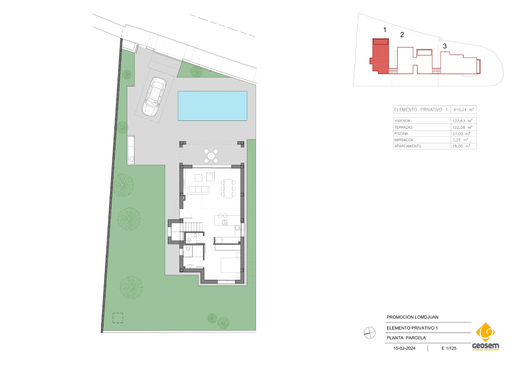 Varje villa har 3 sovrum och 3 kompletta badrum samt en gästtoalett, fördelade på 140 m² byggyta på tomter upp till 425 m². Hemmen inkluderar ett fullt utrustat öppet kök, ljust vardagsrum, inbyggda garderober, installerad luftkonditionering och vitvaror.