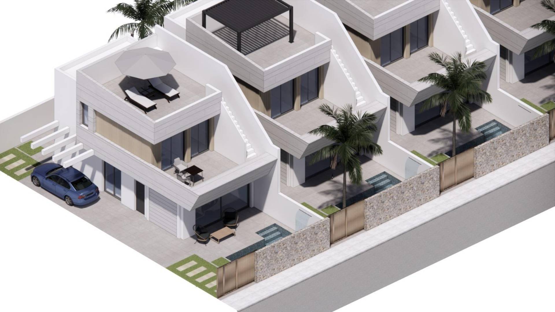 NYBYGGNATION AV VILLOR I SAN JAVIER Nybyggnadsprojekt av fristående villor i San Javier. Nybyggda villor är fördelade på två våningar plus den rymliga takterrassen med vacker utsikt över omgivningen. På bottenvåningen finns ett ljust vardagsrum med kök i öppen planlösning och tillgång till terrassen, ett dubbelrum med inbyggd garderob och ett badrum. På första våningen finns 2 rymliga sovrum, ett med inbyggd garderob och det andra med omklädningsrum och badrum en suite. Privat trädgård med pool och parkeringsplats. San Javier ligger nära alla bekvämligheter med enkel tillgång till stranden, vattensporter, affärer och transportnätet. Här kan du njuta av alla faciliteter som San Javier har att erbjuda, till exempel de lokala butikerna, barerna och restaurangerna, liksom att vara nära köpcentra, flygplatsen i Murcia och alla de vackra platserna som finns längs Mar Menor. Corvera/Murcia flygplats ligger 30 minuter bort och Alicante flygplats ligger 45 minuter bort.