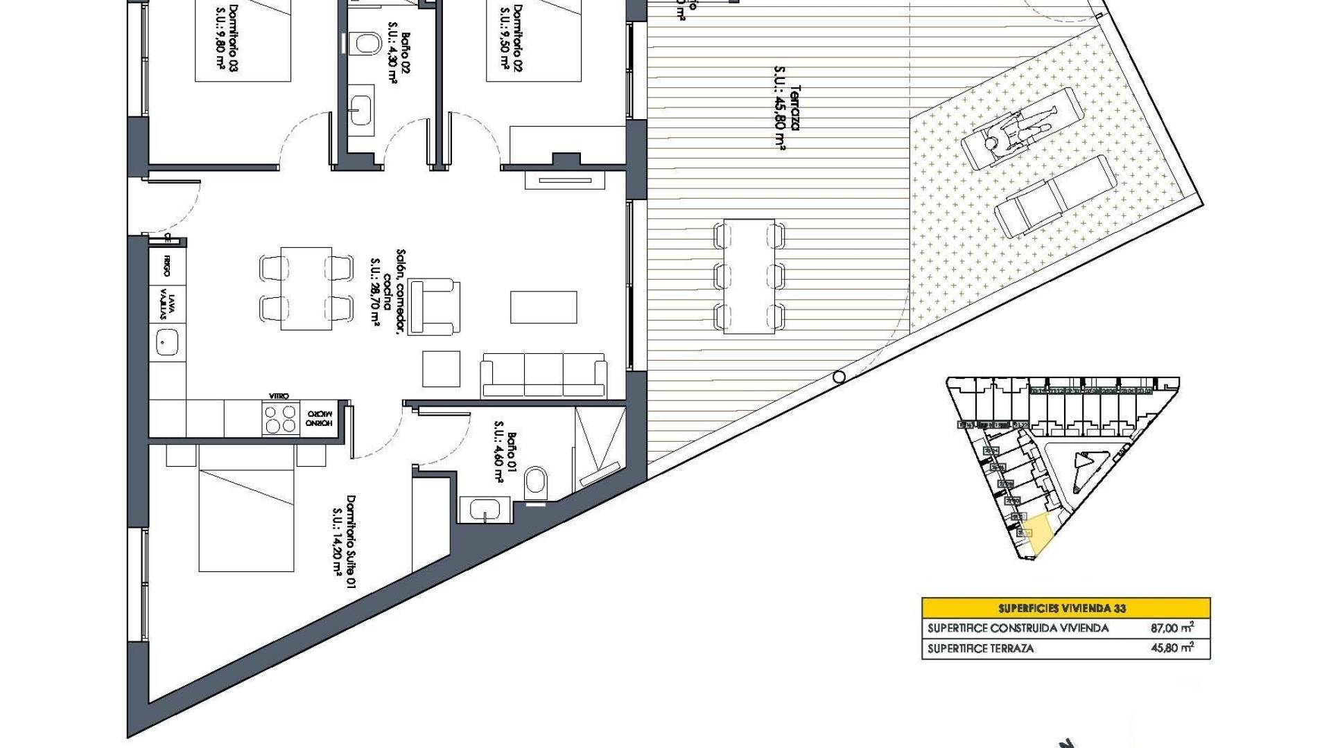 Nybyggt bostadskomplex i San Fulgencio Moderna lägenheter med exceptionella funktioner Upptäck detta nya bostadsområde i San Fulgencio, som erbjuder lägenheter med 2 och 3 sovrum utformade för komfort, stil och bekvämlighet. Komplexet har följande egenskaper: Bottenvåningslägenheter med privata trädgårdar Takvåningar med privata solarier, pergolor, eluttag och vattenposter Till varje fastighet hör en privat parkeringsplats och i anläggningen finns en gemensam pool i medelhavsstil med en 85 m² stor vattenspegel, omgiven av vackert anlagda trädgårdar. Högkvalitativa ytbehandlingar och modern design Dessa bostäder är byggda med förstklassiga material och moderna funktioner för att säkerställa energieffektivitet och en hög levnadsstandard: Elektriska persienner i sovrummen Dubbelglasade utvändiga snickerier med termisk brytningsteknik Fullt utrustade badrum med underskåp, speglar och duschväggar LED-belysning i hela fastigheten Förinstallerad kanaliserad luftkonditionering för klimatkontroll Utmärkt läge nära stränder, golf och bekvämligheter San Fulgencio är en charmig spansk stad med ett urval av restauranger, butiker och viktiga tjänster inom gångavstånd. Dess strategiska läge erbjuder snabb tillgång till några av de bästa attraktionerna på Costa Blanca: Alicante-Elche internationella flygplats - 30 km (30 min) La Marina Beach - 7 km (10 min) Guardamar del Segura - 10 km (12 min) La Marquesa Golf Course (Ciudad Quesada) - 6 km (8 min) Torrevieja centrum - 18 km (20 min) Köpcentra, restauranger och fritidsalternativ - inom en kort bilresa Det perfekta hemmet för kustliv Denna nya utveckling i San Fulgencio är perfekt för dem som letar efter ett modernt fritidshus, en investeringsfastighet eller en permanent bostad på Costa Blanca. Med sitt utmärkta läge nära stranden, golfbanor och viktiga tjänster erbjuder det en lugn men ändå väl ansluten livsstil. Missa inte chansen att äga ett helt nytt hem i San Fulgencio. Kontakta oss idag för mer information eller för att boka ett besök!